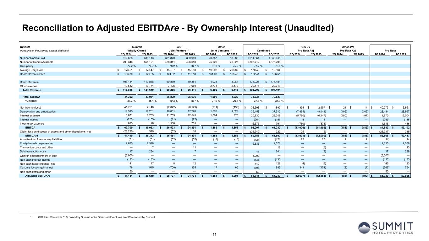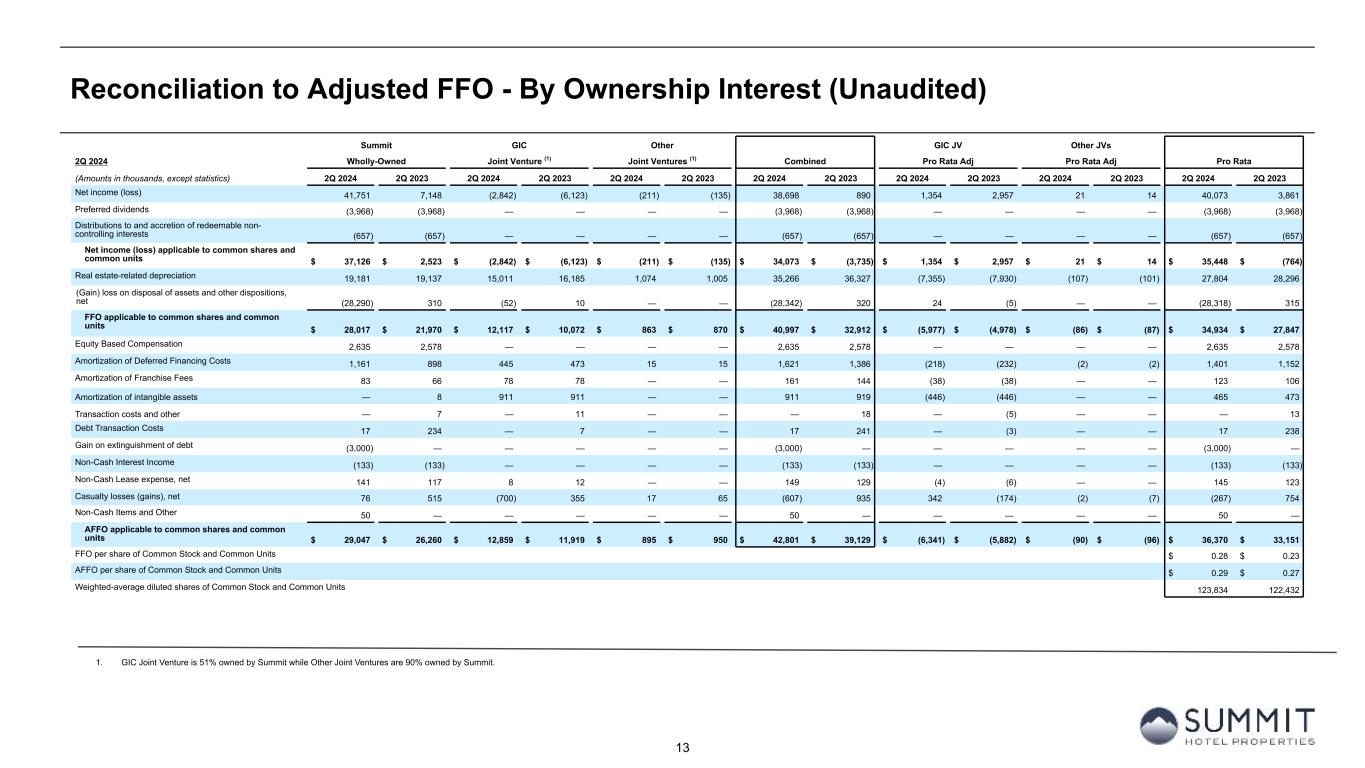 12 Reconciliation to Adjusted EBITDAre - By Ownership Interest (Unaudited) 1. Non-cash interest income relates to the amortization of the discount on certain notes receivable. The discount on these notes receivable was recorded at inception of the related loans based on the estimated value of the embedded purchase options in the notes receivable. 2. GIC Joint Venture is 51% owned by Summit while Other Joint Ventures are 90% owned by Summit. YTD 2024 Summit GIC Other GIC JV Other JVs (Amounts in thousands, except statistics) Wholly-Owned Joint Venture (2) Joint Ventures (2) Combined Pro Rata Adj Pro Rata Adj Pro Rata YTD 2024 YTD 2023 YTD 2024 YTD 2023 YTD 2024 YTD 2023 YTD 2024 YTD 2023 YTD 2024 YTD 2023 YTD 2024 YTD 2023 YTD 2024 YTD 2023 Number Rooms Sold 1,179,616 1,216,063 762,837 732,892 41,890 40,304 1,984,343 1,989,259 Number of Rooms Available 1,617,442 1,723,171 990,370 983,910 50,050 49,775 2,657,862 2,756,856 Occupancy 72.9 % 70.6 % 77.0 % 74.5 % 83.7 % 81.0 % 74.7 % 72.2 % Average Daily Rate $ 173.21 $ 170.89 $ 165.34 $ 163.52 $ 239.01 $ 238.46 $ 171.57 $ 169.55 Room Revenue PAR $ 126.32 $ 120.60 $ 127.35 $ 121.81 $ 200.04 $ 193.09 $ 128.09 $ 122.34 Room Revenue 204,320 207,813 126,124 119,846 10,012 9,611 340,456 $ 337,270 Other revenue 20,549 20,376 15,268 14,036 5,772 5,195 41,589 39,607 Total Revenue $ 224,869 $ 228,189 $ 141,392 $ 133,882 $ 15,784 $ 14,806 $ 382,045 $ 376,877 Hotel EBITDA 78,594 74,898 57,490 53,257 5,468 5,340 141,552 133,495 % margin 35.0 % 32.8 % 40.7 % 39.8 % 34.6 % 36.1 % 37.1 % 35.4 % Net income (loss) 41,764 5,657 (1,930) (8,058) 1,697 1,321 $ 41,531 $ (1,080) $ 907 $ 3,783 $ (170) $ (132) $ 42,268 $ 2,571 Depreciation and amortization 38,605 38,455 32,477 33,923 2,175 2,040 73,257 74,418 (15,914) (16,622) (218) (204) 57,125 57,592 Interest expense 16,658 16,989 23,746 24,293 2,008 1,875 42,412 43,157 (11,636) (11,904) (201) (188) 30,575 31,065 Interest income (402) (211) (19) (29) — — (421) (240) 9 14 — — (412) (226) Income tax expense 850 26 1,742 293 — — 2,592 319 (854) (144) — — 1,738 175 EBITDA $ 97,475 $ 60,916 $ 56,016 $ 50,422 $ 5,880 $ 5,236 $ 159,371 $ 116,574 $ (27,488) $ (24,873) $ (589) $ (524) $ 131,294 $ 91,177 (Gain) loss on disposal of assets and other dispositions, net (28,290) 336 (127) 32 — — (28,417) 368 62 (16) — — (28,355) 352 EBITDAre $ 69,185 $ 61,252 $ 55,889 $ 50,454 $ 5,880 $ 5,236 $ 130,954 $ 116,942 $ (27,426) $ (24,889) $ (589) $ (524) $ 102,939 $ 91,529 Recoveries of credit losses — (250) — — — — — (250) — — — — — (250) Amortization of key money liabilities (103) (118) (103) (103) (36) (36) (242) (257) 50 50 4 4 (188) (203) Equity-based compensation 4,483 4,046 — — — — 4,483 4,046 — — — — 4,483 4,046 Transaction costs and other — 13 — 11 — — — 24 — (5) — — — 19 Debt transaction costs 567 269 14 59 — — 581 328 (7) (29) — — 574 299 Gain on extinguishment of debt (3,000) — — — — — (3,000) — — — — — (3,000) — Non-cash interest income (1) (266) (263) — — — — (266) (263) — — — — (266) (263) Non-cash lease expense, net 244 238 (22) 24 — — 222 262 11 (12) — — 233 250 Casualty losses (gains), net 386 820 (863) 556 (404) 95 (881) 1,471 425 (270) 40 (10) (416) 1,191 Non-cash items and other 362 705 — — — — 362 705 — — — — 362 705 Adjusted EBITDAre $ 71,858 $ 66,712 $ 54,915 $ 51,001 $ 5,440 $ 5,295 $ 132,213 $ 123,008 $ (26,947) $ (25,155) $ (545) $ (530) $ 104,721 $ 97,323