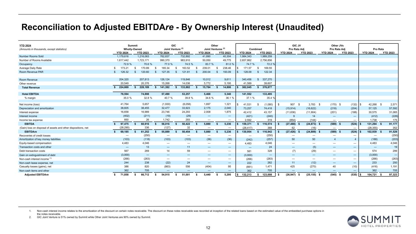 11 Reconciliation to Adjusted EBITDAre - By Ownership Interest (Unaudited) 1. GIC Joint Venture is 51% owned by Summit while Other Joint Ventures are 90% owned by Summit. Q2 2024 Summit GIC Other GIC JV Other JVs (Amounts in thousands, except statistics) Wholly-Owned Joint Venture (1) Joint Ventures (1) Combined Pro Rata Adj Pro Rata Adj Pro Rata 2Q 2024 2Q 2023 2Q 2024 2Q 2023 2Q 2024 2Q 2023 2Q 2024 2Q 2023 2Q 2024 2Q 2023 2Q 2024 2Q 2023 2Q 2024 2Q 2023 Number Rooms Sold 612,628 639,113 381,879 380,949 20,357 18,983 1,014,864 1,039,045 Number of Rooms Available 793,346 855,121 488,341 496,650 25,025 25,025 1,306,712 1,376,796 Occupancy 77.2 % 74.7 % 78.2 % 76.7 % 81.3 % 75.9 % 77.7 % 75.5 % Average Daily Rate $ 176.51 $ 173.47 $ 159.37 $ 155.80 $ 198.02 $ 208.82 $ 170.49 $ 167.64 Room Revenue PAR $ 136.30 $ 129.65 $ 124.62 $ 119.50 $ 161.08 $ 158.40 $ 132.41 $ 126.51 Room Revenue 108,134 110,866 60,860 59,351 4,031 3,964 173,025 $ 174,181 Other revenue 10,682 10,774 7,425 7,060 2,771 2,479 20,878 20,313 Total Revenue $ 118,816 $ 121,640 $ 68,285 $ 66,411 $ 6,802 $ 6,443 $ 193,903 $ 194,494 Hotel EBITDA 44,302 43,031 26,829 25,676 1,900 1,922 73,031 70,629 % margin 37.3 % 35.4 % 39.3 % 38.7 % 27.9 % 29.8 % 37.7 % 36.3 % Net income (loss) 41,751 7,148 (2,842) (6,123) (211) (135) $ 38,698 $ 890 $ 1,354 $ 2,957 $ 21 $ 14 $ 40,073 $ 3,861 Depreciation and amortization 19,315 19,261 16,051 17,226 1,092 1,023 36,458 37,510 (7,865) (8,441) (109) (102) 28,484 28,967 Interest expense 8,071 8,733 11,755 12,545 1,004 970 20,830 22,248 (5,760) (6,147) (100) (97) 14,970 16,004 Interest income (253) (135) (11) (22) — — (264) (157) 5 11 — — (259) (146) Income tax expense 825 26 1,550 765 — — 2,375 791 (760) (375) — — 1,615 416 EBITDA $ 69,709 $ 35,033 $ 26,503 $ 24,391 $ 1,885 $ 1,858 $ 98,097 $ 61,282 $ (13,026) $ (11,995) $ (188) $ (185) $ 84,883 $ 49,102 (Gain) loss on disposal of assets and other dispositions, net (28,290) 310 (52) 10 — — (28,342) 320 25 (5) — — (28,317) 315 EBITDAre $ 41,419 $ 35,343 $ 26,451 $ 24,401 $ 1,885 $ 1,858 $ 69,755 $ 61,602 $ (13,001) $ (12,000) $ (188) $ (185) $ 56,566 $ 49,417 Amortization of key money liabilities (51) (51) (52) (52) (18) (18) (121) (121) 25 25 2 2 (94) (94) Equity-based compensation 2,635 2,578 — — — — 2,635 2,578 — — — — 2,635 2,578 Transaction costs and other — 7 — 11 — — — 18 — (5) — — — 13 Debt transaction costs 17 234 — 7 — — 17 241 — (3) — — 17 238 Gain on extinguishment of debt (3,000) — — — — — (3,000) — — — — — (3,000) — Non-cash interest income (133) (133) — — — — (133) (133) — — — — (133) (133) Non-cash lease expense, net 141 117 8 12 — — 149 129 (4) (6) — — 145 123 Casualty losses (gains), net 76 515 (700) 355 17 65 (607) 935 343 (174) (2) (7) (266) 754 Non-cash items and other 50 — — — — — 50 — — — — — 50 — Adjusted EBITDAre $ 41,154 $ 38,610 $ 25,707 $ 24,734 $ 1,884 $ 1,905 $ 68,745 $ 65,249 $ (12,637) $ (12,163) $ (188) $ (190) $ 55,920 $ 52,896