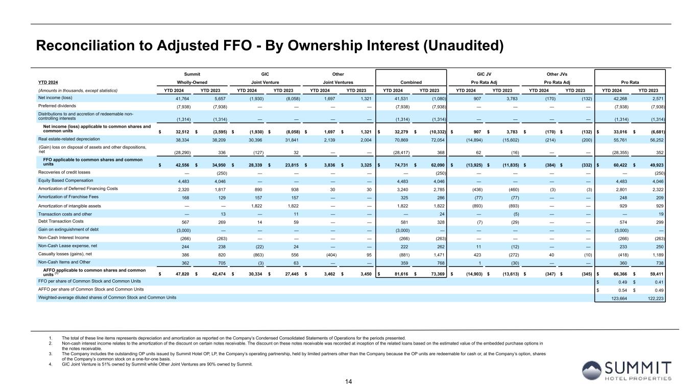 13 Reconciliation to Adjusted FFO - By Ownership Interest (Unaudited) 1. GIC Joint Venture is 51% owned by Summit while Other Joint Ventures are 90% owned by Summit. Summit GIC Other GIC JV Other JVs 2Q 2024 Wholly-Owned Joint Venture (1) Joint Ventures (1) Combined Pro Rata Adj Pro Rata Adj Pro Rata (Amounts in thousands, except statistics) 2Q 2024 2Q 2023 2Q 2024 2Q 2023 2Q 2024 2Q 2023 2Q 2024 2Q 2023 2Q 2024 2Q 2023 2Q 2024 2Q 2023 2Q 2024 2Q 2023 Net income (loss) 41,751 7,148 (2,842) (6,123) (211) (135) 38,698 890 1,354 2,957 21 14 40,073 3,861 Preferred dividends (3,968) (3,968) — — — — (3,968) (3,968) — — — — (3,968) (3,968) Distributions to and accretion of redeemable non- controlling interests (657) (657) — — — — (657) (657) — — — — (657) (657) Net income (loss) applicable to common shares and common units $ 37,126 $ 2,523 $ (2,842) $ (6,123) $ (211) $ (135) $ 34,073 $ (3,735) $ 1,354 $ 2,957 $ 21 $ 14 $ 35,448 $ (764) Real estate-related depreciation 19,181 19,137 15,011 16,185 1,074 1,005 35,266 36,327 (7,355) (7,930) (107) (101) 27,804 28,296 (Gain) loss on disposal of assets and other dispositions, net (28,290) 310 (52) 10 — — (28,342) 320 24 (5) — — (28,318) 315 FFO applicable to common shares and common units $ 28,017 $ 21,970 $ 12,117 $ 10,072 $ 863 $ 870 $ 40,997 $ 32,912 $ (5,977) $ (4,978) $ (86) $ (87) $ 34,934 $ 27,847 Equity Based Compensation 2,635 2,578 — — — — 2,635 2,578 — — — — 2,635 2,578 Amortization of Deferred Financing Costs 1,161 898 445 473 15 15 1,621 1,386 (218) (232) (2) (2) 1,401 1,152 Amortization of Franchise Fees 83 66 78 78 — — 161 144 (38) (38) — — 123 106 Amortization of intangible assets — 8 911 911 — — 911 919 (446) (446) — — 465 473 Transaction costs and other — 7 — 11 — — — 18 — (5) — — — 13 Debt Transaction Costs 17 234 — 7 — — 17 241 — (3) — — 17 238 Gain on extinguishment of debt (3,000) — — — — — (3,000) — — — — — (3,000) — Non-Cash Interest Income (133) (133) — — — — (133) (133) — — — — (133) (133) Non-Cash Lease expense, net 141 117 8 12 — — 149 129 (4) (6) — — 145 123 Casualty losses (gains), net 76 515 (700) 355 17 65 (607) 935 342 (174) (2) (7) (267) 754 Non-Cash Items and Other 50 — — — — — 50 — — — — — 50 — AFFO applicable to common shares and common units $ 29,047 $ 26,260 $ 12,859 1 2 8 $ 11,919 $ 895 $ 950 $ 42,801 $ 39,129 $ (6,341) $ (5,882) $ (90) $ (96) $ 36,370 $ 33,151 FFO per share of Common Stock and Common Units $ 0.28 $ 0.23 AFFO per share of Common Stock and Common Units $ 0.29 $ 0.27 Weighted-average diluted shares of Common Stock and Common Units 123,834 122,432