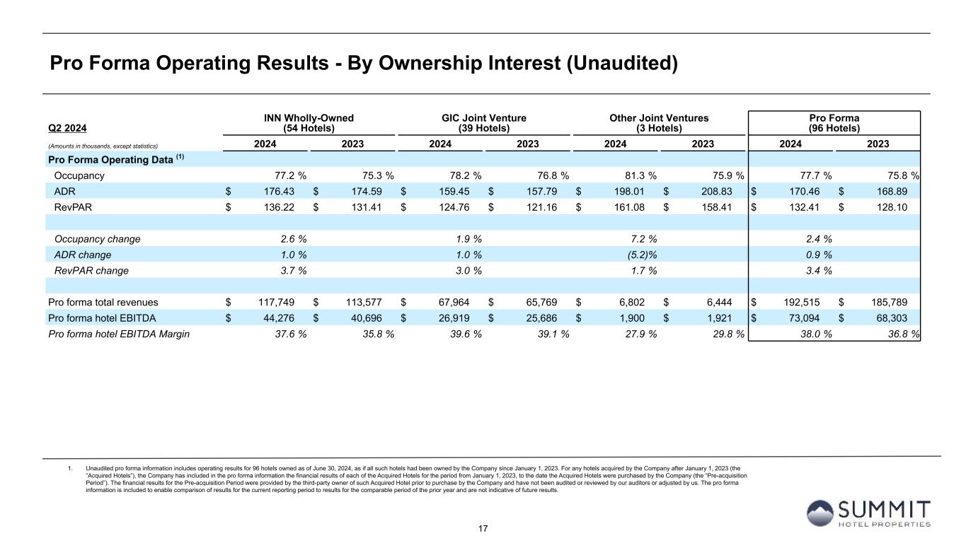 17 Pro Forma Operating Results - By Ownership Interest (Unaudited) 1. Unaudited pro forma information includes operating results for 96 hotels owned as of June 30, 2024, as if all such hotels had been owned by the Company since January 1, 2023. For any hotels acquired by the Company after January 1, 2023 (the “Acquired Hotels”), the Company has included in the pro forma information the financial results of each of the Acquired Hotels for the period from January 1, 2023, to the date the Acquired Hotels were purchased by the Company (the “Pre-acquisition Period”). The financial results for the Pre-acquisition Period were provided by the third-party owner of such Acquired Hotel prior to purchase by the Company and have not been audited or reviewed by our auditors or adjusted by us. The pro forma information is included to enable comparison of results for the current reporting period to results for the comparable period of the prior year and are not indicative of future results. Q2 2024 INN Wholly-Owned (54 Hotels) GIC Joint Venture (39 Hotels) Other Joint Ventures (3 Hotels) Pro Forma (96 Hotels) (Amounts in thousands, except statistics) 2024 2023 2024 2023 2024 2023 2024 2023 Pro Forma Operating Data (1) Occupancy 77.2 % 75.3 % 78.2 % 76.8 % 81.3 % 75.9 % 77.7 % 75.8 % ADR $ 176.43 $ 174.59 $ 159.45 $ 157.79 $ 198.01 $ 208.83 $ 170.46 $ 168.89 RevPAR $ 136.22 $ 131.41 $ 124.76 $ 121.16 $ 161.08 $ 158.41 $ 132.41 $ 128.10 Occupancy change 2.6 % 1.9 % 7.2 % 2.4 % ADR change 1.0 % 1.0 % (5.2) % 0.9 % RevPAR change 3.7 % 3.0 % 1.7 % 3.4 % Pro forma total revenues $ 117,749 $ 113,577 $ 67,964 $ 65,769 $ 6,802 $ 6,444 $ 192,515 $ 185,789 Pro forma hotel EBITDA $ 44,276 $ 40,696 $ 26,919 $ 25,686 $ 1,900 $ 1,921 $ 73,094 $ 68,303 Pro forma hotel EBITDA Margin 37.6 % 35.8 % 39.6 % 39.1 % 27.9 % 29.8 % 38.0 % 36.8 %