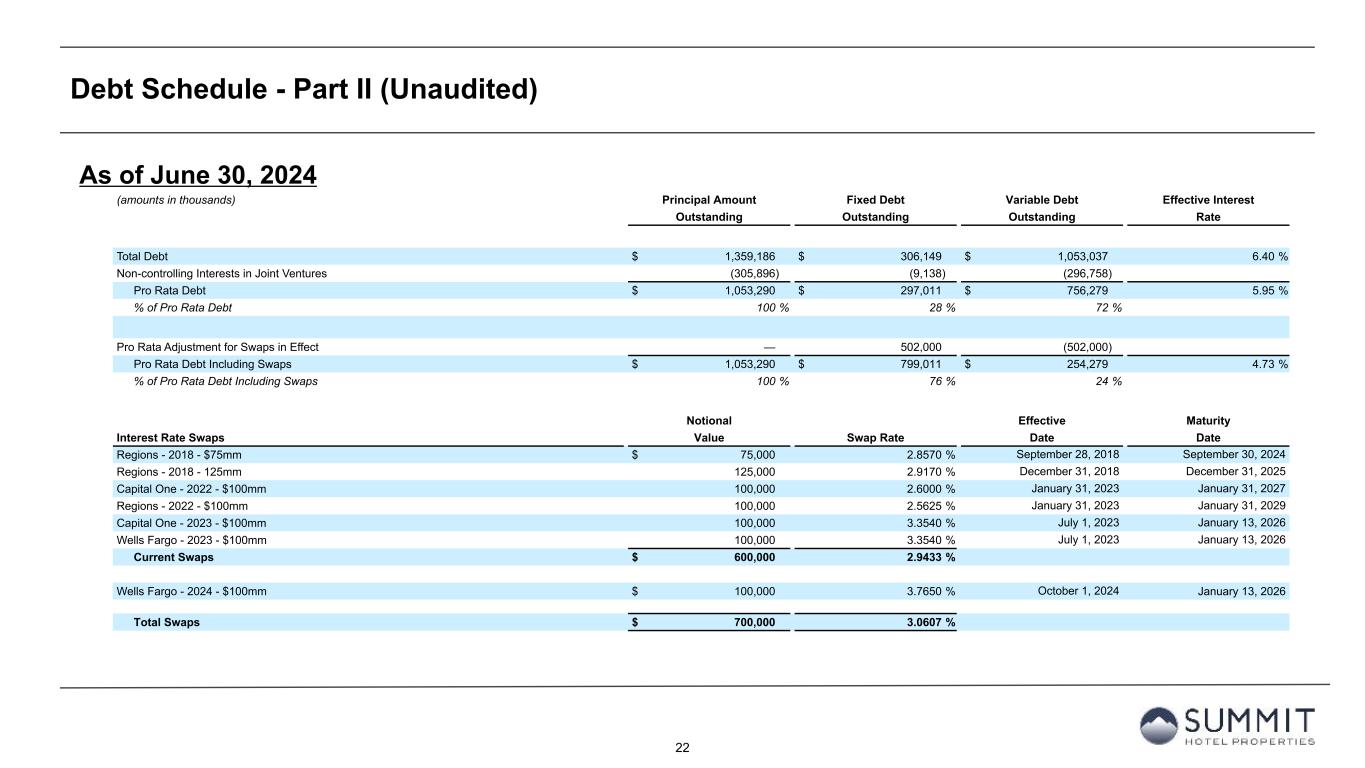 21 As of June 30, 2024 Number of Pro Rata (amounts in thousands) Base Interest Fixed/ Fully-Extended Encumbered Principal Non-controlling Principal Spread Rate Rate Variable Maturity Date Properties Outstanding Interests Outstanding Senior Credit Facility $400 Million Revolver 1.95% 5.43% 7.38% Variable 06/21/2028 n/a 10,000 — 10,000 $200 Million Term Loan 1.90% 5.44% 7.34% Variable 06/21/2028 n/a 200,000 — 200,000 Total Senior Credit and Term Loan Facility $ 210,000 $ — $ 210,000 $200 Million Unsecured Term Loan 1.90% 5.43% 7.33% Variable 02/26/2029 n/a $ 200,000 $ — $ 200,000 Convertible Notes n/a n/a 1.50% Fixed 02/15/2026 n/a $ 287,500 $ — $ 287,500 $ 697,500 $ — $ 697,500 Brickell Joint Venture Mortgage Loan City National Bank of Florida 3.00% 5.29% 8.29% Variable 06/09/2025 2 47,000 (4,700) 42,300 GIC Joint Venture Credit Facility and Term Loans $125 Million Revolver 2.15% 5.44% 7.59% Variable 09/15/2028 n/a 125,000 (61,250) 63,750 $75 Million Term Loan 2.10% 5.44% 7.54% Variable 09/15/2028 n/a 75,000 (36,750) 38,250 $410 Million Term Loan 2.75% 5.46% 8.21% Variable 01/13/2027 n/a 396,037 (194,058) 201,979 Wells Fargo CMBS Loan n/a n/a 4.99% Fixed 06/06/2028 1 12,657 (6,202) 6,455 PACE Loan n/a n/a 6.10% Fixed 07/31/2040 n/a 5,992 (2,936) 3,056 Total GIC Joint Venture Credit Facility and Term Loans 1 $ 614,686 $ (301,196) $ 313,490 Total Joint Venture Debt 3 $ 661,686 $ (305,896) $ 355,790 Total Debt 3 $ 1,359,186 $ (305,896) $ 1,053,290 Debt Schedule - Part I (Unaudited)