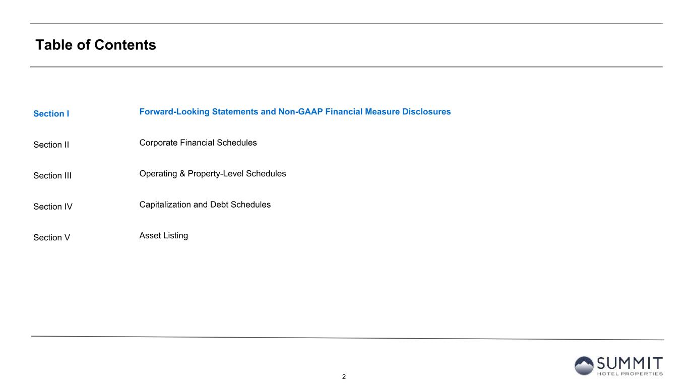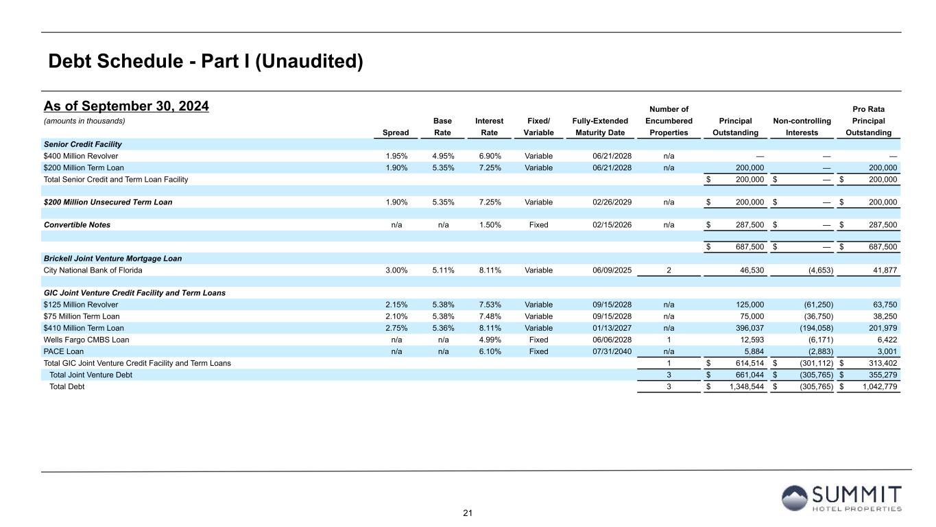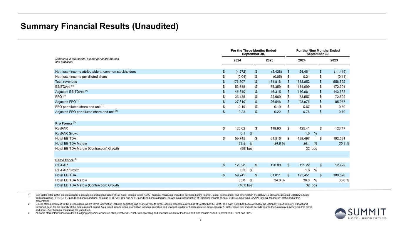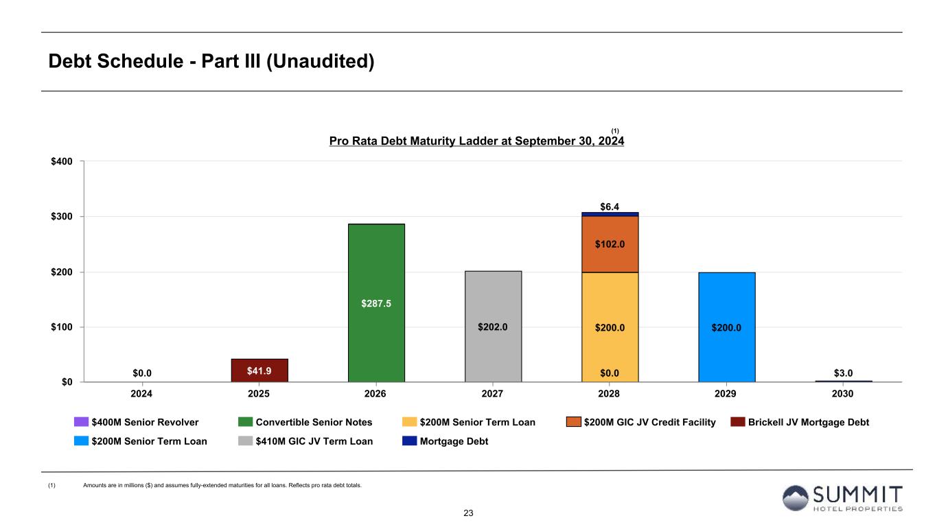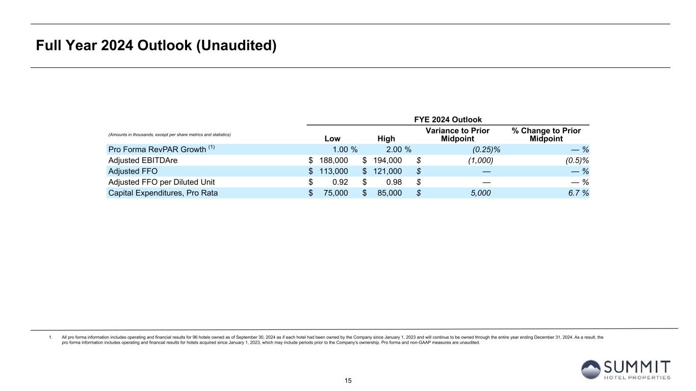 14 Reconciliation to Adjusted FFO - By Ownership Interest (Unaudited) 1. The total of these line items represents depreciation and amortization as reported on the Company’s Condensed Consolidated Statements of Operations for the periods presented. 2. Non-cash interest income relates to the amortization of the discount on certain notes receivable. The discount on these notes receivable was recorded at inception of the related loans based on the estimated value of the embedded purchase options in the notes receivable. 3. The Company includes the outstanding OP units issued by Summit Hotel OP, LP, the Company’s operating partnership, held by limited partners other than the Company because the OP units are redeemable for cash or, at the Company’s option, shares of the Company’s common stock on a one-for-one basis. 4. GIC Joint Venture is 51% owned by Summit while Other Joint Ventures are 90% owned by Summit. Summit GIC Other GIC JV Other JVs YTD 2024 Wholly-Owned Joint Venture Joint Ventures Combined Pro Rata Adj Pro Rata Adj Pro Rata (Amounts in thousands, except statistics) YTD 2024 YTD 2023 YTD 2024 YTD 2023 YTD 2024 YTD 2023 YTD 2024 YTD 2023 YTD 2024 YTD 2023 YTD 2024 YTD 2023 YTD 2024 YTD 2023 Net income (loss) $ 45,996 $ 10,218 $ (8,426) $ (16,910) $ 405 $ (157) $ 37,975 $ (6,849) $ 4,052 $ 8,077 $ (41) $ 16 $ 41,986 $ 1,244 Preferred dividends (11,906) (11,906) — — — — (11,906) (11,906) — — — — (11,906) (11,906) Distributions to and accretion of redeemable non-controlling interests (1,970) (1,970) — — — — (1,970) (1,970) — — — — (1,970) (1,970) Net income (loss) applicable to common shares and common units $ 32,120 $ (3,658) $ (8,426) $ (16,910) $ 405 $ (157) $ 24,099 $ (20,725) $ 4,052 $ 8,077 $ (41) $ 16 $ 28,110 $ (12,632) Real estate-related depreciation 57,520 57,579 45,864 48,140 3,206 3,032 106,590 108,751 (22,473) (23,589) (321) (303) 83,796 84,859 (Gain) loss on disposal of assets and other dispositions, net (28,271) 345 (187) 39 19 — (28,439) 384 92 (19) (2) — (28,349) 365 FFO applicable to common shares and common units $ 61,369 $ 54,266 $ 37,251 $ 31,269 $ 3,630 $ 2,875 $ 102,250 $ 88,410 $ (18,329) $ (15,531) $ (364) $ (287) $ 83,557 $ 72,592 Recoveries of credit losses — (500) — — — — — (500) — — — — — (500) Equity Based Compensation 6,337 5,913 — — — — 6,337 5,913 — — — — 6,337 5,913 Amortization of Deferred Financing Costs 3,481 2,871 1,354 1,463 45 45 4,880 4,379 (663) (717) (5) (5) 4,212 3,657 Amortization of Franchise Fees 258 200 236 239 — — 494 439 (116) (117) — — 378 322 Amortization of intangible assets 1 1 2,519 2,732 — — 2,520 2,733 (1,234) (1,339) — — 1,286 1,394 Transaction costs and other 10 13 — 11 — — 10 24 — (5) — — 10 19 Debt Transaction Costs 627 292 20 126 — — 647 418 (10) (62) — — 637 356 Gain on extinguishment of debt (3,000) — — — — — (3,000) — — — — — (3,000) — Non-Cash Interest Income (400) (397) — — — — (400) (397) — — — — (400) (397) Non-Cash Lease expense, net 348 335 (16) 33 — — 332 368 8 (16) — — 340 352 Casualty losses (gains), net 743 1,071 (984) 671 (396) 109 (637) 1,851 482 (329) 40 (11) (115) 1,511 Non-Cash Items and Other 493 705 470 63 — — 963 768 (229) (30) — — 734 738 AFFO applicable to common shares and common units (1) $ 70,267 $ 64,770 $ 40,850 $ 36,607 $ 3,279 $ 3,029 $ 114,396 $ 104,406 $ (20,091) $ (18,146) $ (329) $ (303) $ 93,976 $ 85,957 FFO per share of Common Stock and Common Units $ 0.67 $ 0.59 AFFO per share of Common Stock and Common Units $ 0.76 $ 0.70 Weighted-average diluted shares of Common Stock and Common Units 124,389 122,312