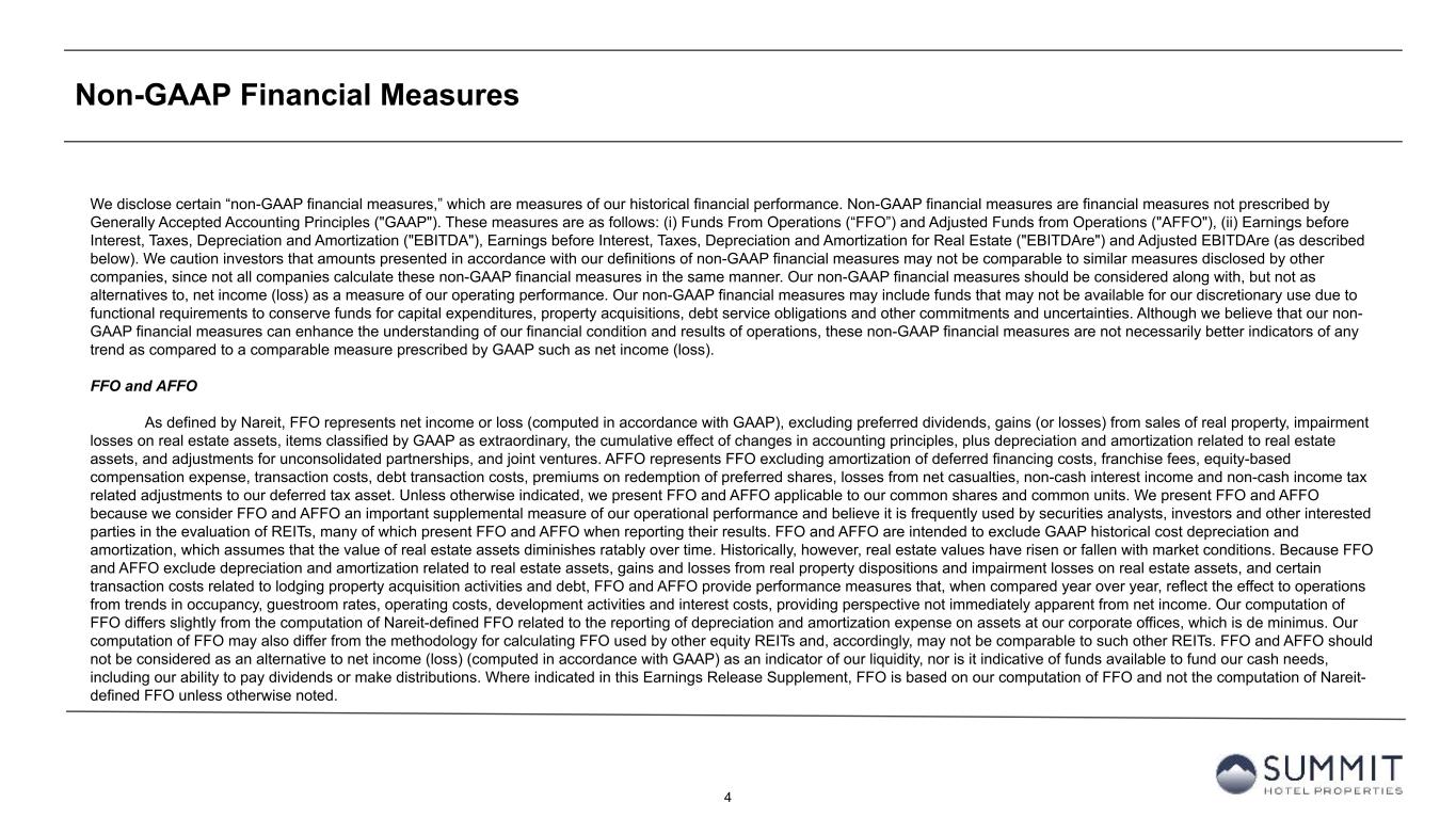 3 Forward-Looking Statements We make forward-looking statements in this presentation that are subject to risks and uncertainties. These forward-looking statements include information about possible or assumed future results of our business, financial condition, liquidity, results of operations, plans, and objectives. When we use the words “believe,” “expect,” “anticipate,” “estimate,” “plan,” “continue,” “intend,” “should,” “may,” or similar expressions, we intend to identify forward-looking statements. Statements regarding the following subjects, among others, may be forward-looking by their nature: • our ability to increase our dividend per share of common stock; • the state of the U.S. economy generally or in specific geographic regions in which we operate, and the effect of general economic conditions on the lodging industry and our business in particular; • market trends in our industry, interest rates, real estate values and the capital markets; • our business and investment strategy and, particularly, our ability to identify and complete hotel acquisitions and dispositions; • our projected operating results; • actions and initiatives of the U.S. government and changes to U.S. government policies and the execution and impact of such actions, initiatives and policies; • our ability to manage our relationships with our management companies and franchisors; • our ability to maintain our existing and future financing arrangements; • changes in the value of our properties; • the impact of and changes in governmental regulations, tax law and rates, accounting guidance and similar matters; • our ability to satisfy the requirements for qualification as a REIT under the U.S. Tax Code; • our ability to repay or refinance our indebtedness as it matures or becomes callable by lenders; • the availability of qualified personnel; • our ability to make distributions to our stockholders in the future; • the general volatility of the market price of our securities; and • the degree and nature of our competition. Forward-looking statements are based on our beliefs, assumptions and expectations of our future performance, taking into account information currently available to us. You should not place undue reliance on these forward-looking statements. These beliefs, assumptions and expectations can change as a result of many possible events or factors, not all of which are known to us. These factors are discussed under “Item 1A. Risk Factors” in our Annual Report on Form 10-K for the year ended December 31, 2023, and in other documents we have filed with the Securities and Exchange Commission. If a change occurs, our business, financial condition, liquidity and results of operations may vary materially from those expressed in our forward-looking statements. Any forward-looking statement is effective only as of the date on which it is made. New risks and uncertainties arise over time, and it is not possible for us to predict those events or how they may affect us. Except as required by law we are not obligated to, and do not intend to, publicly update or revise any forward-looking statements, whether as a result of new information, future events or otherwise. Additionally, this presentation contains certain unaudited historical and pro forma information and metrics which are based or calculated from historical data that is maintained or produced by Summit Hotel Properties, Inc. or third parties. This presentation contain statistics and other data that may have been obtained from, or compiled from, information made available by third-parties.