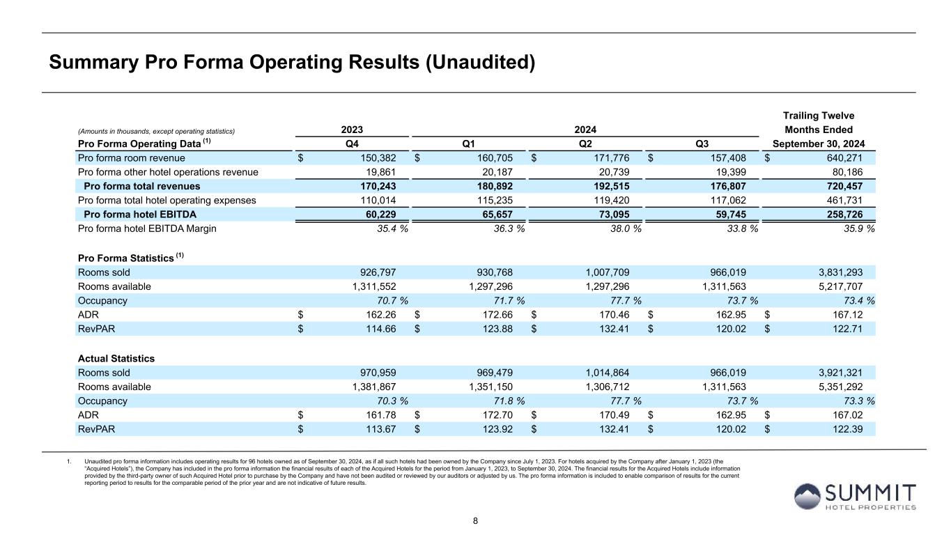 7 Summary Financial Results (Unaudited) For the Three Months Ended September 30, For the Nine Months Ended September 30, (Amounts in thousands, except per share metrics and statistics) 2024 2023 2024 2023 Net (loss) income attributable to common stockholders $ (4,272) $ (5,438) $ 24,461 $ (11,419) Net (loss) income per diluted share $ (0.04) $ (0.05) $ 0.21 $ (0.11) Total revenues $ 176,807 $ 181,816 $ 558,852 $ 558,692 EBITDAre (1) $ 53,745 $ 55,359 $ 184,699 $ 172,301 Adjusted EBITDAre (1) $ 45,340 $ 46,315 $ 150,061 $ 143,638 FFO (1) $ 23,135 $ 22,669 $ 83,557 $ 72,592 Adjusted FFO (1) $ 27,610 $ 26,546 $ 93,976 $ 85,957 FFO per diluted share and unit (1) $ 0.19 $ 0.19 $ 0.67 $ 0.59 Adjusted FFO per diluted share and unit (1) $ 0.22 $ 0.22 $ 0.76 $ 0.70 Pro Forma (2) RevPAR $ 120.02 $ 119.90 $ 125.41 $ 123.47 RevPAR Growth 0.1 % 1.6 % Hotel EBITDA $ 59,745 $ 61,516 $ 198,497 $ 192,531 Hotel EBITDA Margin 33.8 % 34.8 % 36.1 % 35.8 % Hotel EBITDA Margin (Contraction) Growth (99) bps 32 bps Same Store (3) RevPAR $ 120.28 $ 120.08 $ 125.22 $ 123.22 RevPAR Growth 0.2 % 1.6 % Hotel EBITDA $ 59,245 $ 61,011 $ 195,451 $ 189,520 Hotel EBITDA Margin 33.8 % 34.8 % 36.0 % 35.6 % Hotel EBITDA Margin (Contraction) Growth (101) bps 32 bps 1. See tables later in this presentation for a discussion and reconciliation of Net (loss) income to non-GAAP financial measures, including earnings before interest, taxes, depreciation, and amortization (“EBITDA”), EBITDAre, adjusted EBITDAre, funds from operations (“FFO”), FFO per diluted share and unit, adjusted FFO (“AFFO”), and AFFO per diluted share and unit, as well as a reconciliation of Operating income to hotel EBITDA. See “Non-GAAP Financial Measures” at the end of this presentation. 2. Unless stated otherwise in this presentation, all pro forma information includes operating and financial results for 96 lodging properties owned as of September 30, 2024, as if each hotel had been owned by the Company since January 1, 2023 and remained open for the entirety of the measurement period. As a result, all pro forma information includes operating and financial results for hotels acquired since January 1, 2023, which may include periods prior to the Company’s ownership. Pro forma and non-GAAP financial measures are unaudited. 3. All same store information includes 94 lodging properties owned as of September 30, 2024, with operating and financial results for the three and nine months ended September 30, 2024 and 2023.