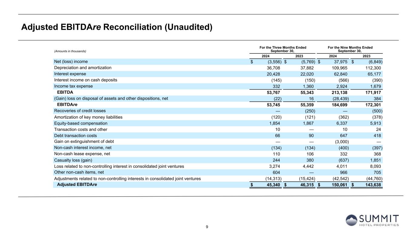 8 Summary Pro Forma Operating Results (Unaudited) 1. Unaudited pro forma information includes operating results for 96 hotels owned as of September 30, 2024, as if all such hotels had been owned by the Company since July 1, 2023. For hotels acquired by the Company after January 1, 2023 (the “Acquired Hotels”), the Company has included in the pro forma information the financial results of each of the Acquired Hotels for the period from January 1, 2023, to September 30, 2024. The financial results for the Acquired Hotels include information provided by the third-party owner of such Acquired Hotel prior to purchase by the Company and have not been audited or reviewed by our auditors or adjusted by us. The pro forma information is included to enable comparison of results for the current reporting period to results for the comparable period of the prior year and are not indicative of future results. Trailing Twelve (Amounts in thousands, except operating statistics) 2023 2024 Months Ended Pro Forma Operating Data (1) Q4 Q1 Q2 Q3 September 30, 2024 Pro forma room revenue $ 150,382 $ 160,705 $ 171,776 $ 157,408 $ 640,271 Pro forma other hotel operations revenue 19,861 20,187 20,739 19,399 80,186 Pro forma total revenues 170,243 180,892 192,515 176,807 720,457 Pro forma total hotel operating expenses 110,014 115,235 119,420 117,062 461,731 Pro forma hotel EBITDA 60,229 65,657 73,095 59,745 258,726 Pro forma hotel EBITDA Margin 35.4 % 36.3 % 38.0 % 33.8 % 35.9 % Pro Forma Statistics (1) Rooms sold 926,797 930,768 1,007,709 966,019 3,831,293 Rooms available 1,311,552 1,297,296 1,297,296 1,311,563 5,217,707 Occupancy 70.7 % 71.7 % 77.7 % 73.7 % 73.4 % ADR $ 162.26 $ 172.66 $ 170.46 $ 162.95 $ 167.12 RevPAR $ 114.66 $ 123.88 $ 132.41 $ 120.02 $ 122.71 Actual Statistics Rooms sold 970,959 969,479 1,014,864 966,019 3,921,321 Rooms available 1,381,867 1,351,150 1,306,712 1,311,563 5,351,292 Occupancy 70.3 % 71.8 % 77.7 % 73.7 % 73.3 % ADR $ 161.78 $ 172.70 $ 170.49 $ 162.95 $ 167.02 RevPAR $ 113.67 $ 123.92 $ 132.41 $ 120.02 $ 122.39