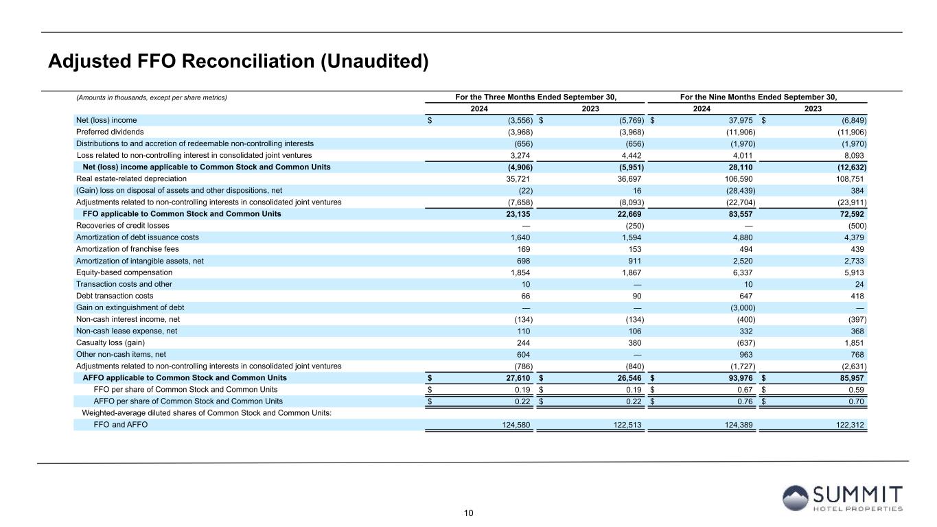 9 Adjusted EBITDAre Reconciliation (Unaudited) (Amounts in thousands) For the Three Months Ended September 30, For the Nine Months Ended September 30, 2024 2023 2024 2023 Net (loss) income $ (3,556) $ (5,769) $ 37,975 $ (6,849) Depreciation and amortization 36,708 37,882 109,965 112,300 Interest expense 20,428 22,020 62,840 65,177 Interest income on cash deposits (145) (150) (566) (390) Income tax expense 332 1,360 2,924 1,679 EBITDA 53,767 55,343 213,138 171,917 (Gain) loss on disposal of assets and other dispositions, net (22) 16 (28,439) 384 EBITDAre 53,745 55,359 184,699 172,301 Recoveries of credit losses — (250) — (500) Amortization of key money liabilities (120) (121) (362) (378) Equity-based compensation 1,854 1,867 6,337 5,913 Transaction costs and other 10 — 10 24 Debt transaction costs 66 90 647 418 Gain on extinguishment of debt — — (3,000) — Non-cash interest income, net (134) (134) (400) (397) Non-cash lease expense, net 110 106 332 368 Casualty loss (gain) 244 380 (637) 1,851 Loss related to non-controlling interest in consolidated joint ventures 3,274 4,442 4,011 8,093 Other non-cash items, net 604 — 966 705 Adjustments related to non-controlling interests in consolidated joint ventures (14,313) (15,424) (42,542) (44,760) Adjusted EBITDAre $ 45,340 $ 46,315 $ 150,061 $ 143,638