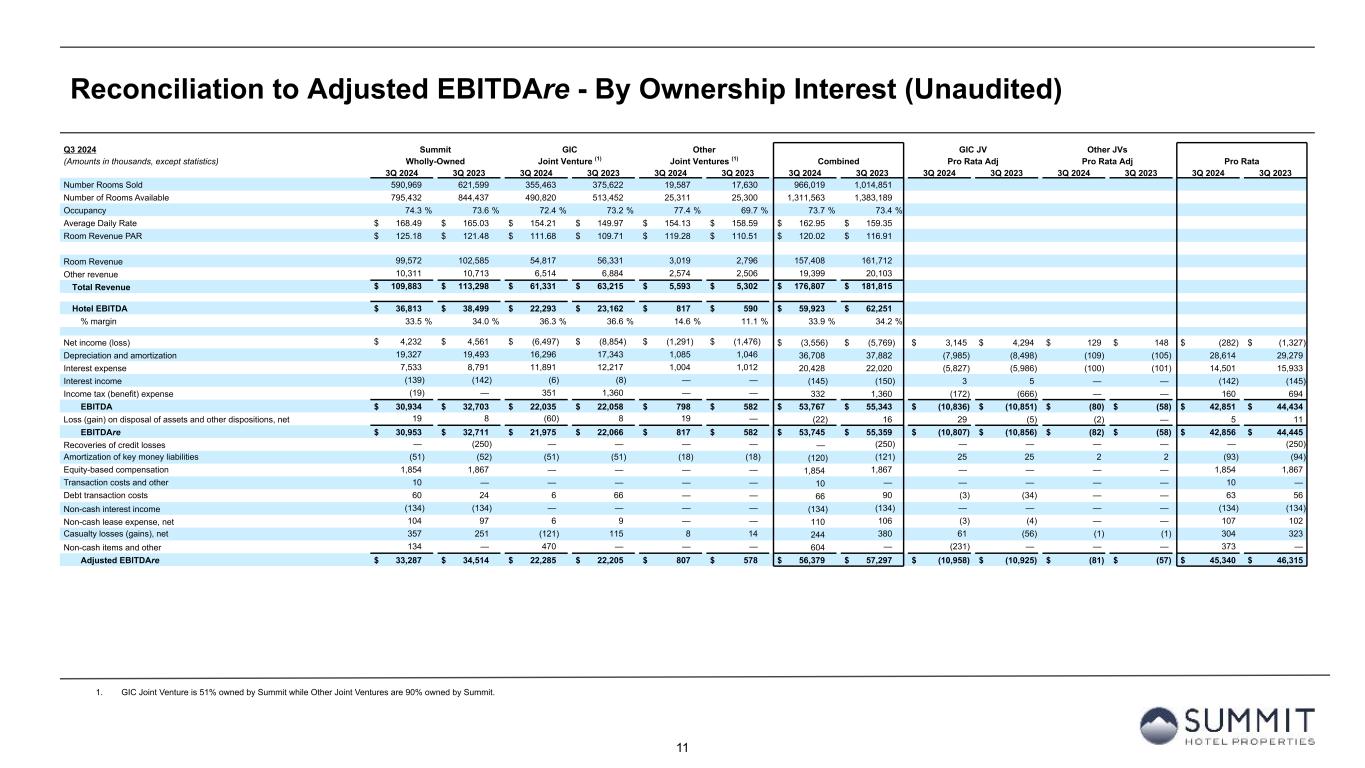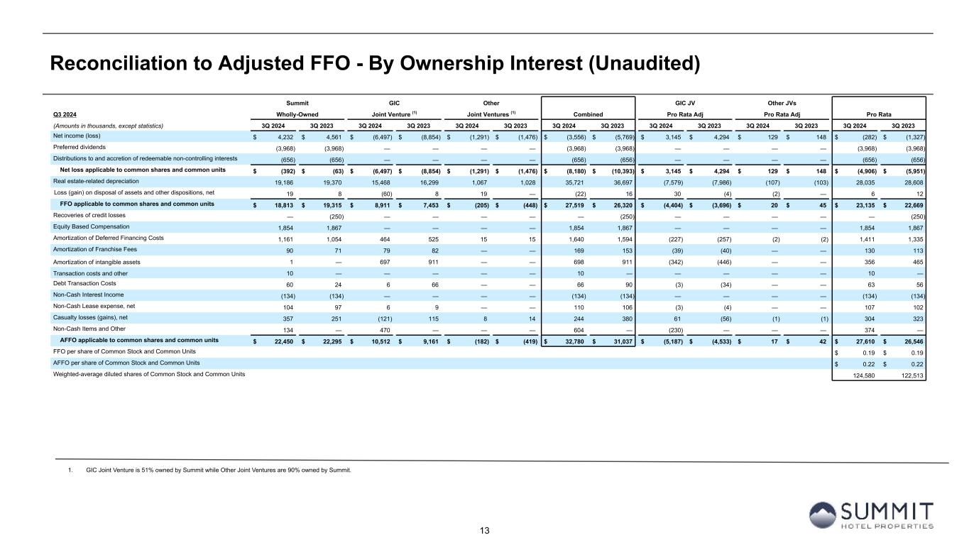 12 Reconciliation to Adjusted EBITDAre - By Ownership Interest (Unaudited) 1. Non-cash interest income relates to the amortization of the discount on certain notes receivable. The discount on these notes receivable was recorded at inception of the related loans based on the estimated value of the embedded purchase options in the notes receivable. 2. GIC Joint Venture is 51% owned by Summit while Other Joint Ventures are 90% owned by Summit. YTD 2024 Summit GIC Other GIC JV Other JVs (Amounts in thousands, except statistics) Wholly-Owned Joint Venture (2) Joint Ventures (2) Combined Pro Rata Adj Pro Rata Adj Pro Rata YTD 2024 YTD 2023 YTD 2024 YTD 2023 YTD 2024 YTD 2023 YTD 2024 YTD 2023 YTD 2024 YTD 2023 YTD 2024 YTD 2023 YTD 2024 YTD 2023 Number Rooms Sold 1,770,585 1,837,662 1,118,300 1,108,514 61,477 57,934 2,950,362 3,004,110 Number of Rooms Available 2,412,874 2,567,608 1,481,190 1,497,362 75,361 75,075 3,969,425 4,140,045 Occupancy 73.4 % 71.6 % 75.5 % 74.0 % 81.6 % 77.2 % 74.3 % 72.6 % Average Daily Rate $ 171.63 $ 168.91 $ 161.80 $ 158.93 $ 211.97 $ 214.16 $ 168.75 $ 166.10 Room Revenue PAR $ 125.95 $ 120.89 $ 122.16 $ 117.66 $ 172.91 $ 165.26 $ 125.42 $ 120.53 Room Revenue 303,892 310,398 180,941 176,177 13,031 12,407 497,864 498,982 Other revenue 30,860 31,090 21,782 20,920 8,346 7,701 60,988 59,711 Total Revenue $ 334,752 $ 341,488 $ 202,723 $ 197,097 $ 21,377 $ 20,108 $ 558,852 $ 558,693 Hotel EBITDA $ 115,410 $ 113,398 $ 79,784 $ 76,419 $ 6,284 $ 5,928 $ 201,478 $ 195,745 % margin 34.5 % 33.2 % 39.4 % 38.8 % 29.4 % 29.5 % 36.1 % 35.0 % Net income (loss) $ 45,996 $ 10,218 $ (8,426) $ (16,910) $ 405 $ (157) $ 37,975 $ (6,849) $ 4,052 $ 8,077 $ (41) $ 16 $ 41,986 $ 1,244 Depreciation and amortization 57,932 57,949 48,773 51,265 3,260 3,086 109,965 112,300 (23,899) (25,120) (326) (309) 85,740 86,871 Interest expense 24,190 25,781 35,637 36,509 3,013 2,887 62,840 65,177 (17,462) (17,889) (301) (289) 45,077 46,999 Interest income (541) (354) (25) (36) — — (566) (390) 12 18 — — (554) (372) Income tax expense 832 26 2,092 1,653 — — 2,924 1,679 (1,025) (810) — — 1,899 869 EBITDA $ 128,409 $ 93,620 $ 78,051 $ 72,481 $ 6,678 $ 5,816 $ 213,138 $ 171,917 $ (38,322) $ (35,724) $ (668) $ (582) $ 174,148 $ 135,611 (Gain) loss on disposal of assets and other dispositions, net (28,271) 345 (187) 39 19 — (28,439) 384 92 (19) (2) — (28,349) 365 EBITDAre $ 100,138 $ 93,965 $ 77,864 $ 72,520 $ 6,697 $ 5,816 $ 184,699 $ 172,301 $ (38,230) $ (35,743) $ (670) $ (582) $ 145,799 $ 135,976 Recoveries of credit losses — (500) — — — — — (500) — — — — — (500) Amortization of key money liabilities (154) (170) (154) (154) (54) (54) (362) (378) 75 75 5 5 (282) (298) Equity-based compensation 6,337 5,913 — — — — 6,337 5,913 — — — — 6,337 5,913 Transaction costs and other 10 13 — 11 — — 10 24 — (5) — — 10 19 Debt transaction costs 627 292 20 126 — — 647 418 (10) (61) — — 637 357 Gain on extinguishment of debt (3,000) — — — — — (3,000) — — — — — (3,000) — Non-cash interest income (1) (400) (397) — — — — (400) (397) — — — — (400) (397) Non-cash lease expense, net 348 335 (16) 33 — — 332 368 8 (16) — — 340 352 Casualty losses (gains), net 743 1,071 (984) 671 (396) 109 (637) 1,851 482 (329) 40 (11) (115) 1,511 Non-cash items and other 496 705 470 — — — 966 705 (231) — — — 735 705 Adjusted EBITDAre $ 105,145 $ 101,227 $ 77,200 $ 73,207 $ 6,247 $ 5,871 $ 188,592 $ 180,305 $ (37,906) $ (36,079) $ (625) $ (588) $ 150,061 $ 143,638