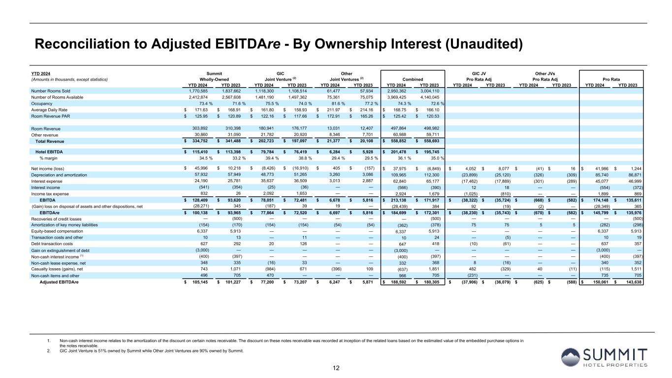 11 Reconciliation to Adjusted EBITDAre - By Ownership Interest (Unaudited) 1. GIC Joint Venture is 51% owned by Summit while Other Joint Ventures are 90% owned by Summit. Q3 2024 Summit GIC Other GIC JV Other JVs (Amounts in thousands, except statistics) Wholly-Owned Joint Venture (1) Joint Ventures (1) Combined Pro Rata Adj Pro Rata Adj Pro Rata 3Q 2024 3Q 2023 3Q 2024 3Q 2023 3Q 2024 3Q 2023 3Q 2024 3Q 2023 3Q 2024 3Q 2023 3Q 2024 3Q 2023 3Q 2024 3Q 2023 Number Rooms Sold 590,969 621,599 355,463 375,622 19,587 17,630 966,019 1,014,851 Number of Rooms Available 795,432 844,437 490,820 513,452 25,311 25,300 1,311,563 1,383,189 Occupancy 74.3 % 73.6 % 72.4 % 73.2 % 77.4 % 69.7 % 73.7 % 73.4 % Average Daily Rate $ 168.49 $ 165.03 $ 154.21 $ 149.97 $ 154.13 $ 158.59 $ 162.95 $ 159.35 Room Revenue PAR $ 125.18 $ 121.48 $ 111.68 $ 109.71 $ 119.28 $ 110.51 $ 120.02 $ 116.91 Room Revenue 99,572 102,585 54,817 56,331 3,019 2,796 157,408 161,712 Other revenue 10,311 10,713 6,514 6,884 2,574 2,506 19,399 20,103 Total Revenue $ 109,883 $ 113,298 $ 61,331 $ 63,215 $ 5,593 $ 5,302 $ 176,807 $ 181,815 Hotel EBITDA $ 36,813 $ 38,499 $ 22,293 $ 23,162 $ 817 $ 590 $ 59,923 $ 62,251 % margin 33.5 % 34.0 % 36.3 % 36.6 % 14.6 % 11.1 % 33.9 % 34.2 % Net income (loss) $ 4,232 $ 4,561 $ (6,497) $ (8,854) $ (1,291) $ (1,476) $ (3,556) $ (5,769) $ 3,145 $ 4,294 $ 129 $ 148 $ (282) $ (1,327) Depreciation and amortization 19,327 19,493 16,296 17,343 1,085 1,046 36,708 37,882 (7,985) (8,498) (109) (105) 28,614 29,279 Interest expense 7,533 8,791 11,891 12,217 1,004 1,012 20,428 22,020 (5,827) (5,986) (100) (101) 14,501 15,933 Interest income (139) (142) (6) (8) — — (145) (150) 3 5 — — (142) (145) Income tax (benefit) expense (19) — 351 1,360 — — 332 1,360 (172) (666) — — 160 694 EBITDA $ 30,934 $ 32,703 $ 22,035 $ 22,058 $ 798 $ 582 $ 53,767 $ 55,343 $ (10,836) $ (10,851) $ (80) $ (58) $ 42,851 $ 44,434 Loss (gain) on disposal of assets and other dispositions, net 19 8 (60) 8 19 — (22) 16 29 (5) (2) — 5 11 EBITDAre $ 30,953 $ 32,711 $ 21,975 $ 22,066 $ 817 $ 582 $ 53,745 $ 55,359 $ (10,807) $ (10,856) $ (82) $ (58) $ 42,856 $ 44,445 Recoveries of credit losses — (250) — — — — — (250) — — — — — (250) Amortization of key money liabilities (51) (52) (51) (51) (18) (18) (120) (121) 25 25 2 2 (93) (94) Equity-based compensation 1,854 1,867 — — — — 1,854 1,867 — — — — 1,854 1,867 Transaction costs and other 10 — — — — — 10 — — — — — 10 — Debt transaction costs 60 24 6 66 — — 66 90 (3) (34) — — 63 56 Non-cash interest income (134) (134) — — — — (134) (134) — — — — (134) (134) Non-cash lease expense, net 104 97 6 9 — — 110 106 (3) (4) — — 107 102 Casualty losses (gains), net 357 251 (121) 115 8 14 244 380 61 (56) (1) (1) 304 323 Non-cash items and other 134 — 470 — — — 604 — (231) — — — 373 — Adjusted EBITDAre $ 33,287 $ 34,514 $ 22,285 $ 22,205 $ 807 $ 578 $ 56,379 $ 57,297 $ (10,958) $ (10,925) $ (81) $ (57) $ 45,340 $ 46,315