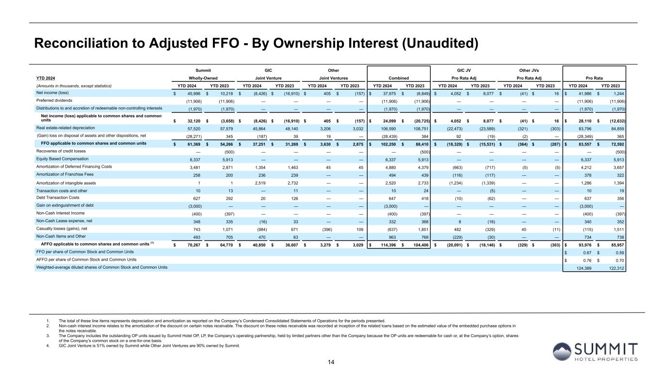 13 Reconciliation to Adjusted FFO - By Ownership Interest (Unaudited) 1. GIC Joint Venture is 51% owned by Summit while Other Joint Ventures are 90% owned by Summit. Summit GIC Other GIC JV Other JVs Q3 2024 Wholly-Owned Joint Venture (1) Joint Ventures (1) Combined Pro Rata Adj Pro Rata Adj Pro Rata (Amounts in thousands, except statistics) 3Q 2024 3Q 2023 3Q 2024 3Q 2023 3Q 2024 3Q 2023 3Q 2024 3Q 2023 3Q 2024 3Q 2023 3Q 2024 3Q 2023 3Q 2024 3Q 2023 Net income (loss) $ 4,232 $ 4,561 $ (6,497) $ (8,854) $ (1,291) $ (1,476) $ (3,556) $ (5,769) $ 3,145 $ 4,294 $ 129 $ 148 $ (282) $ (1,327) Preferred dividends (3,968) (3,968) — — — — (3,968) (3,968) — — — — (3,968) (3,968) Distributions to and accretion of redeemable non-controlling interests (656) (656) — — — — (656) (656) — — — — (656) (656) Net loss applicable to common shares and common units $ (392) $ (63) $ (6,497) $ (8,854) $ (1,291) $ (1,476) $ (8,180) $ (10,393) $ 3,145 $ 4,294 $ 129 $ 148 $ (4,906) $ (5,951) Real estate-related depreciation 19,186 19,370 15,468 16,299 1,067 1,028 35,721 36,697 (7,579) (7,986) (107) (103) 28,035 28,608 Loss (gain) on disposal of assets and other dispositions, net 19 8 (60) 8 19 — (22) 16 30 (4) (2) — 6 12 FFO applicable to common shares and common units $ 18,813 $ 19,315 $ 8,911 $ 7,453 $ (205) $ (448) $ 27,519 $ 26,320 $ (4,404) $ (3,696) $ 20 $ 45 $ 23,135 $ 22,669 Recoveries of credit losses — (250) — — — — — (250) — — — — — (250) Equity Based Compensation 1,854 1,867 — — — — 1,854 1,867 — — — — 1,854 1,867 Amortization of Deferred Financing Costs 1,161 1,054 464 525 15 15 1,640 1,594 (227) (257) (2) (2) 1,411 1,335 Amortization of Franchise Fees 90 71 79 82 — — 169 153 (39) (40) — — 130 113 Amortization of intangible assets 1 — 697 911 — — 698 911 (342) (446) — — 356 465 Transaction costs and other 10 — — — — — 10 — — — — — 10 — Debt Transaction Costs 60 24 6 66 — — 66 90 (3) (34) — — 63 56 Non-Cash Interest Income (134) (134) — — — — (134) (134) — — — — (134) (134) Non-Cash Lease expense, net 104 97 6 9 — — 110 106 (3) (4) — — 107 102 Casualty losses (gains), net 357 251 (121) 115 8 14 244 380 61 (56) (1) (1) 304 323 Non-Cash Items and Other 134 — 470 — — — 604 — (230) — — — 374 — AFFO applicable to common shares and common units $ 22,450 $ 22,295 $ 10,512 $ 9,161 $ (182) $ (419) $ 32,780 $ 31,037 $ (5,187) $ (4,533) $ 17 $ 42 $ 27,610 $ 26,546 FFO per share of Common Stock and Common Units $ 0.19 $ 0.19 AFFO per share of Common Stock and Common Units $ 0.22 $ 0.22 Weighted-average diluted shares of Common Stock and Common Units 124,580 122,513
