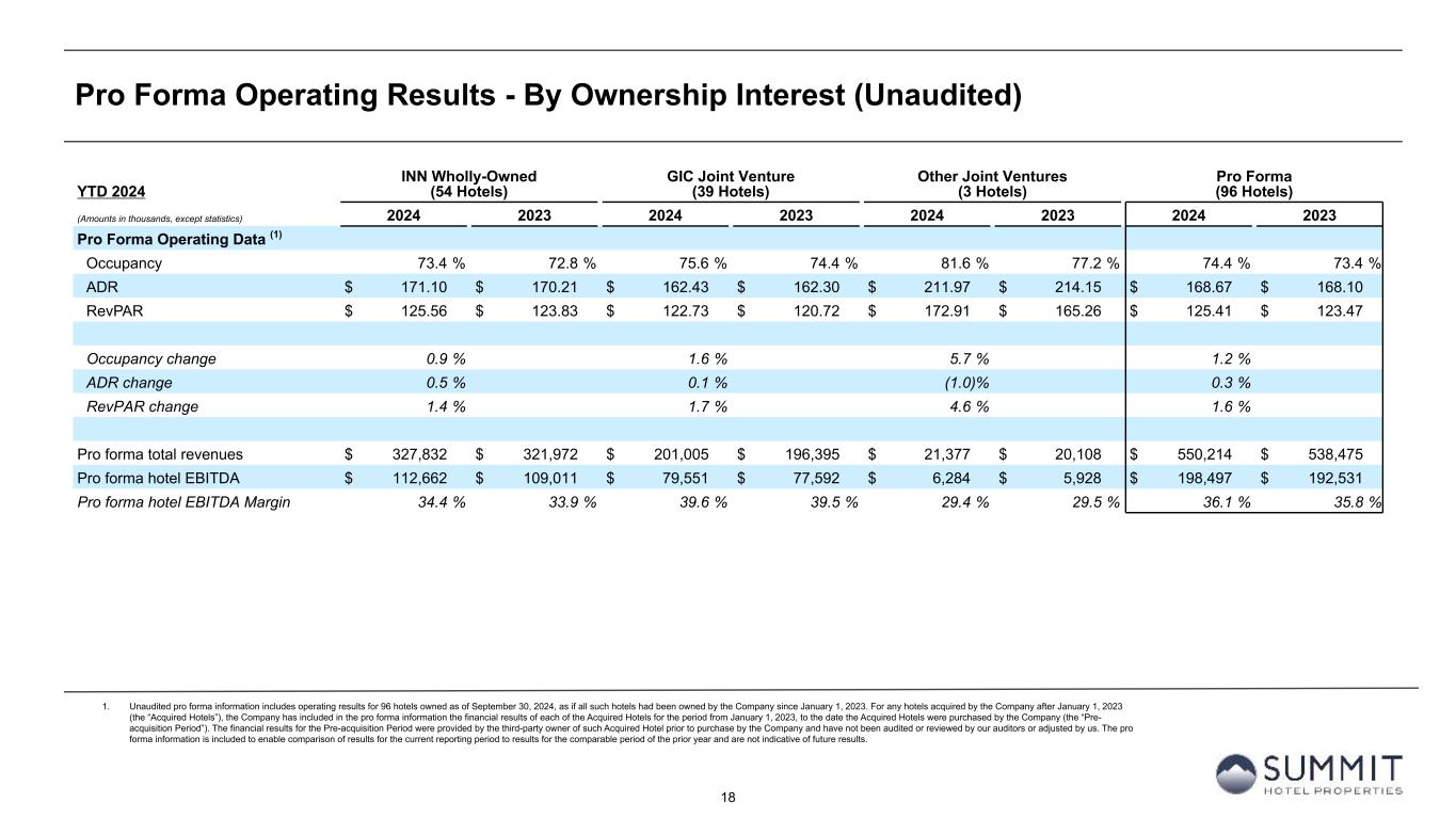 17 Pro Forma Operating Results - By Ownership Interest (Unaudited) 1. Unaudited pro forma information includes operating results for 96 hotels owned as of September 30, 2024, as if all such hotels had been owned by the Company since January 1, 2023. For any hotels acquired by the Company after January 1, 2023 (the “Acquired Hotels”), the Company has included in the pro forma information the financial results of each of the Acquired Hotels for the period from January 1, 2023, to the date the Acquired Hotels were purchased by the Company (the “Pre- acquisition Period”). The financial results for the Pre-acquisition Period were provided by the third-party owner of such Acquired Hotel prior to purchase by the Company and have not been audited or reviewed by our auditors or adjusted by us. The pro forma information is included to enable comparison of results for the current reporting period to results for the comparable period of the prior year and are not indicative of future results. Q3 2024 INN Wholly-Owned (54 Hotels) GIC Joint Venture (39 Hotels) Other Joint Ventures (3 Hotels) Pro Forma (96 Hotels) (Amounts in thousands, except statistics) 2024 2023 2024 2023 2024 2023 2024 2023 Pro Forma Operating Data (1) Occupancy 74.3 % 75.4 % 72.4 % 73.4 % 77.4 % 69.7 % 73.7 % 74.5 % ADR $ 168.49 $ 166.43 $ 154.21 $ 151.75 $ 154.15 $ 158.57 $ 162.95 $ 160.88 RevPAR $ 125.18 $ 125.44 $ 111.68 $ 111.39 $ 119.29 $ 110.50 $ 120.02 $ 119.90 Occupancy change (1.4) % (1.3) % 11.1 % (1.2) % ADR change 1.2 % 1.6 % (2.8) % 1.3 % RevPAR change (0.2) % 0.3 % 8.0 % 0.1 % Pro forma total revenues $ 109,884 $ 110,163 $ 61,330 $ 61,399 $ 5,593 $ 5,302 $ 176,807 $ 176,864 Pro forma hotel EBITDA $ 36,692 $ 38,195 $ 22,236 $ 22,731 $ 817 $ 590 $ 59,745 $ 61,516 Pro forma hotel EBITDA Margin 33.4 % 34.7 % 36.3 % 37.0 % 14.6 % 11.1 % 33.8 % 34.8 %