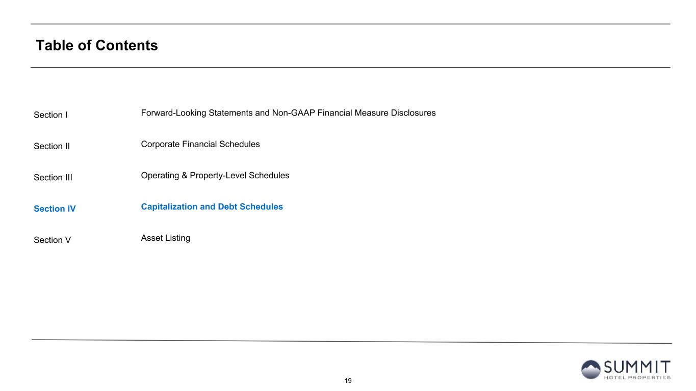 19 Table of Contents Section I Section II Section III Section IV Section V Forward-Looking Statements and Non-GAAP Financial Measure Disclosures Corporate Financial Schedules Operating & Property-Level Schedules Capitalization and Debt Schedules Asset Listing