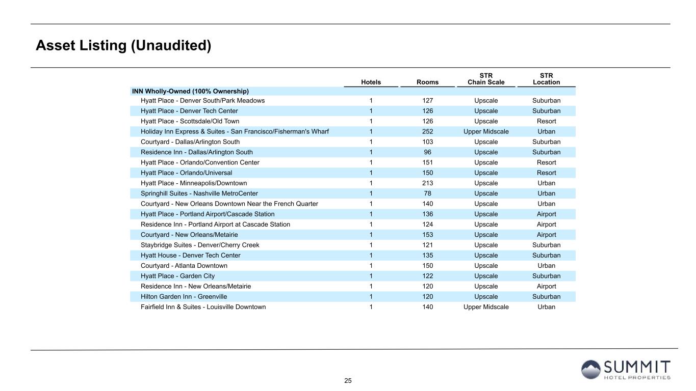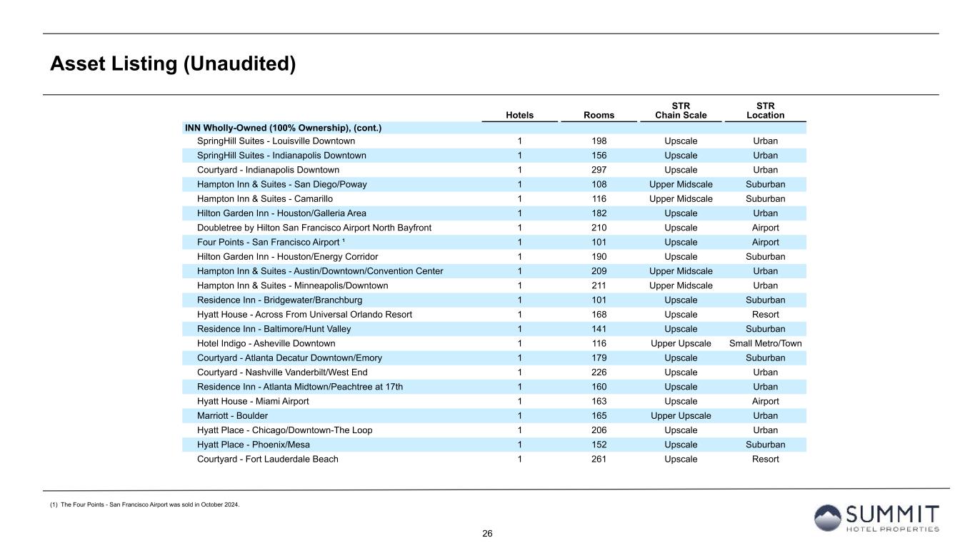 25 Asset Listing (Unaudited) Hotels Rooms STR Chain Scale STR Location INN Wholly-Owned (100% Ownership) Hyatt Place - Denver South/Park Meadows 1 127 Upscale Suburban Hyatt Place - Denver Tech Center 1 126 Upscale Suburban Hyatt Place - Scottsdale/Old Town 1 126 Upscale Resort Holiday Inn Express & Suites - San Francisco/Fisherman's Wharf 1 252 Upper Midscale Urban Courtyard - Dallas/Arlington South 1 103 Upscale Suburban Residence Inn - Dallas/Arlington South 1 96 Upscale Suburban Hyatt Place - Orlando/Convention Center 1 151 Upscale Resort Hyatt Place - Orlando/Universal 1 150 Upscale Resort Hyatt Place - Minneapolis/Downtown 1 213 Upscale Urban Springhill Suites - Nashville MetroCenter 1 78 Upscale Urban Courtyard - New Orleans Downtown Near the French Quarter 1 140 Upscale Urban Hyatt Place - Portland Airport/Cascade Station 1 136 Upscale Airport Residence Inn - Portland Airport at Cascade Station 1 124 Upscale Airport Courtyard - New Orleans/Metairie 1 153 Upscale Airport Staybridge Suites - Denver/Cherry Creek 1 121 Upscale Suburban Hyatt House - Denver Tech Center 1 135 Upscale Suburban Courtyard - Atlanta Downtown 1 150 Upscale Urban Hyatt Place - Garden City 1 122 Upscale Suburban Residence Inn - New Orleans/Metairie 1 120 Upscale Airport Hilton Garden Inn - Greenville 1 120 Upscale Suburban Fairfield Inn & Suites - Louisville Downtown 1 140 Upper Midscale Urban