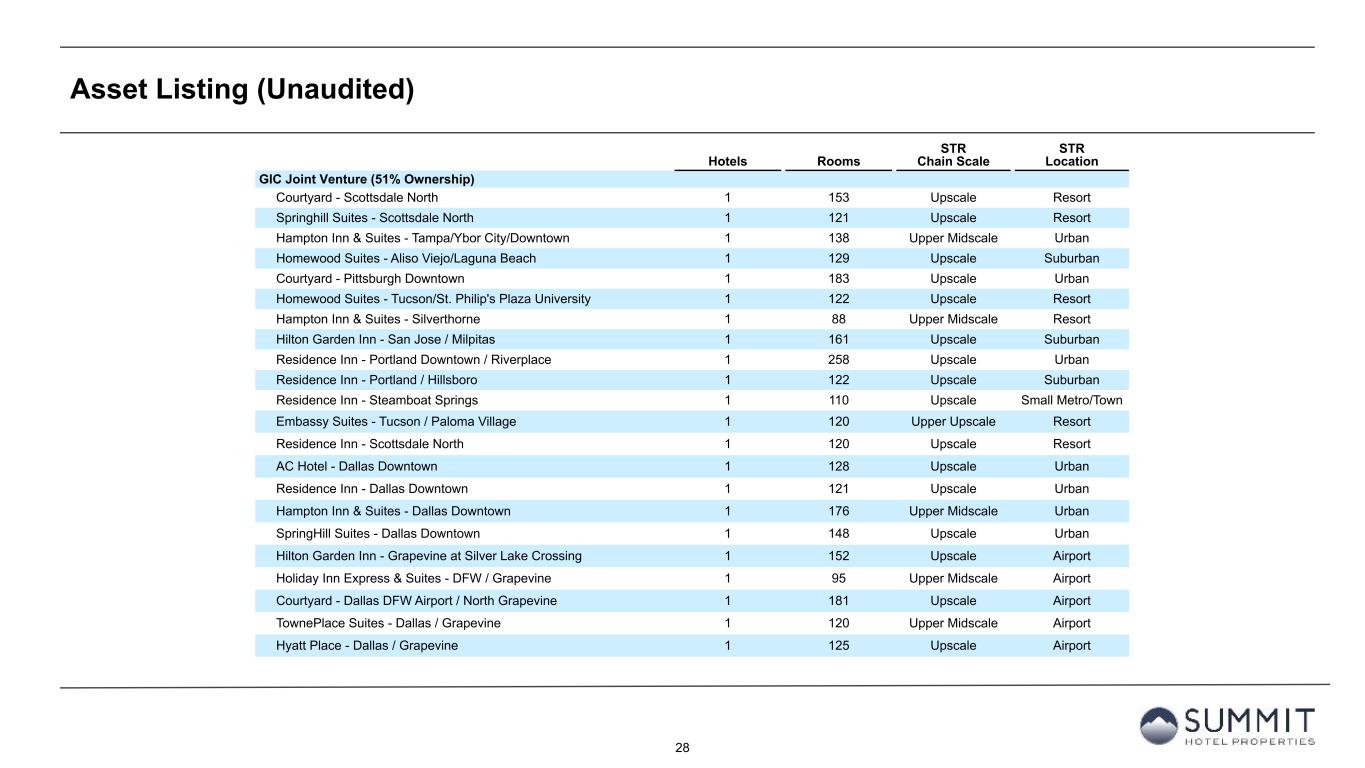 27 Asset Listing (Unaudited) Hotels Rooms STR Chain Scale STR Location INN Wholly-Owned (100% Ownership), (cont.) Courtyard - Charlotte City Center 1 181 Upscale Urban Hampton Inn & Suites - Baltimore Inner Harbor 1 116 Upper Midscale Urban Residence Inn - Baltimore Downtown/Inner Harbor 1 189 Upscale Urban Courtyard - Kansas City Country Club Plaza 1 123 Upscale Suburban Courtyard - Fort Worth Downtown/Blackstone 1 203 Upscale Urban AC Hotel - Atlanta Downtown 1 255 Upscale Urban Hilton Garden Inn - Waltham 1 148 Upscale Suburban Residence Inn - Cleveland Downtown 1 175 Upscale Urban Courtyard - New Haven at Yale 1 207 Upscale Urban Residence Inn - Boston/Watertown 1 150 Upscale Suburban INN Wholly-Owned (100% Ownership) 54 8,646