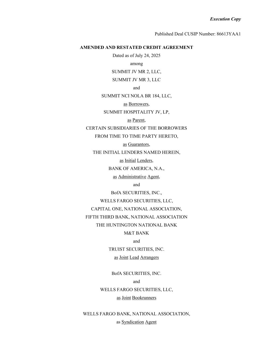 Execution Copy Published Deal CUSIP Number: 86613YAA1 AMENDED AND RESTATED CREDIT AGREEMENT Dated as of July 24, 2025 among SUMMIT JV MR 2, LLC, SUMMIT JV MR 3, LLC and SUMMIT NCI NOLA BR 184, LLC, as Borrowers, SUMMIT HOSPITALITY JV, LP, as Parent, CERTAIN SUBSIDIARIES OF THE BORROWERS FROM TIME TO TIME PARTY HERETO, as Guarantors, THE INITIAL LENDERS NAMED HEREIN, as Initial Lenders, BANK OF AMERICA, N.A., as Administrative Agent, and BofA SECURITIES, INC., WELLS FARGO SECURITIES, LLC, CAPITAL ONE, NATIONAL ASSOCIATION, FIFTH THIRD BANK, NATIONAL ASSOCIATION THE HUNTINGTON NATIONAL BANK M&T BANK and TRUIST SECURITIES, INC. as Joint Lead Arrangers BofA SECURITIES, INC. and WELLS FARGO SECURITIES, LLC, as Joint Bookrunners WELLS FARGO BANK, NATIONAL ASSOCIATION, as Syndication Agent