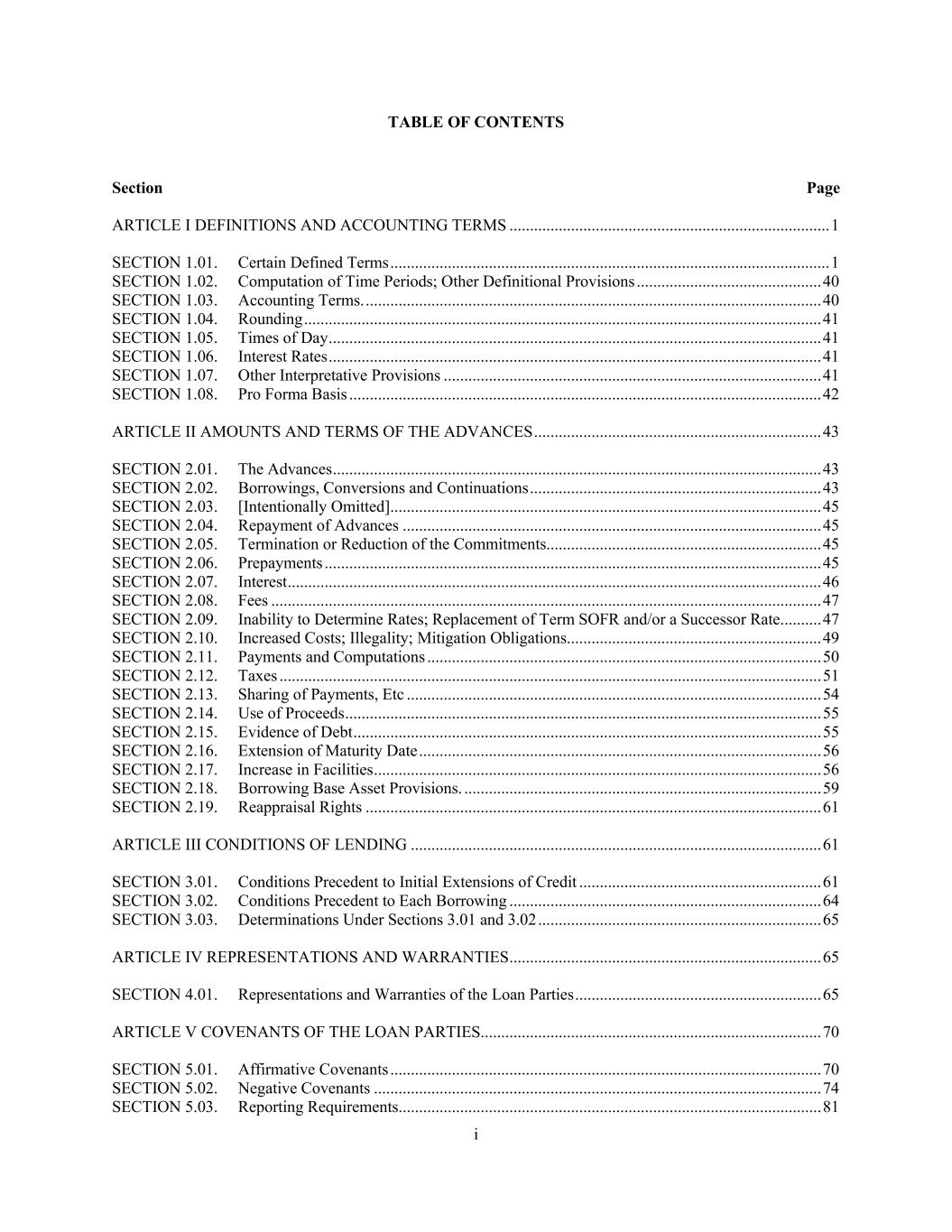 i TABLE OF CONTENTS Section Page ARTICLE I DEFINITIONS AND ACCOUNTING TERMS .............................................................................. 1 SECTION 1.01. Certain Defined Terms ........................................................................................................... 1 SECTION 1.02. Computation of Time Periods; Other Definitional Provisions ............................................. 40 SECTION 1.03. Accounting Terms. ............................................................................................................... 40 SECTION 1.04. Rounding .............................................................................................................................. 41 SECTION 1.05. Times of Day ........................................................................................................................ 41 SECTION 1.06. Interest Rates ........................................................................................................................ 41 SECTION 1.07. Other Interpretative Provisions ............................................................................................ 41 SECTION 1.08. Pro Forma Basis ................................................................................................................... 42 ARTICLE II AMOUNTS AND TERMS OF THE ADVANCES ...................................................................... 43 SECTION 2.01. The Advances ....................................................................................................................... 43 SECTION 2.02. Borrowings, Conversions and Continuations ....................................................................... 43 SECTION 2.03. [Intentionally Omitted] ......................................................................................................... 45 SECTION 2.04. Repayment of Advances ...................................................................................................... 45 SECTION 2.05. Termination or Reduction of the Commitments................................................................... 45 SECTION 2.06. Prepayments ......................................................................................................................... 45 SECTION 2.07. Interest .................................................................................................................................. 46 SECTION 2.08. Fees ...................................................................................................................................... 47 SECTION 2.09. Inability to Determine Rates; Replacement of Term SOFR and/or a Successor Rate. ......... 47 SECTION 2.10. Increased Costs; Illegality; Mitigation Obligations. ............................................................. 49 SECTION 2.11. Payments and Computations ................................................................................................ 50 SECTION 2.12. Taxes .................................................................................................................................... 51 SECTION 2.13. Sharing of Payments, Etc ..................................................................................................... 54 SECTION 2.14. Use of Proceeds .................................................................................................................... 55 SECTION 2.15. Evidence of Debt .................................................................................................................. 55 SECTION 2.16. Extension of Maturity Date .................................................................................................. 56 SECTION 2.17. Increase in Facilities ............................................................................................................. 56 SECTION 2.18. Borrowing Base Asset Provisions. ....................................................................................... 59 SECTION 2.19. Reappraisal Rights ............................................................................................................... 61 ARTICLE III CONDITIONS OF LENDING .................................................................................................... 61 SECTION 3.01. Conditions Precedent to Initial Extensions of Credit ........................................................... 61 SECTION 3.02. Conditions Precedent to Each Borrowing ............................................................................ 64 SECTION 3.03. Determinations Under Sections 3.01 and 3.02 ..................................................................... 65 ARTICLE IV REPRESENTATIONS AND WARRANTIES ............................................................................ 65 SECTION 4.01. Representations and Warranties of the Loan Parties ............................................................ 65 ARTICLE V COVENANTS OF THE LOAN PARTIES ................................................................................... 70 SECTION 5.01. Affirmative Covenants ......................................................................................................... 70 SECTION 5.02. Negative Covenants ............................................................................................................. 74 SECTION 5.03. Reporting Requirements ....................................................................................................... 81
