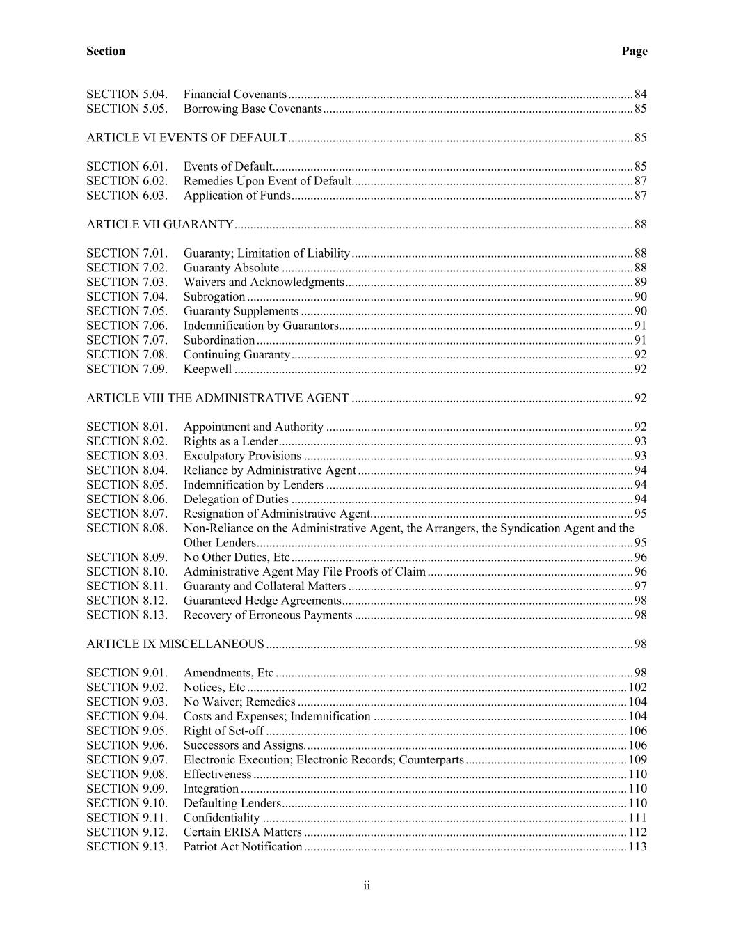 Section Page ii SECTION 5.04. Financial Covenants ............................................................................................................. 84 SECTION 5.05. Borrowing Base Covenants .................................................................................................. 85 ARTICLE VI EVENTS OF DEFAULT ............................................................................................................. 85 SECTION 6.01. Events of Default.................................................................................................................. 85 SECTION 6.02. Remedies Upon Event of Default ......................................................................................... 87 SECTION 6.03. Application of Funds ............................................................................................................ 87 ARTICLE VII GUARANTY .............................................................................................................................. 88 SECTION 7.01. Guaranty; Limitation of Liability ......................................................................................... 88 SECTION 7.02. Guaranty Absolute ............................................................................................................... 88 SECTION 7.03. Waivers and Acknowledgments ........................................................................................... 89 SECTION 7.04. Subrogation .......................................................................................................................... 90 SECTION 7.05. Guaranty Supplements ......................................................................................................... 90 SECTION 7.06. Indemnification by Guarantors............................................................................................. 91 SECTION 7.07. Subordination ....................................................................................................................... 91 SECTION 7.08. Continuing Guaranty ............................................................................................................ 92 SECTION 7.09. Keepwell .............................................................................................................................. 92 ARTICLE VIII THE ADMINISTRATIVE AGENT ......................................................................................... 92 SECTION 8.01. Appointment and Authority ................................................................................................. 92 SECTION 8.02. Rights as a Lender ................................................................................................................ 93 SECTION 8.03. Exculpatory Provisions ........................................................................................................ 93 SECTION 8.04. Reliance by Administrative Agent ....................................................................................... 94 SECTION 8.05. Indemnification by Lenders ................................................................................................. 94 SECTION 8.06. Delegation of Duties ............................................................................................................ 94 SECTION 8.07. Resignation of Administrative Agent. .................................................................................. 95 SECTION 8.08. Non-Reliance on the Administrative Agent, the Arrangers, the Syndication Agent and the Other Lenders ....................................................................................................................... 95 SECTION 8.09. No Other Duties, Etc ............................................................................................................ 96 SECTION 8.10. Administrative Agent May File Proofs of Claim ................................................................. 96 SECTION 8.11. Guaranty and Collateral Matters .......................................................................................... 97 SECTION 8.12. Guaranteed Hedge Agreements ............................................................................................ 98 SECTION 8.13. Recovery of Erroneous Payments ........................................................................................ 98 ARTICLE IX MISCELLANEOUS .................................................................................................................... 98 SECTION 9.01. Amendments, Etc ................................................................................................................. 98 SECTION 9.02. Notices, Etc ........................................................................................................................ 102 SECTION 9.03. No Waiver; Remedies ........................................................................................................ 104 SECTION 9.04. Costs and Expenses; Indemnification ................................................................................ 104 SECTION 9.05. Right of Set-off .................................................................................................................. 106 SECTION 9.06. Successors and Assigns. ..................................................................................................... 106 SECTION 9.07. Electronic Execution; Electronic Records; Counterparts ................................................... 109 SECTION 9.08. Effectiveness ...................................................................................................................... 110 SECTION 9.09. Integration .......................................................................................................................... 110 SECTION 9.10. Defaulting Lenders ............................................................................................................. 110 SECTION