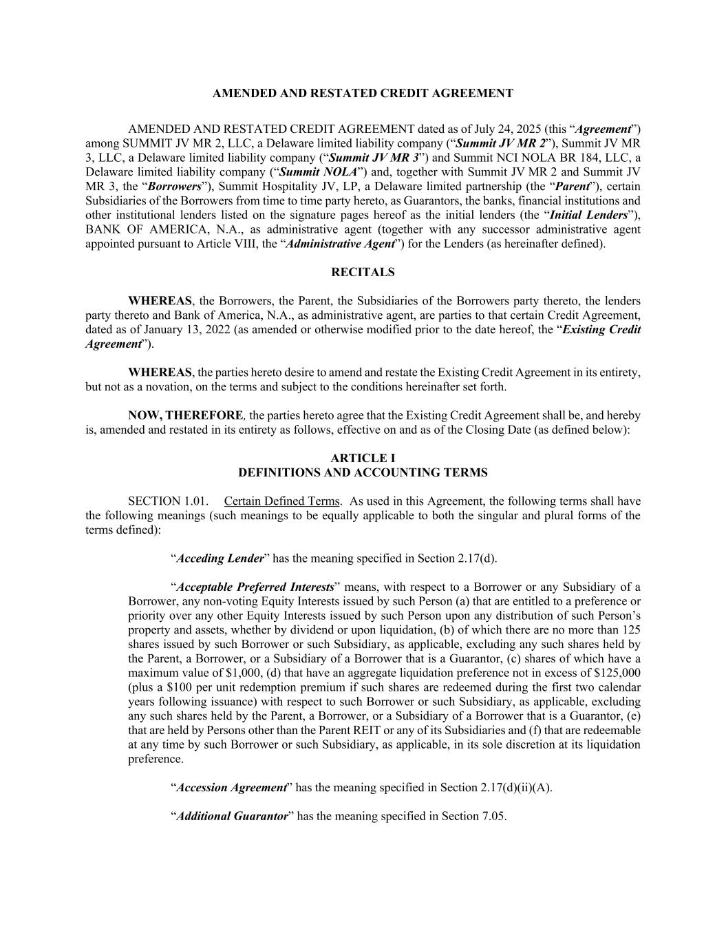 AMENDED AND RESTATED CREDIT AGREEMENT AMENDED AND RESTATED CREDIT AGREEMENT dated as of July 24, 2025 (this “Agreement”) among SUMMIT JV MR 2, LLC, a Delaware limited liability company (“Summit JV MR 2”), Summit JV MR 3, LLC, a Delaware limited liability company (“Summit JV MR 3”) and Summit NCI NOLA BR 184, LLC, a Delaware limited liability company (“Summit NOLA”) and, together with Summit JV MR 2 and Summit JV MR 3, the “Borrowers”), Summit Hospitality JV, LP, a Delaware limited partnership (the “Parent”), certain Subsidiaries of the Borrowers from time to time party hereto, as Guarantors, the banks, financial institutions and other institutional lenders listed on the signature pages hereof as the initial lenders (the “Initial Lenders”), BANK OF AMERICA, N.A., as administrative agent (together with any successor administrative agent appointed pursuant to Article VIII, the “Administrative Agent”) for the Lenders (as hereinafter defined). RECITALS WHEREAS, the Borrowers, the Parent, the Subsidiaries of the Borrowers party thereto, the lenders party thereto and Bank of America, N.A., as administrative agent, are parties to that certain Credit Agreement, dated as of January 13, 2022 (as amended or otherwise modified prior to the date hereof, the “Existing Credit Agreement”). WHEREAS, the parties hereto desire to amend and restate the Existing Credit Agreement in its entirety, but not as a novation, on the terms and subject to the conditions hereinafter set forth. NOW, THEREFORE, the parties hereto agree that the Existing Credit Agreement shall be, and hereby is, amended and restated in its entirety as follows, effective on and as of the Closing Date (as defined below): ARTICLE I DEFINITIONS AND ACCOUNTING TERMS SECTION 1.01. Certain Defined Terms. As used in this Agreement, the following terms shall have the following meanings (such meanings to be equally applicable to both the singular and plural forms of the terms defined): “Acceding Lender” has the meaning specified in Section 2.17(d). “Acceptable Preferred Interests” means, with respect to a Borrower or any Subsidiary of a Borrower, any non-voting Equity Interests issued by such Person (a) that are entitled to a preference or priority over any other Equity Interests issued by such Person upon any distribution of such Person’s property and assets, whether by dividend or upon liquidation, (b) of which there are no more than 125 shares issued by such Borrower or such Subsidiary, as applicable, excluding any such shares held by the Parent, a Borrower, or a Subsidiary of a Borrower that is a Guarantor, (c) shares of which have a maximum value of $1,000, (d) that have an aggregate liquidation preference not in excess of $125,000 (plus a $100 per unit redemption premium if such shares are redeemed during the first two calendar years following issuance) with respect to such Borrower or such Subsidiary, as applicable, excluding any such shares held by the Parent, a Borrower, or a Subsidiary of a Borrower that is a Guarantor, (e) that are held by Persons other than the Parent REIT or any of its Subsidiaries and (f) that are redeemable at any time by such Borrower or such Subsidiary, as applicable, in its sole discretion at its liquidation preference. “Accession Agreement” has the meaning specified in Section 2.17(d)(ii)(A). “Additional Guarantor” has the meaning specified in Section 7.05.