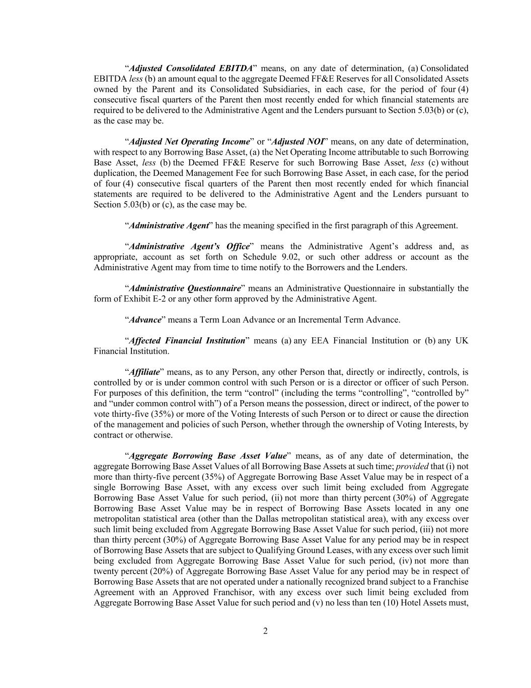 2 “Adjusted Consolidated EBITDA” means, on any date of determination, (a) Consolidated EBITDA less (b) an amount equal to the aggregate Deemed FF&E Reserves for all Consolidated Assets owned by the Parent and its Consolidated Subsidiaries, in each case, for the period of four (4) consecutive fiscal quarters of the Parent then most recently ended for which financial statements are required to be delivered to the Administrative Agent and the Lenders pursuant to Section 5.03(b) or (c), as the case may be. “Adjusted Net Operating Income” or “Adjusted NOI” means, on any date of determination, with respect to any Borrowing Base Asset, (a) the Net Operating Income attributable to such Borrowing Base Asset, less (b) the Deemed FF&E Reserve for such Borrowing Base Asset, less (c) without duplication, the Deemed Management Fee for such Borrowing Base Asset, in each case, for the period of four (4) consecutive fiscal quarters of the Parent then most recently ended for which financial statements are required to be delivered to the Administrative Agent and the Lenders pursuant to Section 5.03(b) or (c), as the case may be. “Administrative Agent” has the meaning specified in the first paragraph of this Agreement. “Administrative Agent’s Office” means the Administrative Agent’s address and, as appropriate, account as set forth on Schedule 9.02, or such other address or account as the Administrative Agent may from time to time notify to the Borrowers and the Lenders. “Administrative Questionnaire” means an Administrative Questionnaire in substantially the form of Exhibit E-2 or any other form approved by the Administrative Agent. “Advance” means a Term Loan Advance or an Incremental Term Advance. “Affected Financial Institution” means (a) any EEA Financial Institution or (b) any UK Financial Institution. “Affiliate” means, as to any Person, any other Person that, directly or indirectly, controls, is controlled by or is under common control with such Person or is a director or officer of such Person. For purposes of this definition, the term “control” (including the terms “controlling”, “controlled by” and “under common control with”) of a Person means the possession, direct or indirect, of the power to vote thirty-five (35%) or more of the Voting Interests of such Person or to direct or cause the direction of the management and policies of such Person, whether through the ownership of Voting Interests, by contract or otherwise. “Aggregate Borrowing Base Asset Value” means, as of any date of determination, the aggregate Borrowing Base Asset Values of all Borrowing Base Assets at such time; provided that (i) not more than thirty-five percent (35%) of Aggregate Borrowing Base Asset Value may be in respect of a single Borrowing Base Asset, with any excess over such limit being excluded from Aggregate Borrowing Base Asset Value for such period, (ii) not more than thirty percent (30%) of Aggregate Borrowing Base Asset Value may be in respect of Borrowing Base Assets located in any one metropolitan statistical area (other than the Dallas metropolitan statistical area), with any excess over such limit being excluded from Aggregate Borrowing Base Asset Value for such period, (iii) not more than thirty percent (30%) of Aggregate Borrowing Base Asset Value for any period may be in respect of Borrowing Base Assets that are subject to Qualifying Ground Leases, with any excess over such limit being excluded from Aggregate Borrowing Base Asset Value for such period, (iv) not more than twenty percent (20%) of Aggregate Borrowing Base Asset Value for any period may be in respect of Borrowing Base Assets that are not operated under a nationally recognized brand subject to a Franchise Agreement with an Approved Franchisor, with any excess over such limit being excluded from Aggregate Borrowing Base Asset Value for such period and (v) no less than ten (10) Hotel Assets must,