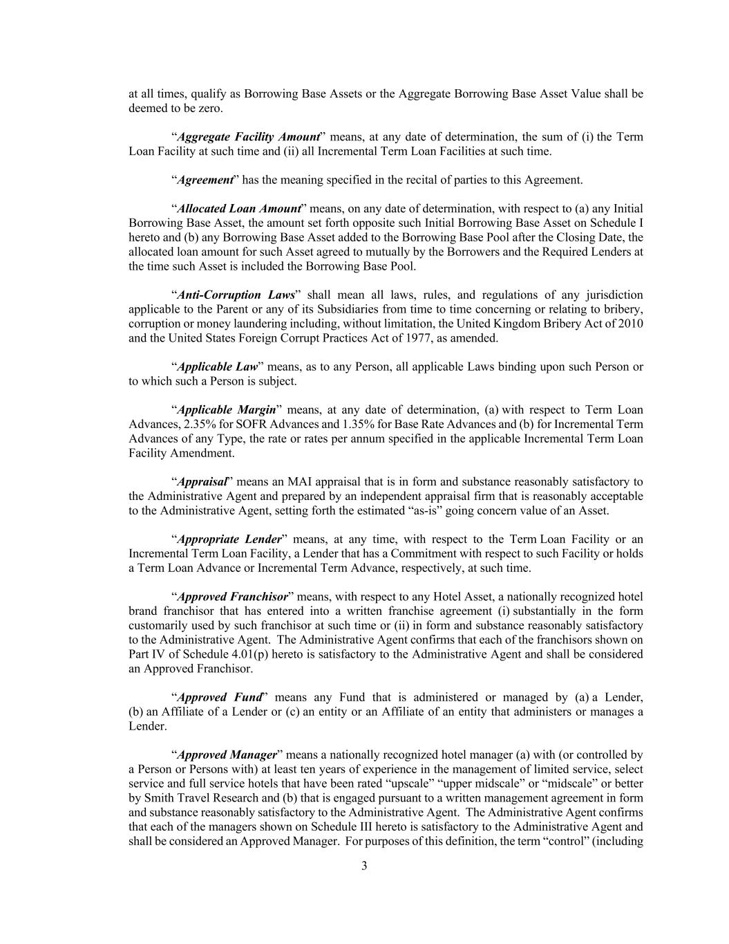 3 at all times, qualify as Borrowing Base Assets or the Aggregate Borrowing Base Asset Value shall be deemed to be zero. “Aggregate Facility Amount” means, at any date of determination, the sum of (i) the Term Loan Facility at such time and (ii) all Incremental Term Loan Facilities at such time. “Agreement” has the meaning specified in the recital of parties to this Agreement. “Allocated Loan Amount” means, on any date of determination, with respect to (a) any Initial Borrowing Base Asset, the amount set forth opposite such Initial Borrowing Base Asset on Schedule I hereto and (b) any Borrowing Base Asset added to the Borrowing Base Pool after the Closing Date, the allocated loan amount for such Asset agreed to mutually by the Borrowers and the Required Lenders at the time such Asset is included the Borrowing Base Pool. “Anti-Corruption Laws” shall mean all laws, rules, and regulations of any jurisdiction applicable to the Parent or any of its Subsidiaries from time to time concerning or relating to bribery, corruption or money laundering including, without limitation, the United Kingdom Bribery Act of 2010 and the United States Foreign Corrupt Practices Act of 1977, as amended. “Applicable Law” means, as to any Person, all applicable Laws binding upon such Person or to which such a Person is subject. “Applicable Margin” means, at any date of determination, (a) with respect to Term Loan Advances, 2.35% for SOFR Advances and 1.35% for Base Rate Advances and (b) for Incremental Term Advances of any Type, the rate or rates per annum specified in the applicable Incremental Term Loan Facility Amendment. “Appraisal” means an MAI appraisal that is in form and substance reasonably satisfactory to the Administrative Agent and prepared by an independent appraisal firm that is reasonably acceptable to the Administrative Agent, setting forth the estimated “as-is” going concern value of an Asset. “Appropriate Lender” means, at any time, with respect to the Term Loan Facility or an Incremental Term Loan Facility, a Lender that has a Commitment with respect to such Facility or holds a Term Loan Advance or Incremental Term Advance, respectively, at such time. “Approved Franchisor” means, with respect to any Hotel Asset, a nationally recognized hotel brand franchisor that has entered into a written franchise agreement (i) substantially in the form customarily used by such franchisor at such time or (ii) in form and substance reasonably satisfactory to the Administrative Agent. The Administrative Agent confirms that each of the franchisors shown on Part IV of Schedule 4.01(p) hereto is satisfactory to the Administrative Agent and shall be considered an Approved Franchisor. “Approved Fund” means any Fund that is administered or managed by (a) a Lender, (b) an Affiliate of a Lender or (c) an entity or an Affiliate of an entity that administers or manages a Lender. “Approved Manager” means a nationally recognized hotel manager (a) with (or controlled by a Person or Persons with) at least ten years of experience in the management of limited service, select service and full service hotels that have been rated “upscale” “upper midscale” or “midscale” or better by Smith Travel Research and (b) that is engaged pursuant to a written management agreement in form and substance reasonably satisfactory to the Administrative Agent. The Administrative Agent confirms that each of the managers shown on Schedule III hereto is satisfactory to the Administrative Agent and shall be considered an Approved Manager. For purposes of this definition, the term “control” (including
