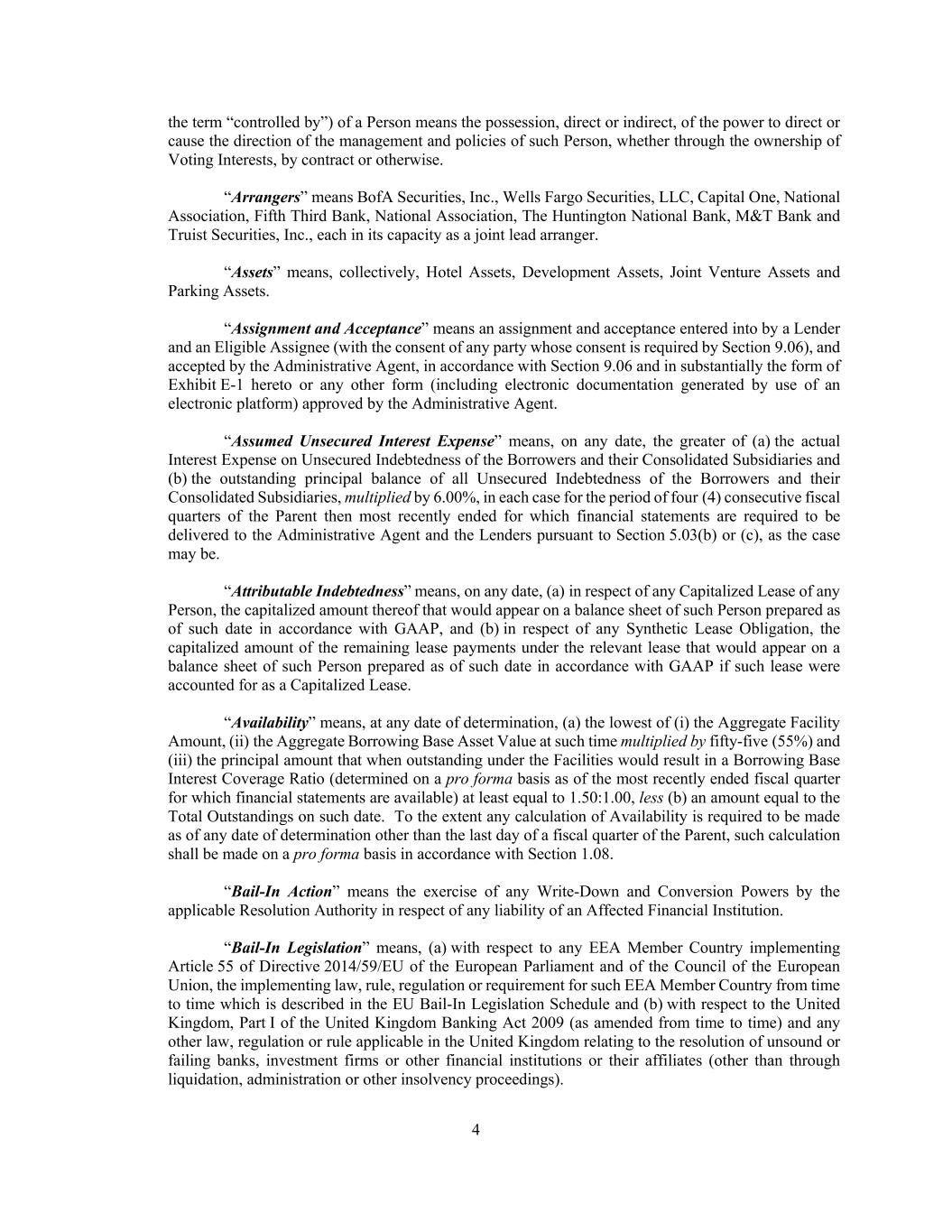 4 the term “controlled by”) of a Person means the possession, direct or indirect, of the power to direct or cause the direction of the management and policies of such Person, whether through the ownership of Voting Interests, by contract or otherwise. “Arrangers” means BofA Securities, Inc., Wells Fargo Securities, LLC, Capital One, National Association, Fifth Third Bank, National Association, The Huntington National Bank, M&T Bank and Truist Securities, Inc., each in its capacity as a joint lead arranger. “Assets” means, collectively, Hotel Assets, Development Assets, Joint Venture Assets and Parking Assets. “Assignment and Acceptance” means an assignment and acceptance entered into by a Lender and an Eligible Assignee (with the consent of any party whose consent is required by Section 9.06), and accepted by the Administrative Agent, in accordance with Section 9.06 and in substantially the form of Exhibit E-1 hereto or any other form (including electronic documentation generated by use of an electronic platform) approved by the Administrative Agent. “Assumed Unsecured Interest Expense” means, on any date, the greater of (a) the actual Interest Expense on Unsecured Indebtedness of the Borrowers and their Consolidated Subsidiaries and (b) the outstanding principal balance of all Unsecured Indebtedness of the Borrowers and their Consolidated Subsidiaries, multiplied by 6.00%, in each case for the period of four (4) consecutive fiscal quarters of the Parent then most recently ended for which financial statements are required to be delivered to the Administrative Agent and the Lenders pursuant to Section 5.03(b) or (c), as the case may be. “Attributable Indebtedness” means, on any date, (a) in respect of any Capitalized Lease of any Person, the capitalized amount thereof that would appear on a balance sheet of such Person prepared as of such date in accordance with GAAP, and (b) in respect of any Synthetic Lease Obligation, the capitalized amount of the remaining lease payments under the relevant lease that would appear on a balance sheet of such Person prepared as of such date in accordance with GAAP if such lease were accounted for as a Capitalized Lease. “Availability” means, at any date of determination, (a) the lowest of (i) the Aggregate Facility Amount, (ii) the Aggregate Borrowing Base Asset Value at such time multiplied by fifty-five (55%) and (iii) the principal amount that when outstanding under the Facilities would result in a Borrowing Base Interest Coverage Ratio (determined on a pro forma basis as of the most recently ended fiscal quarter for which financial statements are available) at least equal to 1.50:1.00, less (b) an amount equal to the Total Outstandings on such date. To the extent any calculation of Availability is required to be made as of any date of determination other than the last day of a fiscal quarter of the Parent, such calculation shall be made on a pro forma basis in accordance with Section 1.08. “Bail-In Action” means the exercise of any Write-Down and Conversion Powers by the applicable Resolution Authority in respect of any liability of an Affected Financial Institution. “Bail-In Legislation” means, (a) with respect to any EEA Member Country implementing Article 55 of Directive 2014/59/EU of the European Parliament and of the Council of the European Union, the implementing law, rule, regulation or requirement for such EEA Member Country from time to time which is described in the EU Bail-In Legislation Schedule and (b) with respect to the United Kingdom, Part I of the United Kingdom Banking Act 2009 (as amended from time to time) and any other law, regulation or rule applicable in the United Kingdom relating to the resolution of unsound or failing banks, investment firms or other financial institutions or their affiliates (other than through liquidation, administration or other insolvency proceedings).