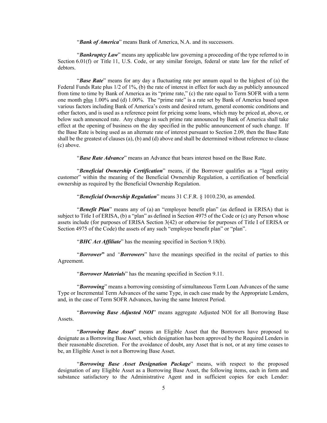 5 “Bank of America” means Bank of America, N.A. and its successors. “Bankruptcy Law” means any applicable law governing a proceeding of the type referred to in Section 6.01(f) or Title 11, U.S. Code, or any similar foreign, federal or state law for the relief of debtors. “Base Rate” means for any day a fluctuating rate per annum equal to the highest of (a) the Federal Funds Rate plus 1/2 of 1%, (b) the rate of interest in effect for such day as publicly announced from time to time by Bank of America as its “prime rate,” (c) the rate equal to Term SOFR with a term one month plus 1.00% and (d) 1.00%. The “prime rate” is a rate set by Bank of America based upon various factors including Bank of America’s costs and desired return, general economic conditions and other factors, and is used as a reference point for pricing some loans, which may be priced at, above, or below such announced rate. Any change in such prime rate announced by Bank of America shall take effect at the opening of business on the day specified in the public announcement of such change. If the Base Rate is being used as an alternate rate of interest pursuant to Section 2.09, then the Base Rate shall be the greatest of clauses (a), (b) and (d) above and shall be determined without reference to clause (c) above. “Base Rate Advance” means an Advance that bears interest based on the Base Rate. “Beneficial Ownership Certification” means, if the Borrower qualifies as a “legal entity customer” within the meaning of the Beneficial Ownership Regulation, a certification of beneficial ownership as required by the Beneficial Ownership Regulation. “Beneficial Ownership Regulation” means 31 C.F.R. § 1010.230, as amended. “Benefit Plan” means any of (a) an “employee benefit plan” (as defined in ERISA) that is subject to Title I of ERISA, (b) a “plan” as defined in Section 4975 of the Code or (c) any Person whose assets include (for purposes of ERISA Section 3(42) or otherwise for purposes of Title I of ERISA or Section 4975 of the Code) the assets of any such “employee benefit plan” or “plan”. “BHC Act Affiliate” has the meaning specified in Section 9.18(b). “Borrower” and “Borrowers” have the meanings specified in the recital of parties to this Agreement. “Borrower Materials” has the meaning specified in Section 9.11. “Borrowing” means a borrowing consisting of simultaneous Term Loan Advances of the same Type or Incremental Term Advances of the same Type, in each case made by the Appropriate Lenders, and, in the case of Term SOFR Advances, having the same Interest Period. “Borrowing Base Adjusted NOI” means aggregate Adjusted NOI for all Borrowing Base Assets. “Borrowing Base Asset” means an Eligible Asset that the Borrowers have proposed to designate as a Borrowing Base Asset, which designation has been approved by the Required Lenders in their reasonable discretion. For the avoidance of doubt, any Asset that is not, or at any time ceases to be, an Eligible Asset is not a Borrowing Base Asset. “Borrowing Base Asset Designation Package” means, with respect to the proposed designation of any Eligible Asset as a Borrowing Base Asset, the following items, each in form and substance satisfactory to the Administrative Agent and in sufficient copies for each Lender: