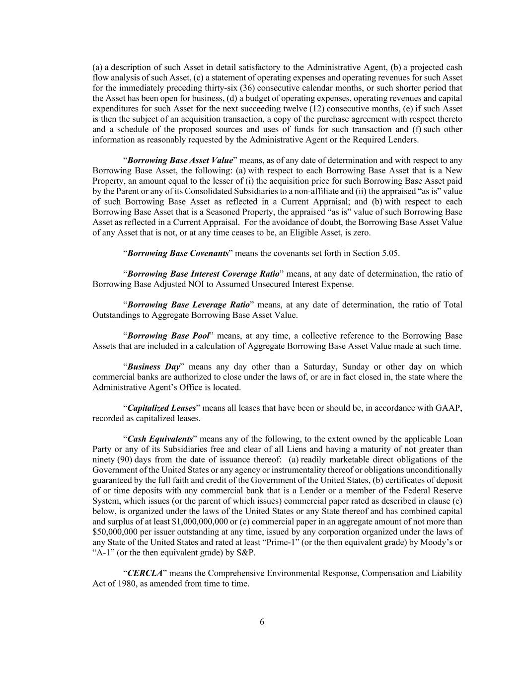 6 (a) a description of such Asset in detail satisfactory to the Administrative Agent, (b) a projected cash flow analysis of such Asset, (c) a statement of operating expenses and operating revenues for such Asset for the immediately preceding thirty-six (36) consecutive calendar months, or such shorter period that the Asset has been open for business, (d) a budget of operating expenses, operating revenues and capital expenditures for such Asset for the next succeeding twelve (12) consecutive months, (e) if such Asset is then the subject of an acquisition transaction, a copy of the purchase agreement with respect thereto and a schedule of the proposed sources and uses of funds for such transaction and (f) such other information as reasonably requested by the Administrative Agent or the Required Lenders. “Borrowing Base Asset Value” means, as of any date of determination and with respect to any Borrowing Base Asset, the following: (a) with respect to each Borrowing Base Asset that is a New Property, an amount equal to the lesser of (i) the acquisition price for such Borrowing Base Asset paid by the Parent or any of its Consolidated Subsidiaries to a non-affiliate and (ii) the appraised “as is” value of such Borrowing Base Asset as reflected in a Current Appraisal; and (b) with respect to each Borrowing Base Asset that is a Seasoned Property, the appraised “as is” value of such Borrowing Base Asset as reflected in a Current Appraisal. For the avoidance of doubt, the Borrowing Base Asset Value of any Asset that is not, or at any time ceases to be, an Eligible Asset, is zero. “Borrowing Base Covenants” means the covenants set forth in Section 5.05. “Borrowing Base Interest Coverage Ratio” means, at any date of determination, the ratio of Borrowing Base Adjusted NOI to Assumed Unsecured Interest Expense. “Borrowing Base Leverage Ratio” means, at any date of determination, the ratio of Total Outstandings to Aggregate Borrowing Base Asset Value. “Borrowing Base Pool” means, at any time, a collective reference to the Borrowing Base Assets that are included in a calculation of Aggregate Borrowing Base Asset Value made at such time. “Business Day” means any day other than a Saturday, Sunday or other day on which commercial banks are authorized to close under the laws of, or are in fact closed in, the state where the Administrative Agent’s Office is located. “Capitalized Leases” means all leases that have been or should be, in accordance with GAAP, recorded as capitalized leases. “Cash Equivalents” means any of the following, to the extent owned by the applicable Loan Party or any of its Subsidiaries free and clear of all Liens and having a maturity of not greater than ninety (90) days from the date of issuance thereof: (a) readily marketable direct obligations of the Government of the United States or any agency or instrumentality thereof or obligations unconditionally guaranteed by the full faith and credit of the Government of the United States, (b) certificates of deposit of or time deposits with any commercial bank that is a Lender or a member of the Federal Reserve System, which issues (or the parent of which issues) commercial paper rated as described in clause (c) below, is organized under the laws of the United States or any State thereof and has combined capital and surplus of at least $1,000,000,000 or (c) commercial paper in an aggregate amount of not more than $50,000,000 per issuer outstanding at any time, issued by any corporation organized under the laws of any State of the United States and rated at least “Prime-1” (or the then equivalent grade) by Moody’s or “A-1” (or the then equivalent grade) by S&P. “CERCLA” means the Comprehensive Environmental Response, Compensation and Liability Act of 1980, as amended from time to time.