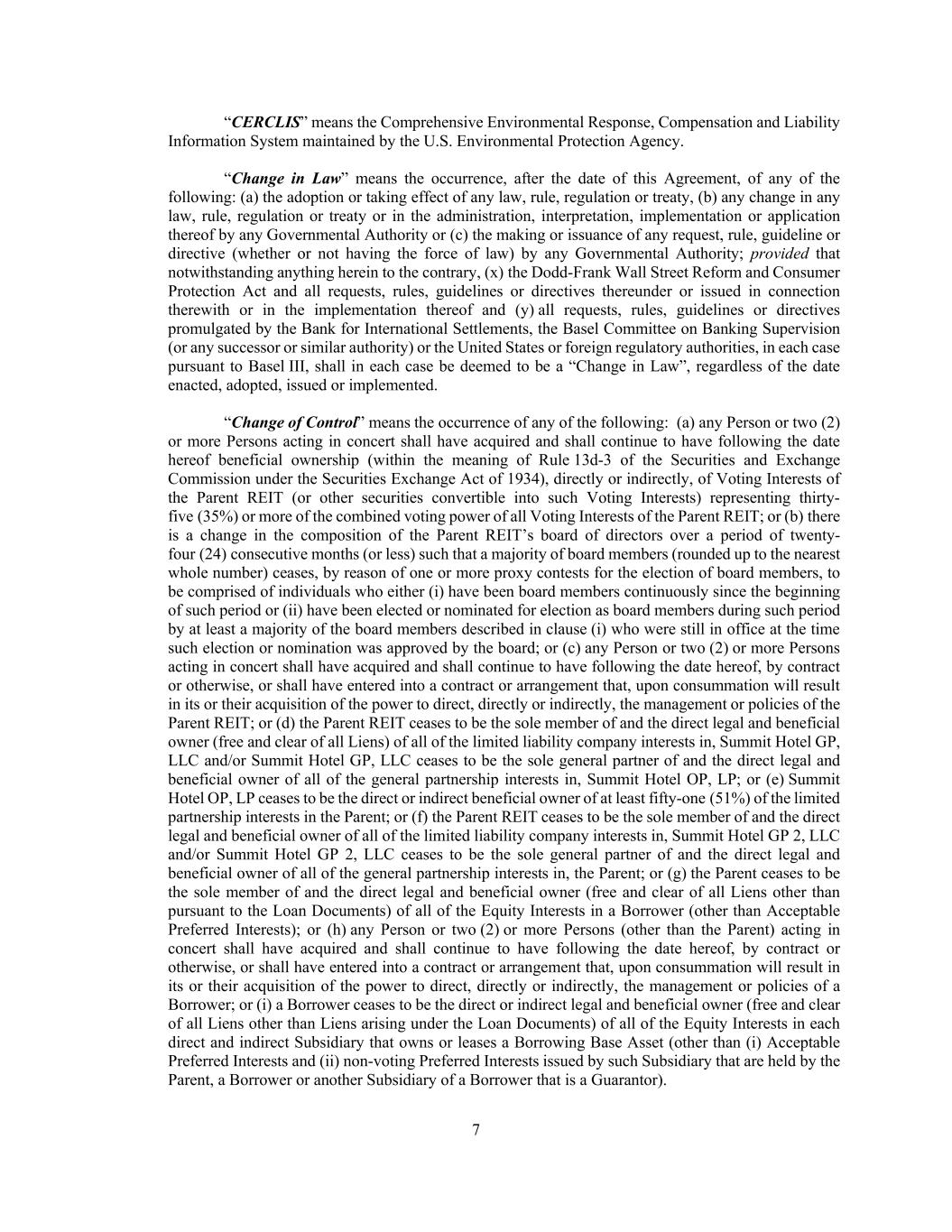 7 “CERCLIS” means the Comprehensive Environmental Response, Compensation and Liability Information System maintained by the U.S. Environmental Protection Agency. “Change in Law” means the occurrence, after the date of this Agreement, of any of the following: (a) the adoption or taking effect of any law, rule, regulation or treaty, (b) any change in any law, rule, regulation or treaty or in the administration, interpretation, implementation or application thereof by any Governmental Authority or (c) the making or issuance of any request, rule, guideline or directive (whether or not having the force of law) by any Governmental Authority; provided that notwithstanding anything herein to the contrary, (x) the Dodd-Frank Wall Street Reform and Consumer Protection Act and all requests, rules, guidelines or directives thereunder or issued in connection therewith or in the implementation thereof and (y) all requests, rules, guidelines or directives promulgated by the Bank for International Settlements, the Basel Committee on Banking Supervision (or any successor or similar authority) or the United States or foreign regulatory authorities, in each case pursuant to Basel III, shall in each case be deemed to be a “Change in Law”, regardless of the date enacted, adopted, issued or implemented. “Change of Control” means the occurrence of any of the following: (a) any Person or two (2) or more Persons acting in concert shall have acquired and shall continue to have following the date hereof beneficial ownership (within the meaning of Rule 13d-3 of the Securities and Exchange Commission under the Securities Exchange Act of 1934), directly or indirectly, of Voting Interests of the Parent REIT (or other securities convertible into such Voting Interests) representing thirty- five (35%) or more of the combined voting power of all Voting Interests of the Parent REIT; or (b) there is a change in the composition of the Parent REIT’s board of directors over a period of twenty- four (24) consecutive months (or less) such that a majority of board members (rounded up to the nearest whole number) ceases, by reason of one or more proxy contests for the election of board members, to be comprised of individuals who either (i) have been board members continuously since the beginning of such period or (ii) have been elected or nominated for election as board members during such period by at least a majority of the board members described in clause (i) who were still in office at the time such election or nomination was approved by the board; or (c) any Person or two (2) or more Persons acting in concert shall have acquired and shall continue to have following the date hereof, by contract or otherwise, or shall have entered into a contract or arrangement that, upon consummation will result in its or their acquisition of the power to direct, directly or indirectly, the management or policies of the Parent REIT; or (d) the Parent REIT ceases to be the sole member of and the direct legal and beneficial owner (free and clear of all Liens) of all of the limited liability company interests in, Summit Hotel GP, LLC and/or Summit Hotel GP, LLC ceases to be the sole general partner of and the direct legal and beneficial owner of all of the general partnership interests in, Summit Hotel OP, LP; or (e) Summit Hotel OP, LP ceases to be the direct or indirect beneficial owner of at least fifty-one (51%) of the limited partnership interests in the Parent; or (f) the Parent REIT ceases to be the sole member of and the direct legal and beneficial owner of all of the limited liability company interests in, Summit Hotel GP 2, LLC and/or Summit Hotel GP 2, LLC ceases to be the sole general partner of and the direct legal and beneficial owner of all of the general partnership interests in, the Parent; or (g) the Parent ceases to be the sole member of and the direct legal and beneficial owner (free and clear of all Liens other than pursuant to the Loan Documents) of all of the Equity Interests in a Borrower (other than Acceptable Preferred Interests); or (h) any Person or two (2) or more Persons (other than the Parent) acting in concert shall have acquired and shall continue to have following the date hereof, by contract or otherwise, or shall have entered into a contract or arrangement that, upon consummation will result in its or their acquisition of the power to direct, directly or indirectly, the management or policies of a Borrower; or (i) a Borrower ceases to be the direct or indirect legal and beneficial owner (free and clear of all Liens other than Liens arising under the Loan Documents) of all of the Equity Interests in each direct and indirect Subsidiary that owns or leases a Borrowing Base Asset (other than (i) Acceptable Preferred Interests and (ii) non-voting Preferred Interests issued by such Subsidiary that are held by the Parent, a Borrower or another Subsidiary of a Borrower that is a Guarantor).