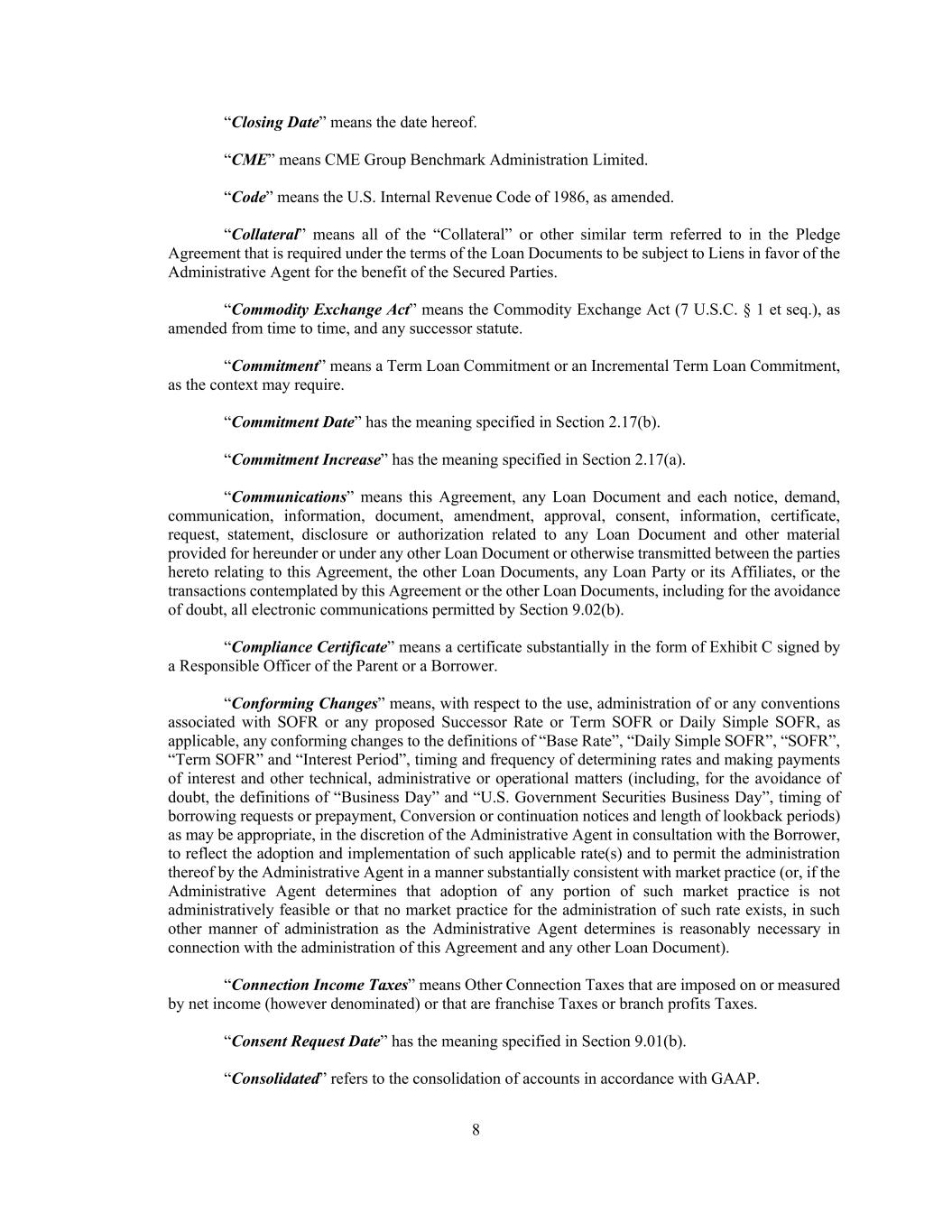 8 “Closing Date” means the date hereof. “CME” means CME Group Benchmark Administration Limited. “Code” means the U.S. Internal Revenue Code of 1986, as amended. “Collateral” means all of the “Collateral” or other similar term referred to in the Pledge Agreement that is required under the terms of the Loan Documents to be subject to Liens in favor of the Administrative Agent for the benefit of the Secured Parties. “Commodity Exchange Act” means the Commodity Exchange Act (7 U.S.C. § 1 et seq.), as amended from time to time, and any successor statute. “Commitment” means a Term Loan Commitment or an Incremental Term Loan Commitment, as the context may require. “Commitment Date” has the meaning specified in Section 2.17(b). “Commitment Increase” has the meaning specified in Section 2.17(a). “Communications” means this Agreement, any Loan Document and each notice, demand, communication, information, document, amendment, approval, consent, information, certificate, request, statement, disclosure or authorization related to any Loan Document and other material provided for hereunder or under any other Loan Document or otherwise transmitted between the parties hereto relating to this Agreement, the other Loan Documents, any Loan Party or its Affiliates, or the transactions contemplated by this Agreement or the other Loan Documents, including for the avoidance of doubt, all electronic communications permitted by Section 9.02(b). “Compliance Certificate” means a certificate substantially in the form of Exhibit C signed by a Responsible Officer of the Parent or a Borrower. “Conforming Changes” means, with respect to the use, administration of or any conventions associated with SOFR or any proposed Successor Rate or Term SOFR or Daily Simple SOFR, as applicable, any conforming changes to the definitions of “Base Rate”, “Daily Simple SOFR”, “SOFR”, “Term SOFR” and “Interest Period”, timing and frequency of determining rates and making payments of interest and other technical, administrative or operational matters (including, for the avoidance of doubt, the definitions of “Business Day” and “U.S. Government Securities Business Day”, timing of borrowing requests or prepayment, Conversion or continuation notices and length of lookback periods) as may be appropriate, in the discretion of the Administrative Agent in consultation with the Borrower, to reflect the adoption and implementation of such applicable rate(s) and to permit the administration thereof by the Administrative Agent in a manner substantially consistent with market practice (or, if the Administrative Agent determines that adoption of any portion of such market practice is not administratively feasible or that no market practice for the administration of such rate exists, in such other manner of administration as the Administrative Agent determines is reasonably necessary in connection with the administration of this Agreement and any other Loan Document). “Connection Income Taxes” means Other Connection Taxes that are imposed on or measured by net income (however denominated) or that are franchise Taxes or branch profits Taxes. “Consent Request Date” has the meaning specified in Section 9.01(b). “Consolidated” refers to the consolidation of accounts in accordance with GAAP.