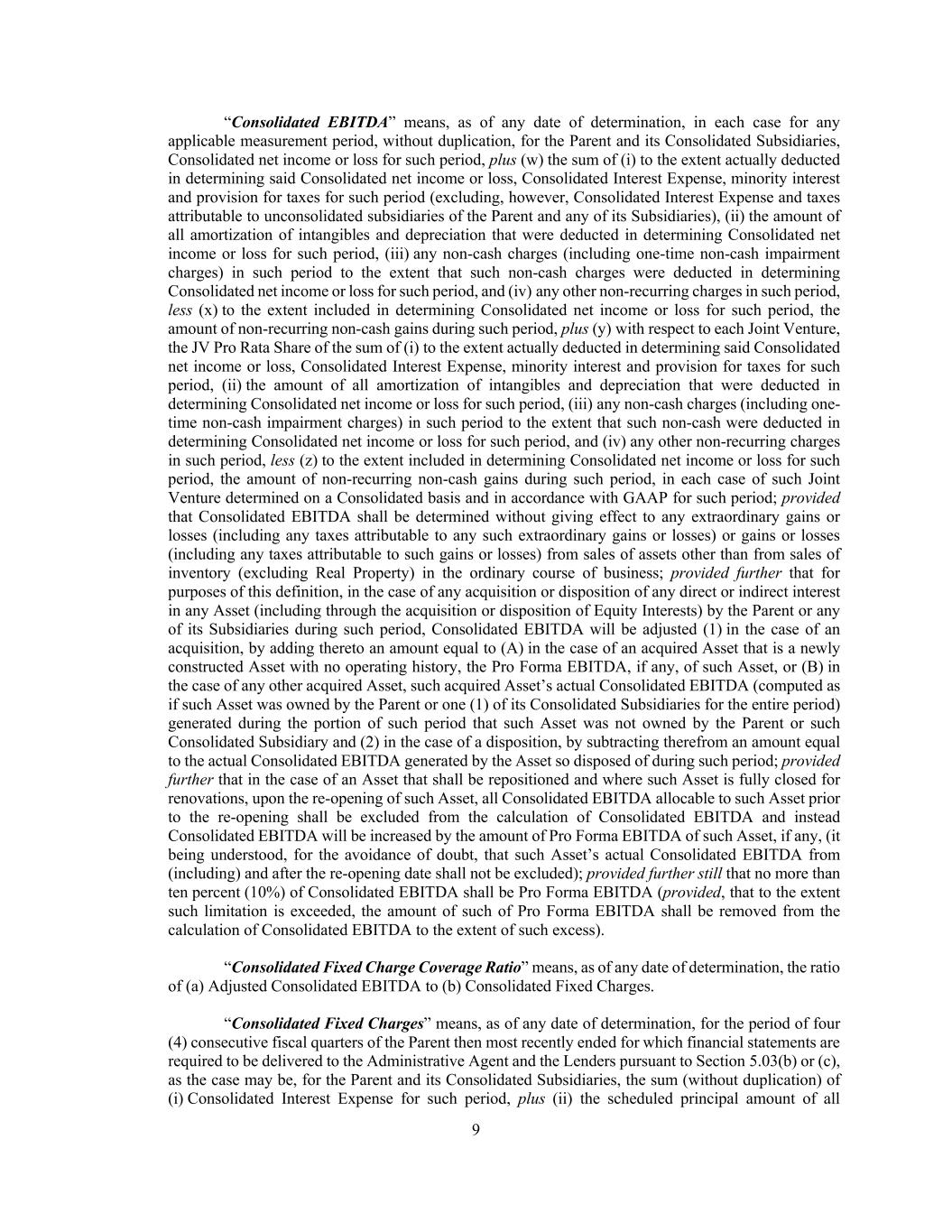9 “Consolidated EBITDA” means, as of any date of determination, in each case for any applicable measurement period, without duplication, for the Parent and its Consolidated Subsidiaries, Consolidated net income or loss for such period, plus (w) the sum of (i) to the extent actually deducted in determining said Consolidated net income or loss, Consolidated Interest Expense, minority interest and provision for taxes for such period (excluding, however, Consolidated Interest Expense and taxes attributable to unconsolidated subsidiaries of the Parent and any of its Subsidiaries), (ii) the amount of all amortization of intangibles and depreciation that were deducted in determining Consolidated net income or loss for such period, (iii) any non-cash charges (including one-time non-cash impairment charges) in such period to the extent that such non-cash charges were deducted in determining Consolidated net income or loss for such period, and (iv) any other non-recurring charges in such period, less (x) to the extent included in determining Consolidated net income or loss for such period, the amount of non-recurring non-cash gains during such period, plus (y) with respect to each Joint Venture, the JV Pro Rata Share of the sum of (i) to the extent actually deducted in determining said Consolidated net income or loss, Consolidated Interest Expense, minority interest and provision for taxes for such period, (ii) the amount of all amortization of intangibles and depreciation that were deducted in determining Consolidated net income or loss for such period, (iii) any non-cash charges (including one- time non-cash impairment charges) in such period to the extent that such non-cash were deducted in determining Consolidated net income or loss for such period, and (iv) any other non-recurring charges in such period, less (z) to the extent included in determining Consolidated net income or loss for such period, the amount of non-recurring non-cash gains during such period, in each case of such Joint Venture determined on a Consolidated basis and in accordance with GAAP for such period; provided that Consolidated EBITDA shall be determined without giving effect to any extraordinary gains or losses (including any taxes attributable to any such extraordinary gains or losses) or gains or losses (including any taxes attributable to such gains or losses) from sales of assets other than from sales of inventory (excluding Real Property) in the ordinary course of business; provided further that for purposes of this definition, in the case of any acquisition or disposition of any direct or indirect interest in any Asset (including through the acquisition or disposition of Equity Interests) by the Parent or any of its Subsidiaries during such period, Consolidated EBITDA will be adjusted (1) in the case of an acquisition, by adding thereto an amount equal to (A) in the case of an acquired Asset that is a newly constructed Asset with no operating history, the Pro Forma EBITDA, if any, of such Asset, or (B) in the case of any other acquired Asset, such acquired Asset’s actual Consolidated EBITDA (computed as if such Asset was owned by the Parent or one (1) of its Consolidated Subsidiaries for the entire period) generated during the portion of such period that such Asset was not owned by the Parent or such Consolidated Subsidiary and (2) in the case of a disposition, by subtracting therefrom an amount equal to the actual Consolidated EBITDA generated by the Asset so disposed of during such period; provided further that in the case of an Asset that shall be repositioned and where such Asset is fully closed for renovations, upon the re-opening of such Asset, all Consolidated EBITDA allocable to such Asset prior to the re-opening shall be excluded from the calculation of Consolidated EBITDA and instead Consolidated EBITDA will be increased by the amount of Pro Forma EBITDA of such Asset, if any, (it being understood, for the avoidance of doubt, that such Asset’s actual Consolidated EBITDA from (including) and after the re-opening date shall not be excluded); provided further still that no more than ten percent (10%) of Consolidated EBITDA shall be Pro Forma EBITDA (provided, that to the extent such limitation is exceeded, the amount of such of Pro Forma EBITDA shall be removed from the calculation of Consolidated EBITDA to the extent of such excess). “Consolidated Fixed Charge Coverage Ratio” means, as of any date of determination, the ratio of (a) Adjusted Consolidated EBITDA to (b) Consolidated Fixed Charges. “Consolidated Fixed Charges” means, as of any date of determination, for the period of four (4) consecutive fiscal quarters of the Parent then most recently ended for which financial statements are required to be delivered to the Administrative Agent and the Lenders pursuant to Section 5.03(b) or (c), as the case may be, for the Parent and its Consolidated Subsidiaries, the sum (without duplication) of (i) Consolidated Interest Expense for such period, plus (ii) the scheduled principal amount of all