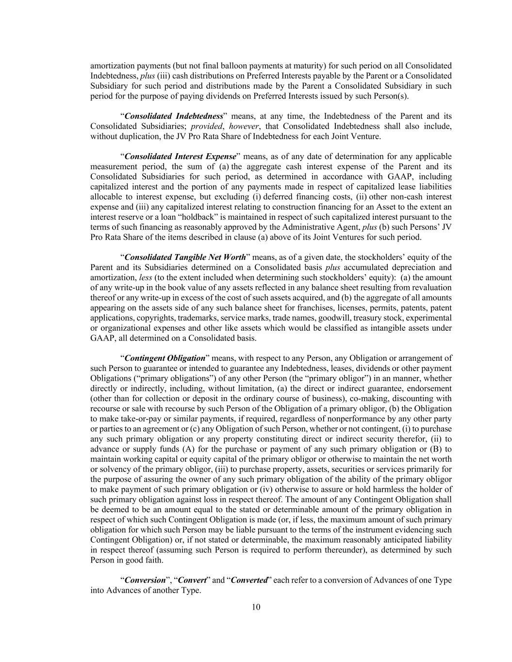 10 amortization payments (but not final balloon payments at maturity) for such period on all Consolidated Indebtedness, plus (iii) cash distributions on Preferred Interests payable by the Parent or a Consolidated Subsidiary for such period and distributions made by the Parent a Consolidated Subsidiary in such period for the purpose of paying dividends on Preferred Interests issued by such Person(s). “Consolidated Indebtedness” means, at any time, the Indebtedness of the Parent and its Consolidated Subsidiaries; provided, however, that Consolidated Indebtedness shall also include, without duplication, the JV Pro Rata Share of Indebtedness for each Joint Venture. “Consolidated Interest Expense” means, as of any date of determination for any applicable measurement period, the sum of (a) the aggregate cash interest expense of the Parent and its Consolidated Subsidiaries for such period, as determined in accordance with GAAP, including capitalized interest and the portion of any payments made in respect of capitalized lease liabilities allocable to interest expense, but excluding (i) deferred financing costs, (ii) other non-cash interest expense and (iii) any capitalized interest relating to construction financing for an Asset to the extent an interest reserve or a loan “holdback” is maintained in respect of such capitalized interest pursuant to the terms of such financing as reasonably approved by the Administrative Agent, plus (b) such Persons’ JV Pro Rata Share of the items described in clause (a) above of its Joint Ventures for such period. “Consolidated Tangible Net Worth” means, as of a given date, the stockholders’ equity of the Parent and its Subsidiaries determined on a Consolidated basis plus accumulated depreciation and amortization, less (to the extent included when determining such stockholders’ equity): (a) the amount of any write-up in the book value of any assets reflected in any balance sheet resulting from revaluation thereof or any write-up in excess of the cost of such assets acquired, and (b) the aggregate of all amounts appearing on the assets side of any such balance sheet for franchises, licenses, permits, patents, patent applications, copyrights, trademarks, service marks, trade names, goodwill, treasury stock, experimental or organizational expenses and other like assets which would be classified as intangible assets under GAAP, all determined on a Consolidated basis. “Contingent Obligation” means, with respect to any Person, any Obligation or arrangement of such Person to guarantee or intended to guarantee any Indebtedness, leases, dividends or other payment Obligations (“primary obligations”) of any other Person (the “primary obligor”) in an manner, whether directly or indirectly, including, without limitation, (a) the direct or indirect guarantee, endorsement (other than for collection or deposit in the ordinary course of business), co-making, discounting with recourse or sale with recourse by such Person of the Obligation of a primary obligor, (b) the Obligation to make take-or-pay or similar payments, if required, regardless of nonperformance by any other party or parties to an agreement or (c) any Obligation of such Person, whether or not contingent, (i) to purchase any such primary obligation or any property constituting direct or indirect security therefor, (ii) to advance or supply funds (A) for the purchase or payment of any such primary obligation or (B) to maintain working capital or equity capital of the primary obligor or otherwise to maintain the net worth or solvency of the primary obligor, (iii) to purchase property, assets, securities or services primarily for the purpose of assuring the owner of any such primary obligation of the ability of the primary obligor to make payment of such primary obligation or (iv) otherwise to assure or hold harmless the holder of such primary obligation against loss in respect thereof. The amount of any Contingent Obligation shall be deemed to be an amount equal to the stated or determinable amount of the primary obligation in respect of which such Contingent Obligation is made (or, if less, the maximum amount of such primary obligation for which such Person may be liable pursuant to the terms of the instrument evidencing such Contingent Obligation) or, if not stated or determinable, the maximum reasonably anticipated liability in respect thereof (assuming such Person is required to perform thereunder), as determined by such Person in good faith. “Conversion”, “Convert” and “Converted” each refer to a conversion of Advances of one Type into Advances of another Type.