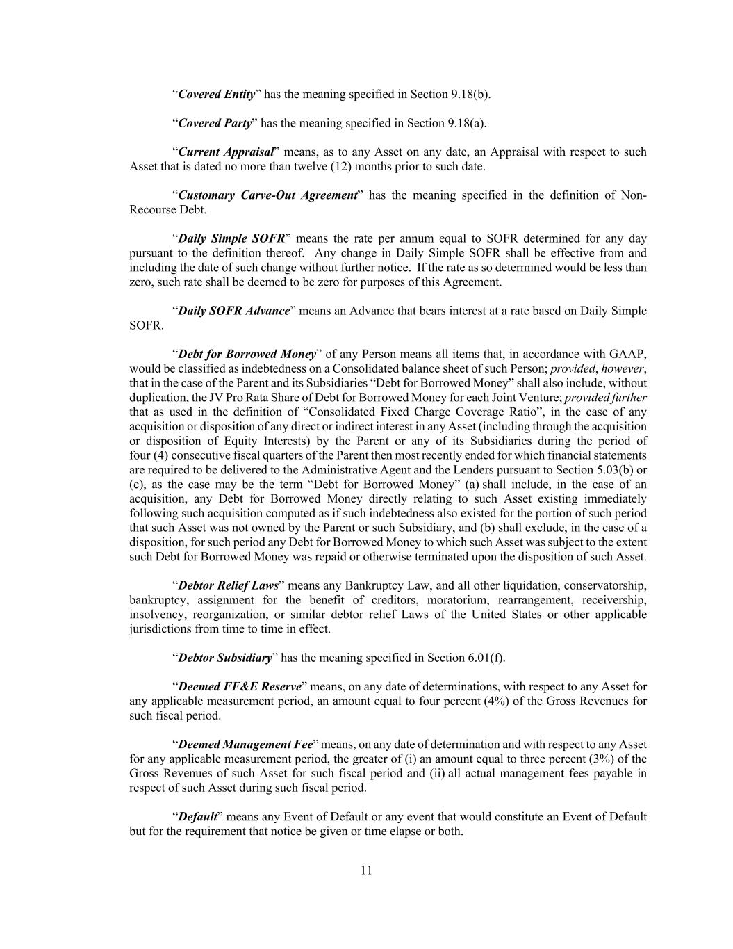 11 “Covered Entity” has the meaning specified in Section 9.18(b). “Covered Party” has the meaning specified in Section 9.18(a). “Current Appraisal” means, as to any Asset on any date, an Appraisal with respect to such Asset that is dated no more than twelve (12) months prior to such date. “Customary Carve-Out Agreement” has the meaning specified in the definition of Non- Recourse Debt. “Daily Simple SOFR” means the rate per annum equal to SOFR determined for any day pursuant to the definition thereof. Any change in Daily Simple SOFR shall be effective from and including the date of such change without further notice. If the rate as so determined would be less than zero, such rate shall be deemed to be zero for purposes of this Agreement. “Daily SOFR Advance” means an Advance that bears interest at a rate based on Daily Simple SOFR. “Debt for Borrowed Money” of any Person means all items that, in accordance with GAAP, would be classified as indebtedness on a Consolidated balance sheet of such Person; provided, however, that in the case of the Parent and its Subsidiaries “Debt for Borrowed Money” shall also include, without duplication, the JV Pro Rata Share of Debt for Borrowed Money for each Joint Venture; provided further that as used in the definition of “Consolidated Fixed Charge Coverage Ratio”, in the case of any acquisition or disposition of any direct or indirect interest in any Asset (including through the acquisition or disposition of Equity Interests) by the Parent or any of its Subsidiaries during the period of four (4) consecutive fiscal quarters of the Parent then most recently ended for which financial statements are required to be delivered to the Administrative Agent and the Lenders pursuant to Section 5.03(b) or (c), as the case may be the term “Debt for Borrowed Money” (a) shall include, in the case of an acquisition, any Debt for Borrowed Money directly relating to such Asset existing immediately following such acquisition computed as if such indebtedness also existed for the portion of such period that such Asset was not owned by the Parent or such Subsidiary, and (b) shall exclude, in the case of a disposition, for such period any Debt for Borrowed Money to which such Asset was subject to the extent such Debt for Borrowed Money was repaid or otherwise terminated upon the disposition of such Asset. “Debtor Relief Laws” means any Bankruptcy Law, and all other liquidation, conservatorship, bankruptcy, assignment for the benefit of creditors, moratorium, rearrangement, receivership, insolvency, reorganization, or similar debtor relief Laws of the United States or other applicable jurisdictions from time to time in effect. “Debtor Subsidiary” has the meaning specified in Section 6.01(f). “Deemed FF&E Reserve” means, on any date of determinations, with respect to any Asset for any applicable measurement period, an amount equal to four percent (4%) of the Gross Revenues for such fiscal period. “Deemed Management Fee” means, on any date of determination and with respect to any Asset for any applicable measurement period, the greater of (i) an amount equal to three percent (3%) of the Gross Revenues of such Asset for such fiscal period and (ii) all actual management fees payable in respect of such Asset during such fiscal period. “Default” means any Event of Default or any event that would constitute an Event of Default but for the requirement that notice be given or time elapse or both.