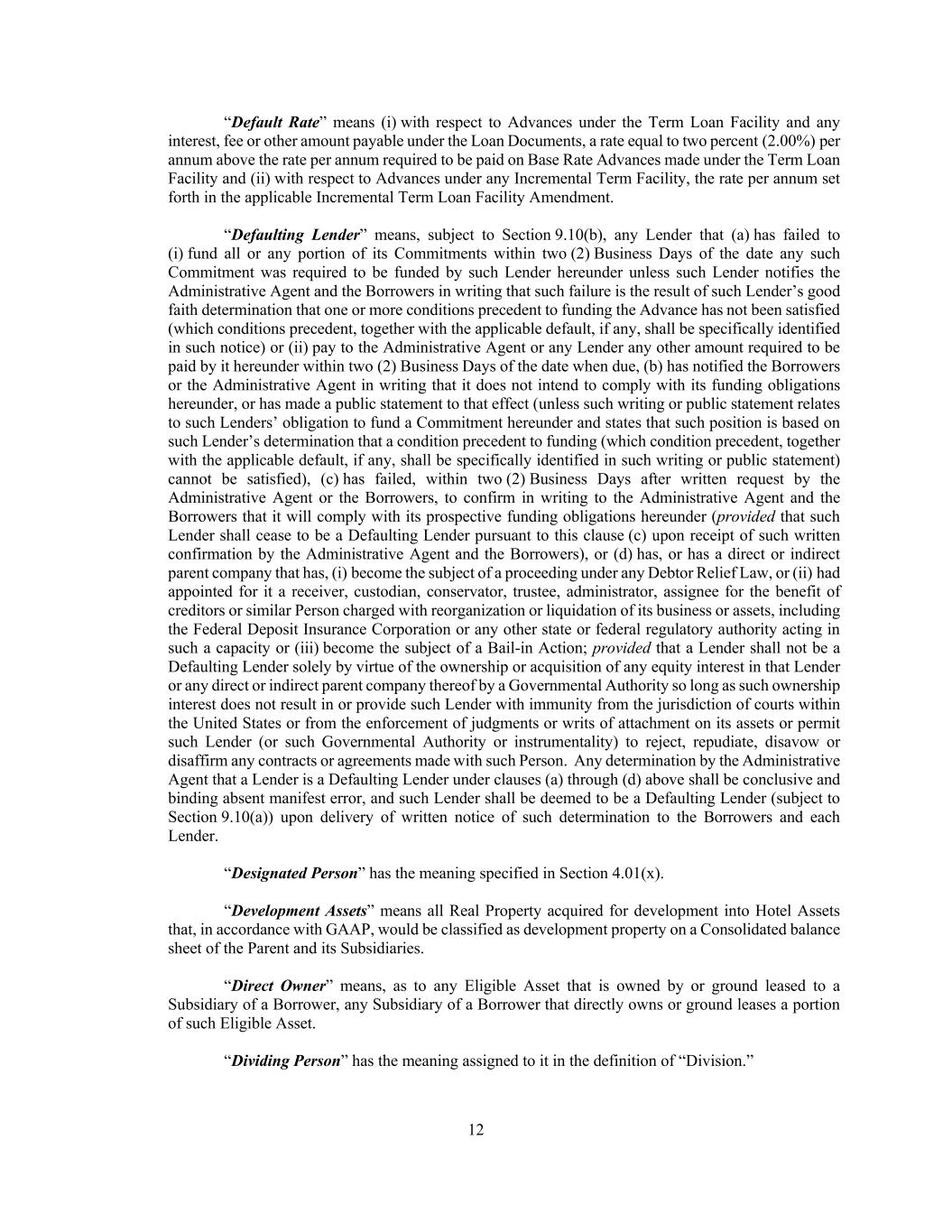 12 “Default Rate” means (i) with respect to Advances under the Term Loan Facility and any interest, fee or other amount payable under the Loan Documents, a rate equal to two percent (2.00%) per annum above the rate per annum required to be paid on Base Rate Advances made under the Term Loan Facility and (ii) with respect to Advances under any Incremental Term Facility, the rate per annum set forth in the applicable Incremental Term Loan Facility Amendment. “Defaulting Lender” means, subject to Section 9.10(b), any Lender that (a) has failed to (i) fund all or any portion of its Commitments within two (2) Business Days of the date any such Commitment was required to be funded by such Lender hereunder unless such Lender notifies the Administrative Agent and the Borrowers in writing that such failure is the result of such Lender’s good faith determination that one or more conditions precedent to funding the Advance has not been satisfied (which conditions precedent, together with the applicable default, if any, shall be specifically identified in such notice) or (ii) pay to the Administrative Agent or any Lender any other amount required to be paid by it hereunder within two (2) Business Days of the date when due, (b) has notified the Borrowers or the Administrative Agent in writing that it does not intend to comply with its funding obligations hereunder, or has made a public statement to that effect (unless such writing or public statement relates to such Lenders’ obligation to fund a Commitment hereunder and states that such position is based on such Lender’s determination that a condition precedent to funding (which condition precedent, together with the applicable default, if any, shall be specifically identified in such writing or public statement) cannot be satisfied), (c) has failed, within two (2) Business Days after written request by the Administrative Agent or the Borrowers, to confirm in writing to the Administrative Agent and the Borrowers that it will comply with its prospective funding obligations hereunder (provided that such Lender shall cease to be a Defaulting Lender pursuant to this clause (c) upon receipt of such written confirmation by the Administrative Agent and the Borrowers), or (d) has, or has a direct or indirect parent company that has, (i) become the subject of a proceeding under any Debtor Relief Law, or (ii) had appointed for it a receiver, custodian, conservator, trustee, administrator, assignee for the benefit of creditors or similar Person charged with reorganization or liquidation of its business or assets, including the Federal Deposit Insurance Corporation or any other state or federal regulatory authority acting in such a capacity or (iii) become the subject of a Bail-in Action; provided that a Lender shall not be a Defaulting Lender solely by virtue of the ownership or acquisition of any equity interest in that Lender or any direct or indirect parent company thereof by a Governmental Authority so long as such ownership interest does not result in or provide such Lender with immunity from the jurisdiction of courts within the United States or from the enforcement of judgments or writs of attachment on its assets or permit such Lender (or such Governmental Authority or instrumentality) to reject, repudiate, disavow or disaffirm any contracts or agreements made with such Person. Any determination by the Administrative Agent that a Lender is a Defaulting Lender under clauses (a) through (d) above shall be conclusive and binding absent manifest error, and such Lender shall be deemed to be a Defaulting Lender (subject to Section 9.10(a)) upon delivery of written notice of such determination to the Borrowers and each Lender. “Designated Person” has the meaning specified in Section 4.01(x). “Development Assets” means all Real Property acquired for development into Hotel Assets that, in accordance with GAAP, would be classified as development property on a Consolidated balance sheet of the Parent and its Subsidiaries. “Direct Owner” means, as to any Eligible Asset that is owned by or ground leased to a Subsidiary of a Borrower, any Subsidiary of a Borrower that directly owns or ground leases a portion of such Eligible Asset. “Dividing Person” has the meaning assigned to it in the definition of “Division.”
