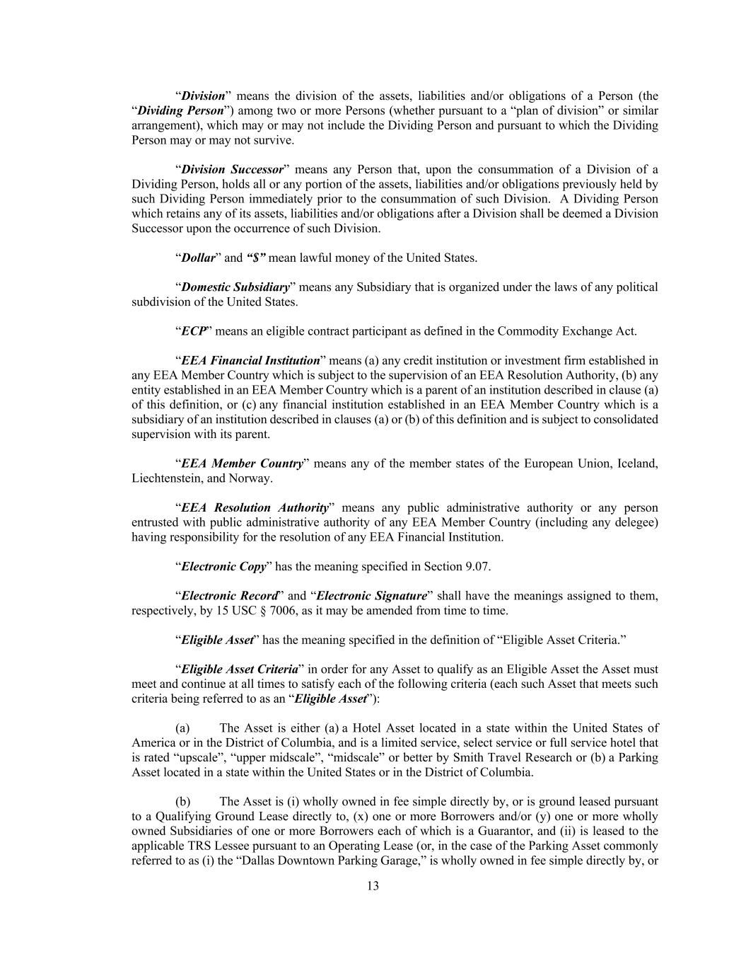 13 “Division” means the division of the assets, liabilities and/or obligations of a Person (the “Dividing Person”) among two or more Persons (whether pursuant to a “plan of division” or similar arrangement), which may or may not include the Dividing Person and pursuant to which the Dividing Person may or may not survive. “Division Successor” means any Person that, upon the consummation of a Division of a Dividing Person, holds all or any portion of the assets, liabilities and/or obligations previously held by such Dividing Person immediately prior to the consummation of such Division. A Dividing Person which retains any of its assets, liabilities and/or obligations after a Division shall be deemed a Division Successor upon the occurrence of such Division. “Dollar” and “$” mean lawful money of the United States. “Domestic Subsidiary” means any Subsidiary that is organized under the laws of any political subdivision of the United States. “ECP” means an eligible contract participant as defined in the Commodity Exchange Act. “EEA Financial Institution” means (a) any credit institution or investment firm established in any EEA Member Country which is subject to the supervision of an EEA Resolution Authority, (b) any entity established in an EEA Member Country which is a parent of an institution described in clause (a) of this definition, or (c) any financial institution established in an EEA Member Country which is a subsidiary of an institution described in clauses (a) or (b) of this definition and is subject to consolidated supervision with its parent. “EEA Member Country” means any of the member states of the European Union, Iceland, Liechtenstein, and Norway. “EEA Resolution Authority” means any public administrative authority or any person entrusted with public administrative authority of any EEA Member Country (including any delegee) having responsibility for the resolution of any EEA Financial Institution. “Electronic Copy” has the meaning specified in Section 9.07. “Electronic Record” and “Electronic Signature” shall have the meanings assigned to them, respectively, by 15 USC § 7006, as it may be amended from time to time. “Eligible Asset” has the meaning specified in the definition of “Eligible Asset Criteria.” “Eligible Asset Criteria” in order for any Asset to qualify as an Eligible Asset the Asset must meet and continue at all times to satisfy each of the following criteria (each such Asset that meets such criteria being referred to as an “Eligible Asset”): (a) The Asset is either (a) a Hotel Asset located in a state within the United States of America or in the District of Columbia, and is a limited service, select service or full service hotel that is rated “upscale”, “upper midscale”, “midscale” or better by Smith Travel Research or (b) a Parking Asset located in a state within the United States or in the District of Columbia. (b) The Asset is (i) wholly owned in fee simple directly by, or is ground leased pursuant to a Qualifying Ground Lease directly to, (x) one or more Borrowers and/or (y) one or more wholly owned Subsidiaries of one or more Borrowers each of which is a Guarantor, and (ii) is leased to the applicable TRS Lessee pursuant to an Operating Lease (or, in the case of the Parking Asset commonly referred to as (i) the “Dallas Downtown Parking Garage,” is wholly owned in fee simple directly by, or