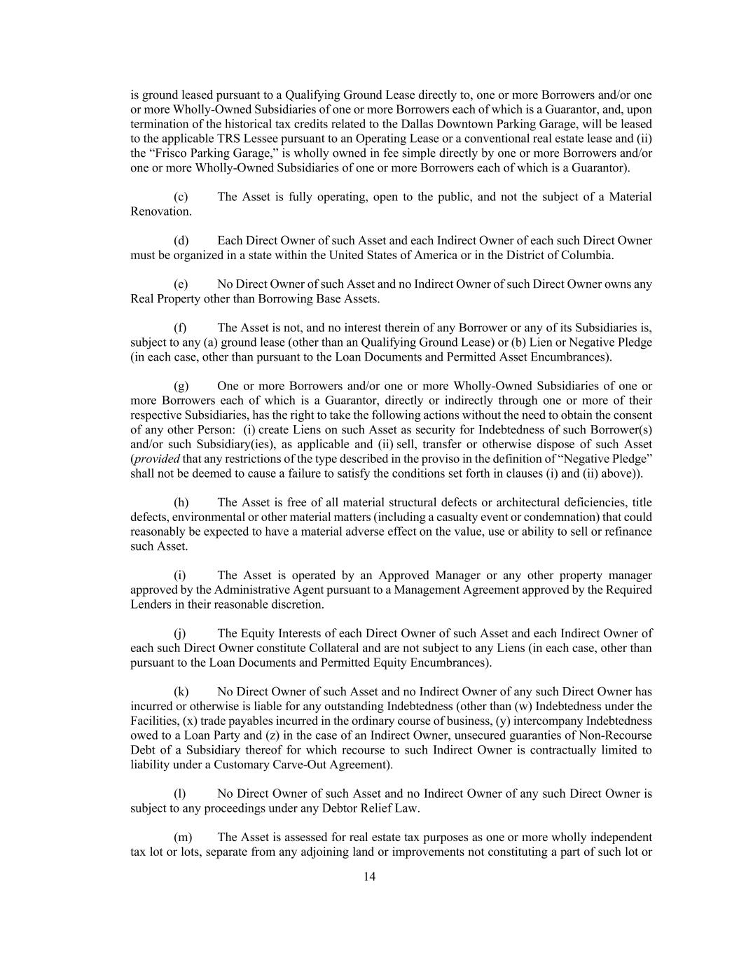 14 is ground leased pursuant to a Qualifying Ground Lease directly to, one or more Borrowers and/or one or more Wholly-Owned Subsidiaries of one or more Borrowers each of which is a Guarantor, and, upon termination of the historical tax credits related to the Dallas Downtown Parking Garage, will be leased to the applicable TRS Lessee pursuant to an Operating Lease or a conventional real estate lease and (ii) the “Frisco Parking Garage,” is wholly owned in fee simple directly by one or more Borrowers and/or one or more Wholly-Owned Subsidiaries of one or more Borrowers each of which is a Guarantor). (c) The Asset is fully operating, open to the public, and not the subject of a Material Renovation. (d) Each Direct Owner of such Asset and each Indirect Owner of each such Direct Owner must be organized in a state within the United States of America or in the District of Columbia. (e) No Direct Owner of such Asset and no Indirect Owner of such Direct Owner owns any Real Property other than Borrowing Base Assets. (f) The Asset is not, and no interest therein of any Borrower or any of its Subsidiaries is, subject to any (a) ground lease (other than an Qualifying Ground Lease) or (b) Lien or Negative Pledge (in each case, other than pursuant to the Loan Documents and Permitted Asset Encumbrances). (g) One or more Borrowers and/or one or more Wholly-Owned Subsidiaries of one or more Borrowers each of which is a Guarantor, directly or indirectly through one or more of their respective Subsidiaries, has the right to take the following actions without the need to obtain the consent of any other Person: (i) create Liens on such Asset as security for Indebtedness of such Borrower(s) and/or such Subsidiary(ies), as applicable and (ii) sell, transfer or otherwise dispose of such Asset (provided that any restrictions of the type described in the proviso in the definition of “Negative Pledge” shall not be deemed to cause a failure to satisfy the conditions set forth in clauses (i) and (ii) above)). (h) The Asset is free of all material structural defects or architectural deficiencies, title defects, environmental or other material matters (including a casualty event or condemnation) that could reasonably be expected to have a material adverse effect on the value, use or ability to sell or refinance such Asset. (i) The Asset is operated by an Approved Manager or any other property manager approved by the Administrative Agent pursuant to a Management Agreement approved by the Required Lenders in their reasonable discretion. (j) The Equity Interests of each Direct Owner of such Asset and each Indirect Owner of each such Direct Owner constitute Collateral and are not subject to any Liens (in each case, other than pursuant to the Loan Documents and Permitted Equity Encumbrances). (k) No Direct Owner of such Asset and no Indirect Owner of any such Direct Owner has incurred or otherwise is liable for any outstanding Indebtedness (other than (w) Indebtedness under the Facilities, (x) trade payables incurred in the ordinary course of business, (y) intercompany Indebtedness owed to a Loan Party and (z) in the case of an Indirect Owner, unsecured guaranties of Non-Recourse Debt of a Subsidiary thereof for which recourse to such Indirect Owner is contractually limited to liability under a Customary Carve-Out Agreement). (l) No Direct Owner of such Asset and no Indirect Owner of any such Direct Owner is subject to any proceedings under any Debtor Relief Law. (m) The Asset is assessed for real estate tax purposes as one or more wholly independent tax lot or lots, separate from any adjoining land or improvements not constituting a part of such lot or