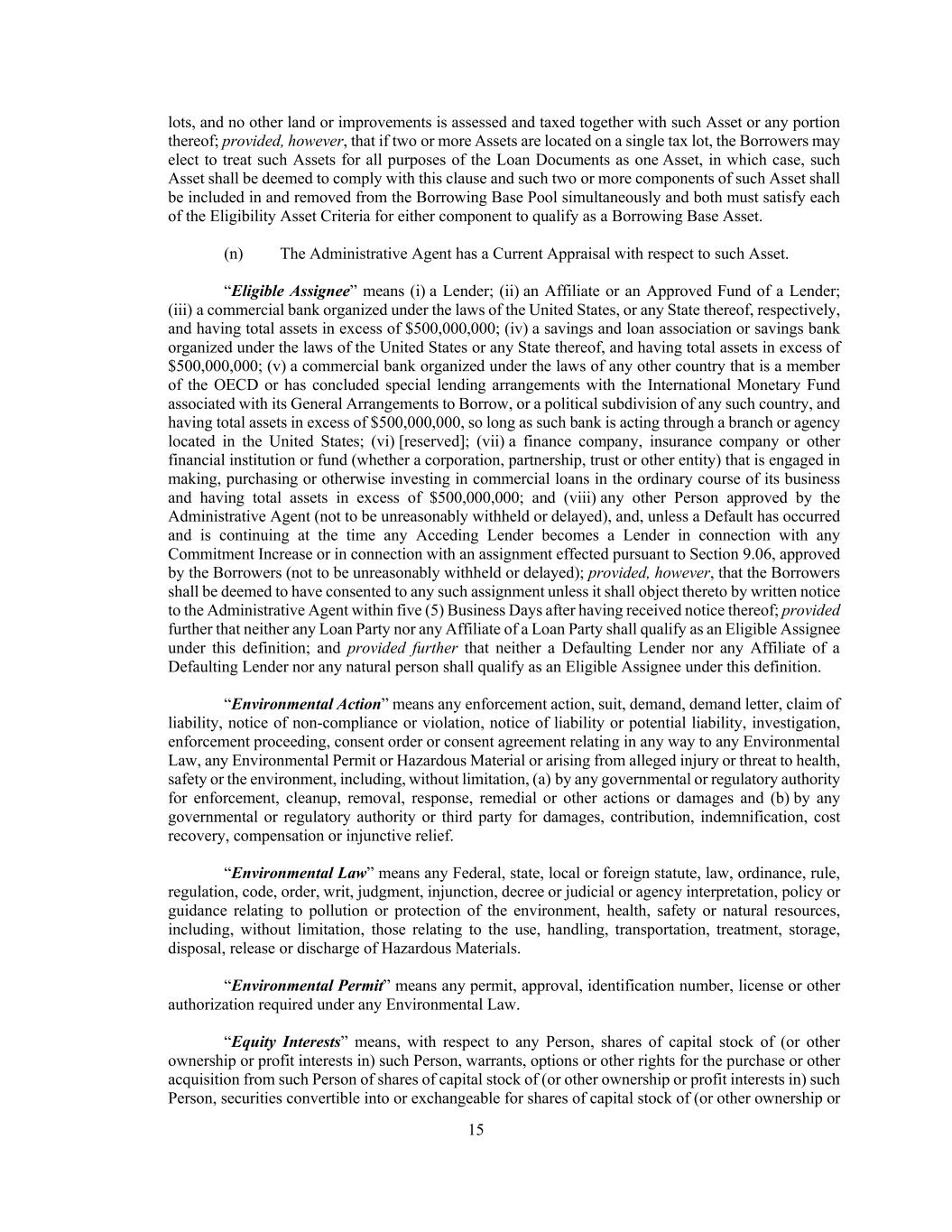 15 lots, and no other land or improvements is assessed and taxed together with such Asset or any portion thereof; provided, however, that if two or more Assets are located on a single tax lot, the Borrowers may elect to treat such Assets for all purposes of the Loan Documents as one Asset, in which case, such Asset shall be deemed to comply with this clause and such two or more components of such Asset shall be included in and removed from the Borrowing Base Pool simultaneously and both must satisfy each of the Eligibility Asset Criteria for either component to qualify as a Borrowing Base Asset. (n) The Administrative Agent has a Current Appraisal with respect to such Asset. “Eligible Assignee” means (i) a Lender; (ii) an Affiliate or an Approved Fund of a Lender; (iii) a commercial bank organized under the laws of the United States, or any State thereof, respectively, and having total assets in excess of $500,000,000; (iv) a savings and loan association or savings bank organized under the laws of the United States or any State thereof, and having total assets in excess of $500,000,000; (v) a commercial bank organized under the laws of any other country that is a member of the OECD or has concluded special lending arrangements with the International Monetary Fund associated with its General Arrangements to Borrow, or a political subdivision of any such country, and having total assets in excess of $500,000,000, so long as such bank is acting through a branch or agency located in the United States; (vi) [reserved]; (vii) a finance company, insurance company or other financial institution or fund (whether a corporation, partnership, trust or other entity) that is engaged in making, purchasing or otherwise investing in commercial loans in the ordinary course of its business and having total assets in excess of $500,000,000; and (viii) any other Person approved by the Administrative Agent (not to be unreasonably withheld or delayed), and, unless a Default has occurred and is continuing at the time any Acceding Lender becomes a Lender in connection with any Commitment Increase or in connection with an assignment effected pursuant to Section 9.06, approved by the Borrowers (not to be unreasonably withheld or delayed); provided, however, that the Borrowers shall be deemed to have consented to any such assignment unless it shall object thereto by written notice to the Administrative Agent within five (5) Business Days after having received notice thereof; provided further that neither any Loan Party nor any Affiliate of a Loan Party shall qualify as an Eligible Assignee under this definition; and provided further that neither a Defaulting Lender nor any Affiliate of a Defaulting Lender nor any natural person shall qualify as an Eligible Assignee under this definition. “Environmental Action” means any enforcement action, suit, demand, demand letter, claim of liability, notice of non-compliance or violation, notice of liability or potential liability, investigation, enforcement proceeding, consent order or consent agreement relating in any way to any Environmental Law, any Environmental Permit or Hazardous Material or arising from alleged injury or threat to health, safety or the environment, including, without limitation, (a) by any governmental or regulatory authority for enforcement, cleanup, removal, response, remedial or other actions or damages and (b) by any governmental or regulatory authority or third party for damages, contribution, indemnification, cost recovery, compensation or injunctive relief. “Environmental Law” means any Federal, state, local or foreign statute, law, ordinance, rule, regulation, code, order, writ, judgment, injunction, decree or judicial or agency interpretation, policy or guidance relating to pollution or protection of the environment, health, safety or natural resources, including, without limitation, those relating to the use, handling, transportation, treatment, storage, disposal, release or discharge of Hazardous Materials. “Environmental Permit” means any permit, approval, identification number, license or other authorization required under any Environmental Law. “Equity Interests” means, with respect to any Person, shares of capital stock of (or other ownership or profit interests in) such Person, warrants, options or other rights for the purchase or other acquisition from such Person of shares of capital stock of (or other ownership or profit interests in) such Person, securities convertible into or exchangeable for shares of capital stock of (or other ownership or