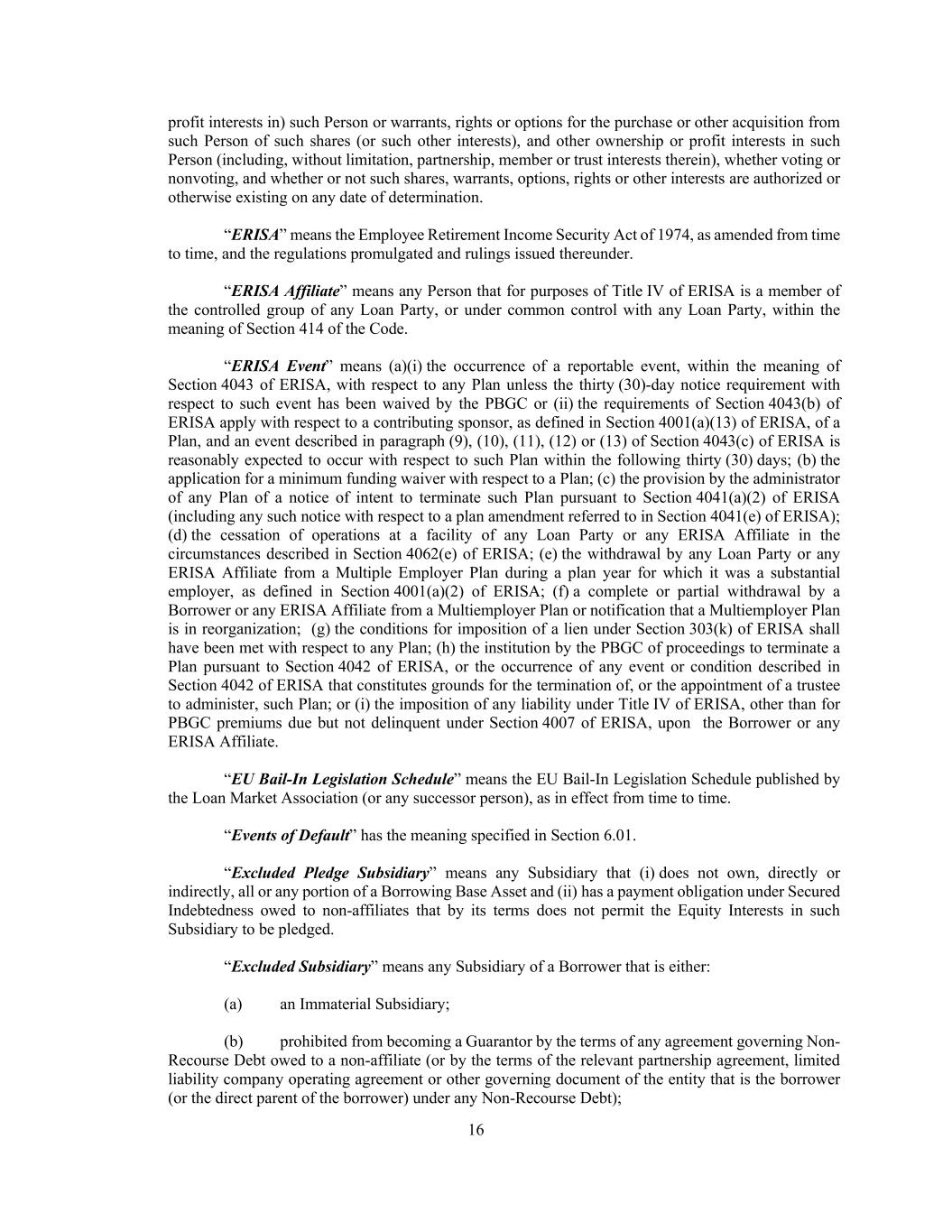 16 profit interests in) such Person or warrants, rights or options for the purchase or other acquisition from such Person of such shares (or such other interests), and other ownership or profit interests in such Person (including, without limitation, partnership, member or trust interests therein), whether voting or nonvoting, and whether or not such shares, warrants, options, rights or other interests are authorized or otherwise existing on any date of determination. “ERISA” means the Employee Retirement Income Security Act of 1974, as amended from time to time, and the regulations promulgated and rulings issued thereunder. “ERISA Affiliate” means any Person that for purposes of Title IV of ERISA is a member of the controlled group of any Loan Party, or under common control with any Loan Party, within the meaning of Section 414 of the Code. “ERISA Event” means (a)(i) the occurrence of a reportable event, within the meaning of Section 4043 of ERISA, with respect to any Plan unless the thirty (30)-day notice requirement with respect to such event has been waived by the PBGC or (ii) the requirements of Section 4043(b) of ERISA apply with respect to a contributing sponsor, as defined in Section 4001(a)(13) of ERISA, of a Plan, and an event described in paragraph (9), (10), (11), (12) or (13) of Section 4043(c) of ERISA is reasonably expected to occur with respect to such Plan within the following thirty (30) days; (b) the application for a minimum funding waiver with respect to a Plan; (c) the provision by the administrator of any Plan of a notice of intent to terminate such Plan pursuant to Section 4041(a)(2) of ERISA (including any such notice with respect to a plan amendment referred to in Section 4041(e) of ERISA); (d) the cessation of operations at a facility of any Loan Party or any ERISA Affiliate in the circumstances described in Section 4062(e) of ERISA; (e) the withdrawal by any Loan Party or any ERISA Affiliate from a Multiple Employer Plan during a plan year for which it was a substantial employer, as defined in Section 4001(a)(2) of ERISA; (f) a complete or partial withdrawal by a Borrower or any ERISA Affiliate from a Multiemployer Plan or notification that a Multiemployer Plan is in reorganization; (g) the conditions for imposition of a lien under Section 303(k) of ERISA shall have been met with respect to any Plan; (h) the institution by the PBGC of proceedings to terminate a Plan pursuant to Section 4042 of ERISA, or the occurrence of any event or condition described in Section 4042 of ERISA that constitutes grounds for the termination of, or the appointment of a trustee to administer, such Plan; or (i) the imposition of any liability under Title IV of ERISA, other than for PBGC premiums due but not delinquent under Section 4007 of ERISA, upon the Borrower or any ERISA Affiliate. “EU Bail-In Legislation Schedule” means the EU Bail-In Legislation Schedule published by the Loan Market Association (or any successor person), as in effect from time to time. “Events of Default” has the meaning specified in Section 6.01. “Excluded Pledge Subsidiary” means any Subsidiary that (i) does not own, directly or indirectly, all or any portion of a Borrowing Base Asset and (ii) has a payment obligation under Secured Indebtedness owed to non-affiliates that by its terms does not permit the Equity Interests in such Subsidiary to be pledged. “Excluded Subsidiary” means any Subsidiary of a Borrower that is either: (a) an Immaterial Subsidiary; (b) prohibited from becoming a Guarantor by the terms of any agreement governing Non- Recourse Debt owed to a non-affiliate (or by the terms of the relevant partnership agreement, limited liability company operating agreement or other governing document of the entity that is the borrower (or the direct parent of the borrower) under any Non-Recourse Debt);