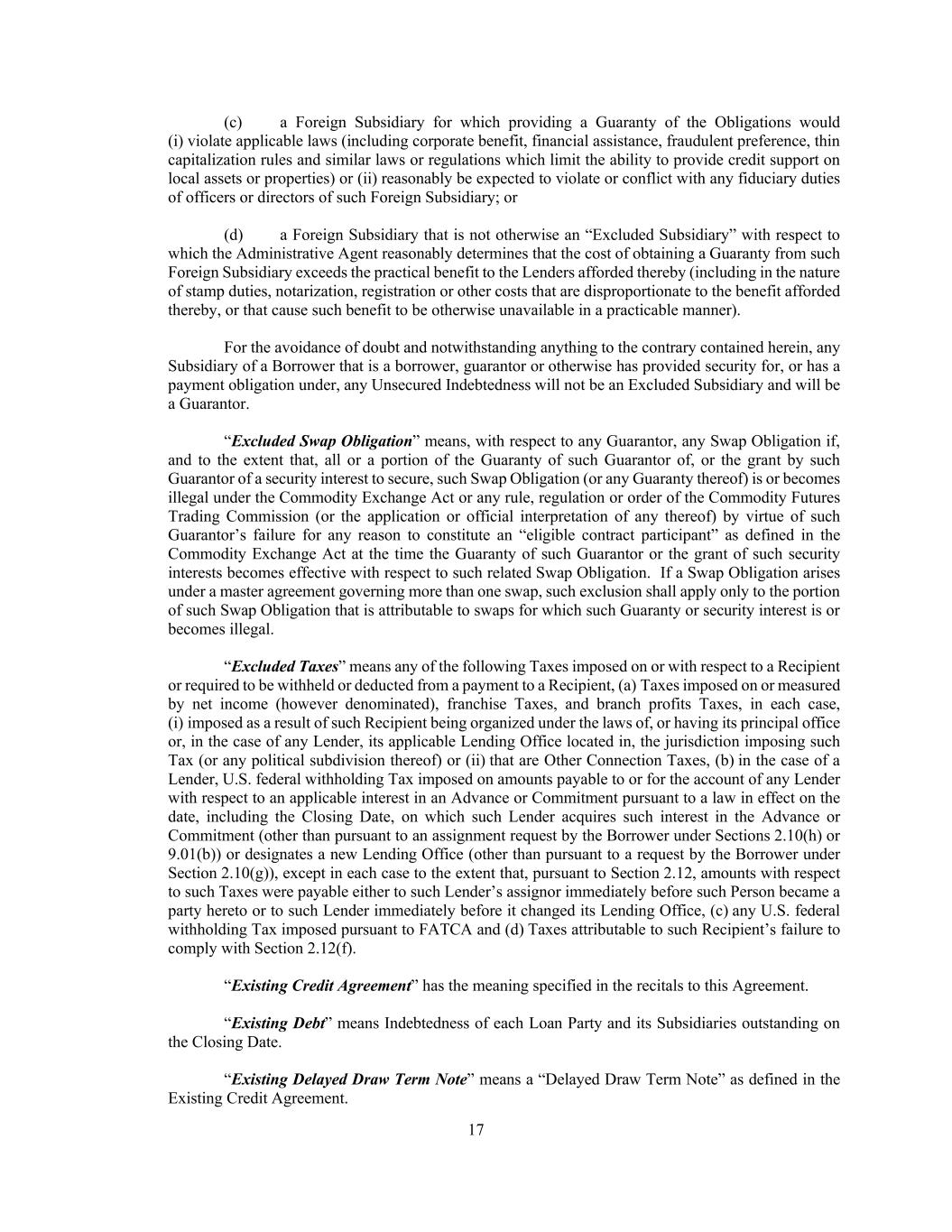 17 (c) a Foreign Subsidiary for which providing a Guaranty of the Obligations would (i) violate applicable laws (including corporate benefit, financial assistance, fraudulent preference, thin capitalization rules and similar laws or regulations which limit the ability to provide credit support on local assets or properties) or (ii) reasonably be expected to violate or conflict with any fiduciary duties of officers or directors of such Foreign Subsidiary; or (d) a Foreign Subsidiary that is not otherwise an “Excluded Subsidiary” with respect to which the Administrative Agent reasonably determines that the cost of obtaining a Guaranty from such Foreign Subsidiary exceeds the practical benefit to the Lenders afforded thereby (including in the nature of stamp duties, notarization, registration or other costs that are disproportionate to the benefit afforded thereby, or that cause such benefit to be otherwise unavailable in a practicable manner). For the avoidance of doubt and notwithstanding anything to the contrary contained herein, any Subsidiary of a Borrower that is a borrower, guarantor or otherwise has provided security for, or has a payment obligation under, any Unsecured Indebtedness will not be an Excluded Subsidiary and will be a Guarantor. “Excluded Swap Obligation” means, with respect to any Guarantor, any Swap Obligation if, and to the extent that, all or a portion of the Guaranty of such Guarantor of, or the grant by such Guarantor of a security interest to secure, such Swap Obligation (or any Guaranty thereof) is or becomes illegal under the Commodity Exchange Act or any rule, regulation or order of the Commodity Futures Trading Commission (or the application or official interpretation of any thereof) by virtue of such Guarantor’s failure for any reason to constitute an “eligible contract participant” as defined in the Commodity Exchange Act at the time the Guaranty of such Guarantor or the grant of such security interests becomes effective with respect to such related Swap Obligation. If a Swap Obligation arises under a master agreement governing more than one swap, such exclusion shall apply only to the portion of such Swap Obligation that is attributable to swaps for which such Guaranty or security interest is or becomes illegal. “Excluded Taxes” means any of the following Taxes imposed on or with respect to a Recipient or required to be withheld or deducted from a payment to a Recipient, (a) Taxes imposed on or measured by net income (however denominated), franchise Taxes, and branch profits Taxes, in each case, (i) imposed as a result of such Recipient being organized under the laws of, or having its principal office or, in the case of any Lender, its applicable Lending Office located in, the jurisdiction imposing such Tax (or any political subdivision thereof) or (ii) that are Other Connection Taxes, (b) in the case of a Lender, U.S. federal withholding Tax imposed on amounts payable to or for the account of any Lender with respect to an applicable interest in an Advance or Commitment pursuant to a law in effect on the date, including the Closing Date, on which such Lender acquires such interest in the Advance or Commitment (other than pursuant to an assignment request by the Borrower under Sections 2.10(h) or 9.01(b)) or designates a new Lending Office (other than pursuant to a request by the Borrower under Section 2.10(g)), except in each case to the extent that, pursuant to Section 2.12, amounts with respect to such Taxes were payable either to such Lender’s assignor immediately before such Person became a party hereto or to such Lender immediately before it changed its Lending Office, (c) any U.S. federal withholding Tax imposed pursuant to FATCA and (d) Taxes attributable to such Recipient’s failure to comply with Section 2.12(f). “Existing Credit Agreement” has the meaning specified in the recitals to this Agreement. “Existing Debt” means Indebtedness of each Loan Party and its Subsidiaries outstanding on the Closing Date. “Existing Delayed Draw Term Note” means a “Delayed Draw Term Note” as defined in the Existing Credit Agreement.