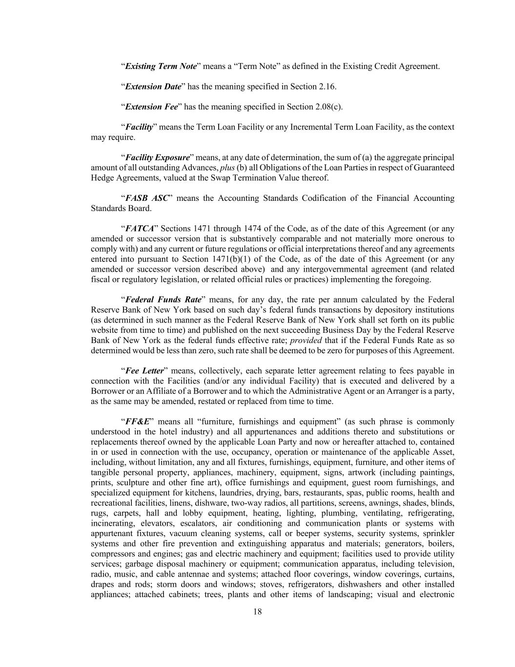 18 “Existing Term Note” means a “Term Note” as defined in the Existing Credit Agreement. “Extension Date” has the meaning specified in Section 2.16. “Extension Fee” has the meaning specified in Section 2.08(c). “Facility” means the Term Loan Facility or any Incremental Term Loan Facility, as the context may require. “Facility Exposure” means, at any date of determination, the sum of (a) the aggregate principal amount of all outstanding Advances, plus (b) all Obligations of the Loan Parties in respect of Guaranteed Hedge Agreements, valued at the Swap Termination Value thereof. “FASB ASC” means the Accounting Standards Codification of the Financial Accounting Standards Board. “FATCA” Sections 1471 through 1474 of the Code, as of the date of this Agreement (or any amended or successor version that is substantively comparable and not materially more onerous to comply with) and any current or future regulations or official interpretations thereof and any agreements entered into pursuant to Section 1471(b)(1) of the Code, as of the date of this Agreement (or any amended or successor version described above) and any intergovernmental agreement (and related fiscal or regulatory legislation, or related official rules or practices) implementing the foregoing. “Federal Funds Rate” means, for any day, the rate per annum calculated by the Federal Reserve Bank of New York based on such day’s federal funds transactions by depository institutions (as determined in such manner as the Federal Reserve Bank of New York shall set forth on its public website from time to time) and published on the next succeeding Business Day by the Federal Reserve Bank of New York as the federal funds effective rate; provided that if the Federal Funds Rate as so determined would be less than zero, such rate shall be deemed to be zero for purposes of this Agreement. “Fee Letter” means, collectively, each separate letter agreement relating to fees payable in connection with the Facilities (and/or any individual Facility) that is executed and delivered by a Borrower or an Affiliate of a Borrower and to which the Administrative Agent or an Arranger is a party, as the same may be amended, restated or replaced from time to time. “FF&E” means all “furniture, furnishings and equipment” (as such phrase is commonly understood in the hotel industry) and all appurtenances and additions thereto and substitutions or replacements thereof owned by the applicable Loan Party and now or hereafter attached to, contained in or used in connection with the use, occupancy, operation or maintenance of the applicable Asset, including, without limitation, any and all fixtures, furnishings, equipment, furniture, and other items of tangible personal property, appliances, machinery, equipment, signs, artwork (including paintings, prints, sculpture and other fine art), office furnishings and equipment, guest room furnishings, and specialized equipment for kitchens, laundries, drying, bars, restaurants, spas, public rooms, health and recreational facilities, linens, dishware, two-way radios, all partitions, screens, awnings, shades, blinds, rugs, carpets, hall and lobby equipment, heating, lighting, plumbing, ventilating, refrigerating, incinerating, elevators, escalators, air conditioning and communication plants or systems with appurtenant fixtures, vacuum cleaning systems, call or beeper systems, security systems, sprinkler systems and other fire prevention and extinguishing apparatus and materials; generators, boilers, compressors and engines; gas and electric machinery and equipment; facilities used to provide utility services; garbage disposal machinery or equipment; communication apparatus, including television, radio, music, and cable antennae and systems; attached floor coverings, window coverings, curtains, drapes and rods; storm doors and windows; stoves, refrigerators, dishwashers and other installed appliances; attached cabinets; trees, plants and other items of landscaping; visual and electronic
