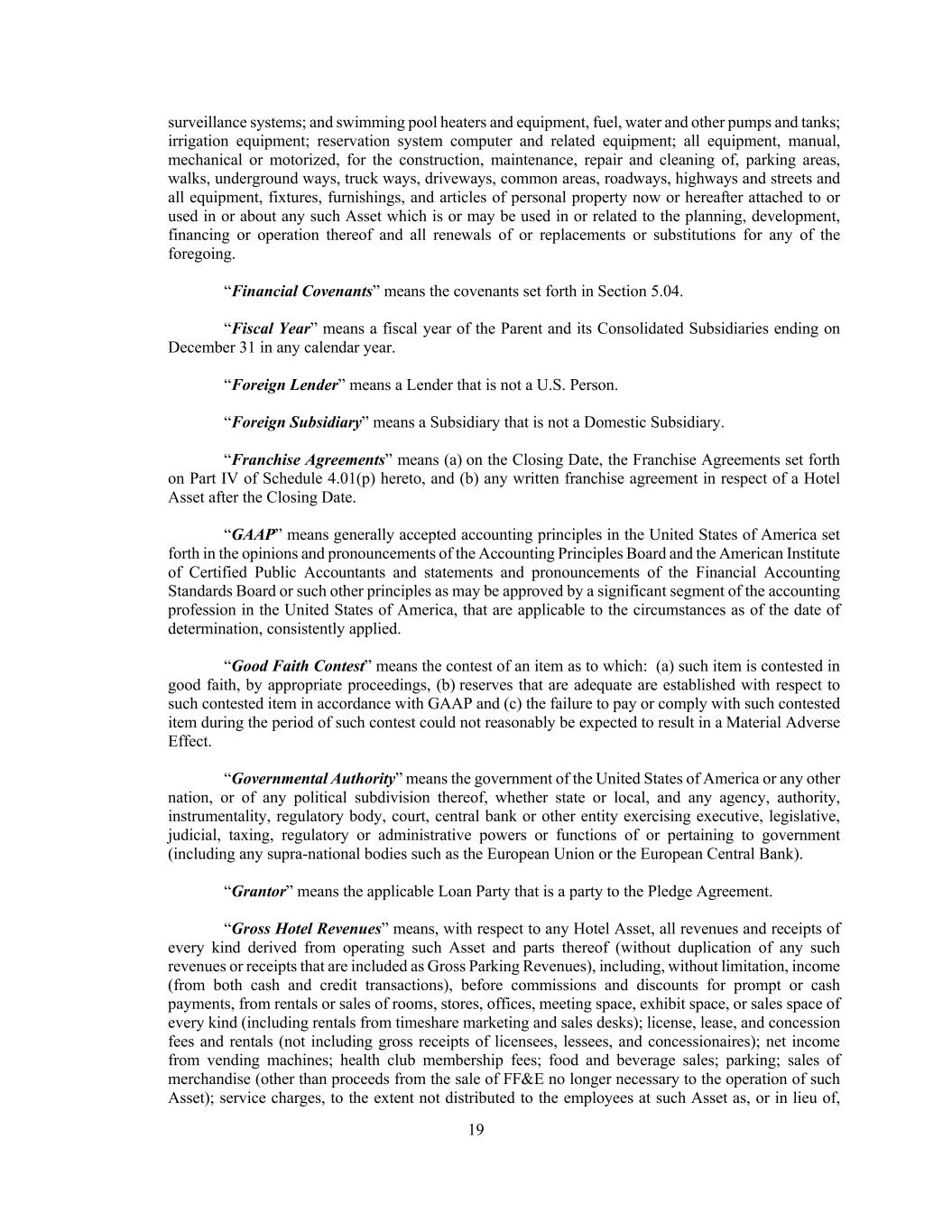 19 surveillance systems; and swimming pool heaters and equipment, fuel, water and other pumps and tanks; irrigation equipment; reservation system computer and related equipment; all equipment, manual, mechanical or motorized, for the construction, maintenance, repair and cleaning of, parking areas, walks, underground ways, truck ways, driveways, common areas, roadways, highways and streets and all equipment, fixtures, furnishings, and articles of personal property now or hereafter attached to or used in or about any such Asset which is or may be used in or related to the planning, development, financing or operation thereof and all renewals of or replacements or substitutions for any of the foregoing. “Financial Covenants” means the covenants set forth in Section 5.04. “Fiscal Year” means a fiscal year of the Parent and its Consolidated Subsidiaries ending on December 31 in any calendar year. “Foreign Lender” means a Lender that is not a U.S. Person. “Foreign Subsidiary” means a Subsidiary that is not a Domestic Subsidiary. “Franchise Agreements” means (a) on the Closing Date, the Franchise Agreements set forth on Part IV of Schedule 4.01(p) hereto, and (b) any written franchise agreement in respect of a Hotel Asset after the Closing Date. “GAAP” means generally accepted accounting principles in the United States of America set forth in the opinions and pronouncements of the Accounting Principles Board and the American Institute of Certified Public Accountants and statements and pronouncements of the Financial Accounting Standards Board or such other principles as may be approved by a significant segment of the accounting profession in the United States of America, that are applicable to the circumstances as of the date of determination, consistently applied. “Good Faith Contest” means the contest of an item as to which: (a) such item is contested in good faith, by appropriate proceedings, (b) reserves that are adequate are established with respect to such contested item in accordance with GAAP and (c) the failure to pay or comply with such contested item during the period of such contest could not reasonably be expected to result in a Material Adverse Effect. “Governmental Authority” means the government of the United States of America or any other nation, or of any political subdivision thereof, whether state or local, and any agency, authority, instrumentality, regulatory body, court, central bank or other entity exercising executive, legislative, judicial, taxing, regulatory or administrative powers or functions of or pertaining to government (including any supra-national bodies such as the European Union or the European Central Bank). “Grantor” means the applicable Loan Party that is a party to the Pledge Agreement. “Gross Hotel Revenues” means, with respect to any Hotel Asset, all revenues and receipts of every kind derived from operating such Asset and parts thereof (without duplication of any such revenues or receipts that are included as Gross Parking Revenues), including, without limitation, income (from both cash and credit transactions), before commissions and discounts for prompt or cash payments, from rentals or sales of rooms, stores, offices, meeting space, exhibit space, or sales space of every kind (including rentals from timeshare marketing and sales desks); license, lease, and concession fees and rentals (not including gross receipts of licensees, lessees, and concessionaires); net income from vending machines; health club membership fees; food and beverage sales; parking; sales of merchandise (other than proceeds from the sale of FF&E no longer necessary to the operation of such Asset); service charges, to the extent not distributed to the employees at such Asset as, or in lieu of,
