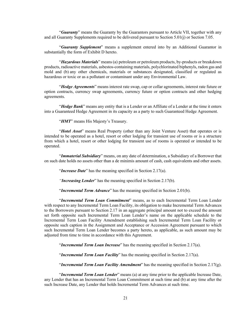 21 “Guaranty” means the Guaranty by the Guarantors pursuant to Article VII, together with any and all Guaranty Supplements required to be delivered pursuant to Section 5.01(j) or Section 7.05. “Guaranty Supplement” means a supplement entered into by an Additional Guarantor in substantially the form of Exhibit D hereto. “Hazardous Materials” means (a) petroleum or petroleum products, by-products or breakdown products, radioactive materials, asbestos-containing materials, polychlorinated biphenyls, radon gas and mold and (b) any other chemicals, materials or substances designated, classified or regulated as hazardous or toxic or as a pollutant or contaminant under any Environmental Law. “Hedge Agreements” means interest rate swap, cap or collar agreements, interest rate future or option contracts, currency swap agreements, currency future or option contracts and other hedging agreements. “Hedge Bank” means any entity that is a Lender or an Affiliate of a Lender at the time it enters into a Guaranteed Hedge Agreement in its capacity as a party to such Guaranteed Hedge Agreement. “HMT” means His Majesty’s Treasury. “Hotel Asset” means Real Property (other than any Joint Venture Asset) that operates or is intended to be operated as a hotel, resort or other lodging for transient use of rooms or is a structure from which a hotel, resort or other lodging for transient use of rooms is operated or intended to be operated. “Immaterial Subsidiary” means, on any date of determination, a Subsidiary of a Borrower that on such date holds no assets other than a de minimis amount of cash, cash equivalents and other assets. “Increase Date” has the meaning specified in Section 2.17(a). “Increasing Lender” has the meaning specified in Section 2.17(b). “Incremental Term Advance” has the meaning specified in Section 2.01(b). “Incremental Term Loan Commitment” means, as to each Incremental Term Loan Lender with respect to any Incremental Term Loan Facility, its obligation to make Incremental Term Advances to the Borrowers pursuant to Section 2.17 in an aggregate principal amount not to exceed the amount set forth opposite such Incremental Term Loan Lender’s name on the applicable schedule to the Incremental Term Loan Facility Amendment establishing such Incremental Term Loan Facility or opposite such caption in the Assignment and Acceptance or Accession Agreement pursuant to which such Incremental Term Loan Lender becomes a party hereto, as applicable, as such amount may be adjusted from time to time in accordance with this Agreement. “Incremental Term Loan Increase” has the meaning specified in Section 2.17(a). “Incremental Term Loan Facility” has the meaning specified in Section 2.17(a). “Incremental Term Loan Facility Amendment” has the meaning specified in Section 2.17(g). “Incremental Term Loan Lender” means (a) at any time prior to the applicable Increase Date, any Lender that has an Incremental Term Loan Commitment at such time and (b) at any time after the such Increase Date, any Lender that holds Incremental Term Advances at such time.