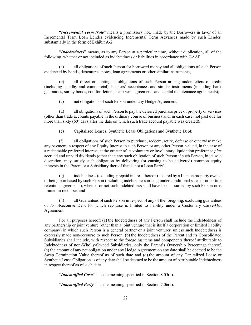22 “Incremental Term Note” means a promissory note made by the Borrowers in favor of an Incremental Term Loan Lender evidencing Incremental Term Advances made by such Lender, substantially in the form of Exhibit A-2. “Indebtedness” means, as to any Person at a particular time, without duplication, all of the following, whether or not included as indebtedness or liabilities in accordance with GAAP: (a) all obligations of such Person for borrowed money and all obligations of such Person evidenced by bonds, debentures, notes, loan agreements or other similar instruments; (b) all direct or contingent obligations of such Person arising under letters of credit (including standby and commercial), bankers’ acceptances and similar instruments (including bank guaranties, surety bonds, comfort letters, keep-well agreements and capital maintenance agreements); (c) net obligations of such Person under any Hedge Agreement; (d) all obligations of such Person to pay the deferred purchase price of property or services (other than trade accounts payable in the ordinary course of business and, in each case, not past due for more than sixty (60) days after the date on which such trade account payable was created); (e) Capitalized Leases, Synthetic Lease Obligations and Synthetic Debt; (f) all obligations of such Person to purchase, redeem, retire, defease or otherwise make any payment in respect of any Equity Interest in such Person or any other Person, valued, in the case of a redeemable preferred interest, at the greater of its voluntary or involuntary liquidation preference plus accrued and unpaid dividends (other than any such obligation of such Person if such Person, in its sole discretion, may satisfy such obligation by delivering (or causing to be delivered) common equity interests in the Parent or a Subsidiary thereof that is not a Loan Party); (g) indebtedness (excluding prepaid interest thereon) secured by a Lien on property owned or being purchased by such Person (including indebtedness arising under conditional sales or other title retention agreements), whether or not such indebtedness shall have been assumed by such Person or is limited in recourse; and (h) all Guarantees of such Person in respect of any of the foregoing, excluding guarantees of Non-Recourse Debt for which recourse is limited to liability under a Customary Carve-Out Agreement. For all purposes hereof: (a) the Indebtedness of any Person shall include the Indebtedness of any partnership or joint venture (other than a joint venture that is itself a corporation or limited liability company) in which such Person is a general partner or a joint venturer, unless such Indebtedness is expressly made non-recourse to such Person, (b) the Indebtedness of the Parent and its Consolidated Subsidiaries shall include, with respect to the foregoing items and components thereof attributable to Indebtedness of non-Wholly-Owned Subsidiaries, only the Parent’s Ownership Percentage thereof, (c) the amount of any net obligation under any Hedge Agreement on any date shall be deemed to be the Swap Termination Value thereof as of such date and (d) the amount of any Capitalized Lease or Synthetic Lease Obligation as of any date shall be deemed to be the amount of Attributable Indebtedness in respect thereof as of such date. “Indemnified Costs” has the meaning specified in Section 8.05(a). “Indemnified Party” has the meaning specified in Section 7.06(a).