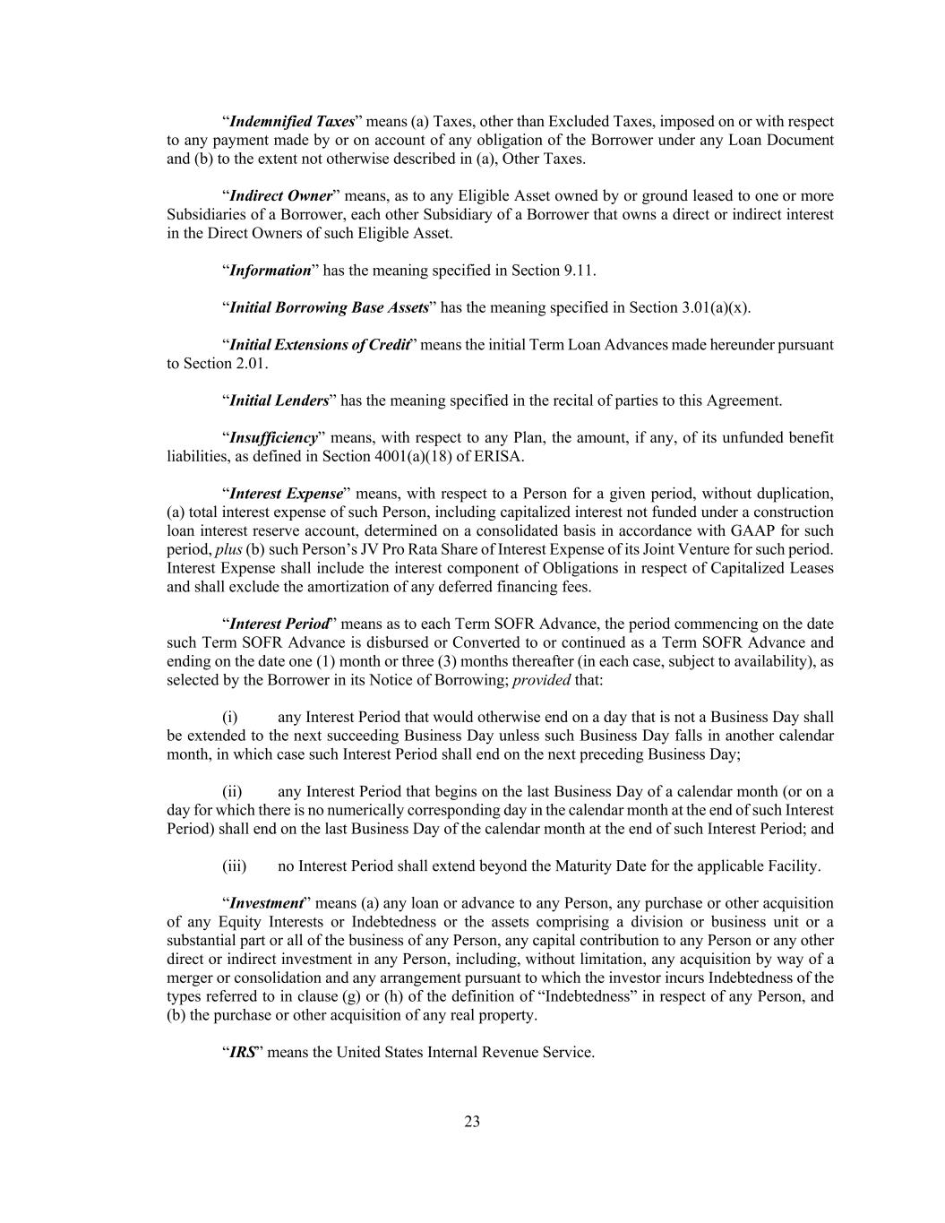 23 “Indemnified Taxes” means (a) Taxes, other than Excluded Taxes, imposed on or with respect to any payment made by or on account of any obligation of the Borrower under any Loan Document and (b) to the extent not otherwise described in (a), Other Taxes. “Indirect Owner” means, as to any Eligible Asset owned by or ground leased to one or more Subsidiaries of a Borrower, each other Subsidiary of a Borrower that owns a direct or indirect interest in the Direct Owners of such Eligible Asset. “Information” has the meaning specified in Section 9.11. “Initial Borrowing Base Assets” has the meaning specified in Section 3.01(a)(x). “Initial Extensions of Credit” means the initial Term Loan Advances made hereunder pursuant to Section 2.01. “Initial Lenders” has the meaning specified in the recital of parties to this Agreement. “Insufficiency” means, with respect to any Plan, the amount, if any, of its unfunded benefit liabilities, as defined in Section 4001(a)(18) of ERISA. “Interest Expense” means, with respect to a Person for a given period, without duplication, (a) total interest expense of such Person, including capitalized interest not funded under a construction loan interest reserve account, determined on a consolidated basis in accordance with GAAP for such period, plus (b) such Person’s JV Pro Rata Share of Interest Expense of its Joint Venture for such period. Interest Expense shall include the interest component of Obligations in respect of Capitalized Leases and shall exclude the amortization of any deferred financing fees. “Interest Period” means as to each Term SOFR Advance, the period commencing on the date such Term SOFR Advance is disbursed or Converted to or continued as a Term SOFR Advance and ending on the date one (1) month or three (3) months thereafter (in each case, subject to availability), as selected by the Borrower in its Notice of Borrowing; provided that: (i) any Interest Period that would otherwise end on a day that is not a Business Day shall be extended to the next succeeding Business Day unless such Business Day falls in another calendar month, in which case such Interest Period shall end on the next preceding Business Day; (ii) any Interest Period that begins on the last Business Day of a calendar month (or on a day for which there is no numerically corresponding day in the calendar month at the end of such Interest Period) shall end on the last Business Day of the calendar month at the end of such Interest Period; and (iii) no Interest Period shall extend beyond the Maturity Date for the applicable Facility. “Investment” means (a) any loan or advance to any Person, any purchase or other acquisition of any Equity Interests or Indebtedness or the assets comprising a division or business unit or a substantial part or all of the business of any Person, any capital contribution to any Person or any other direct or indirect investment in any Person, including, without limitation, any acquisition by way of a merger or consolidation and any arrangement pursuant to which the investor incurs Indebtedness of the types referred to in clause (g) or (h) of the definition of “Indebtedness” in respect of any Person, and (b) the purchase or other acquisition of any real property. “IRS” means the United States Internal Revenue Service.