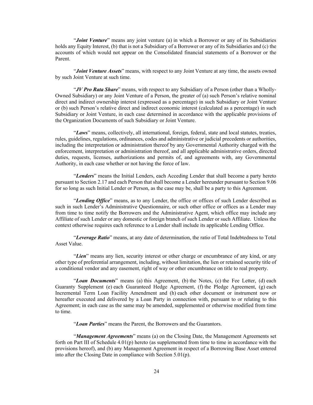 24 “Joint Venture” means any joint venture (a) in which a Borrower or any of its Subsidiaries holds any Equity Interest, (b) that is not a Subsidiary of a Borrower or any of its Subsidiaries and (c) the accounts of which would not appear on the Consolidated financial statements of a Borrower or the Parent. “Joint Venture Assets” means, with respect to any Joint Venture at any time, the assets owned by such Joint Venture at such time. “JV Pro Rata Share” means, with respect to any Subsidiary of a Person (other than a Wholly- Owned Subsidiary) or any Joint Venture of a Person, the greater of (a) such Person’s relative nominal direct and indirect ownership interest (expressed as a percentage) in such Subsidiary or Joint Venture or (b) such Person’s relative direct and indirect economic interest (calculated as a percentage) in such Subsidiary or Joint Venture, in each case determined in accordance with the applicable provisions of the Organization Documents of such Subsidiary or Joint Venture. “Laws” means, collectively, all international, foreign, federal, state and local statutes, treaties, rules, guidelines, regulations, ordinances, codes and administrative or judicial precedents or authorities, including the interpretation or administration thereof by any Governmental Authority charged with the enforcement, interpretation or administration thereof, and all applicable administrative orders, directed duties, requests, licenses, authorizations and permits of, and agreements with, any Governmental Authority, in each case whether or not having the force of law. “Lenders” means the Initial Lenders, each Acceding Lender that shall become a party hereto pursuant to Section 2.17 and each Person that shall become a Lender hereunder pursuant to Section 9.06 for so long as such Initial Lender or Person, as the case may be, shall be a party to this Agreement. “Lending Office” means, as to any Lender, the office or offices of such Lender described as such in such Lender’s Administrative Questionnaire, or such other office or offices as a Lender may from time to time notify the Borrowers and the Administrative Agent, which office may include any Affiliate of such Lender or any domestic or foreign branch of such Lender or such Affiliate. Unless the context otherwise requires each reference to a Lender shall include its applicable Lending Office. “Leverage Ratio” means, at any date of determination, the ratio of Total Indebtedness to Total Asset Value. “Lien” means any lien, security interest or other charge or encumbrance of any kind, or any other type of preferential arrangement, including, without limitation, the lien or retained security title of a conditional vendor and any easement, right of way or other encumbrance on title to real property. “Loan Documents” means (a) this Agreement, (b) the Notes, (c) the Fee Letter, (d) each Guaranty Supplement (e) each Guaranteed Hedge Agreement, (f) the Pledge Agreement, (g) each Incremental Term Loan Facility Amendment and (h) each other document or instrument now or hereafter executed and delivered by a Loan Party in connection with, pursuant to or relating to this Agreement; in each case as the same may be amended, supplemented or otherwise modified from time to time. “Loan Parties” means the Parent, the Borrowers and the Guarantors. “Management Agreements” means (a) on the Closing Date, the Management Agreements set forth on Part III of Schedule 4.01(p) hereto (as supplemented from time to time in accordance with the provisions hereof), and (b) any Management Agreement in respect of a Borrowing Base Asset entered into after the Closing Date in compliance with Section 5.01(p).