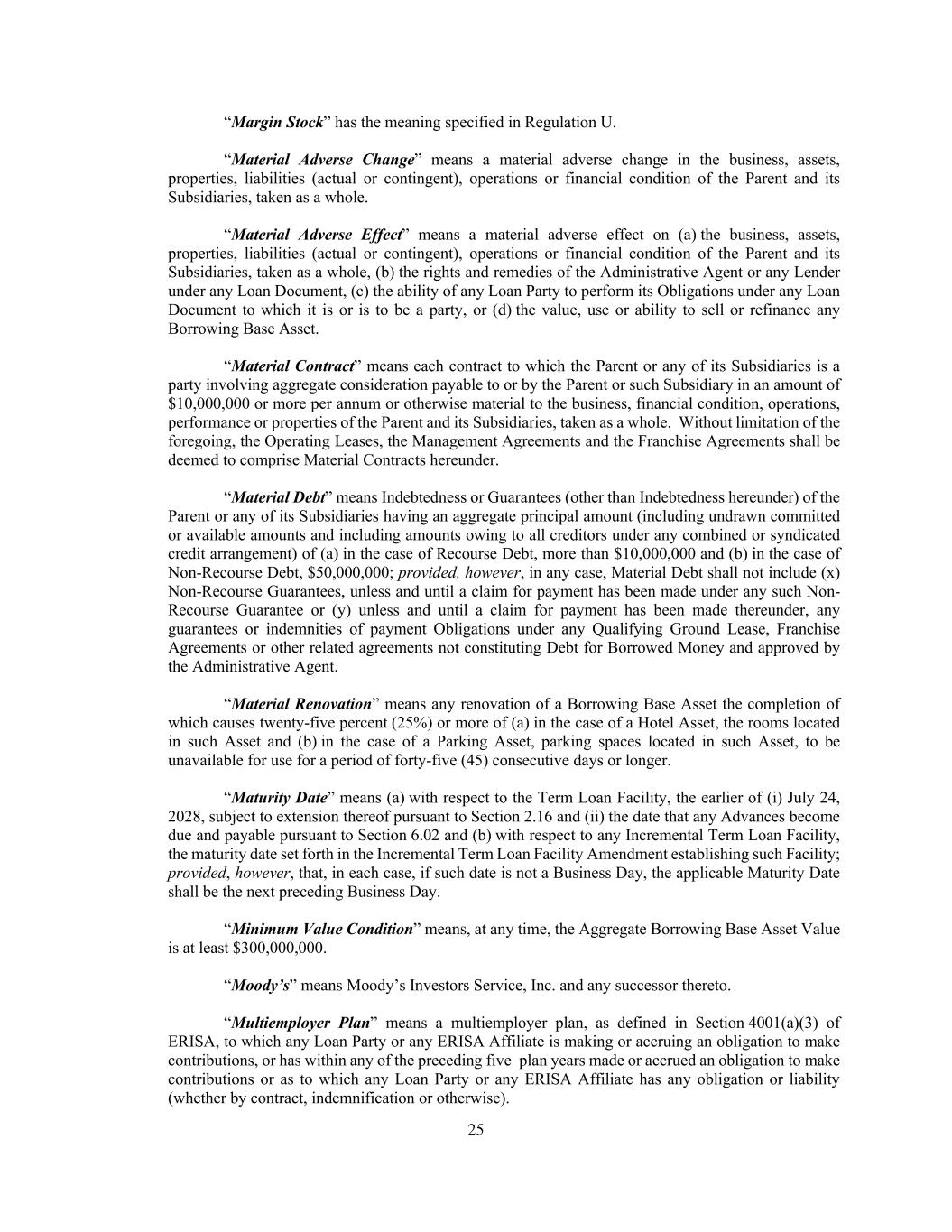 25 “Margin Stock” has the meaning specified in Regulation U. “Material Adverse Change” means a material adverse change in the business, assets, properties, liabilities (actual or contingent), operations or financial condition of the Parent and its Subsidiaries, taken as a whole. “Material Adverse Effect” means a material adverse effect on (a) the business, assets, properties, liabilities (actual or contingent), operations or financial condition of the Parent and its Subsidiaries, taken as a whole, (b) the rights and remedies of the Administrative Agent or any Lender under any Loan Document, (c) the ability of any Loan Party to perform its Obligations under any Loan Document to which it is or is to be a party, or (d) the value, use or ability to sell or refinance any Borrowing Base Asset. “Material Contract” means each contract to which the Parent or any of its Subsidiaries is a party involving aggregate consideration payable to or by the Parent or such Subsidiary in an amount of $10,000,000 or more per annum or otherwise material to the business, financial condition, operations, performance or properties of the Parent and its Subsidiaries, taken as a whole. Without limitation of the foregoing, the Operating Leases, the Management Agreements and the Franchise Agreements shall be deemed to comprise Material Contracts hereunder. “Material Debt” means Indebtedness or Guarantees (other than Indebtedness hereunder) of the Parent or any of its Subsidiaries having an aggregate principal amount (including undrawn committed or available amounts and including amounts owing to all creditors under any combined or syndicated credit arrangement) of (a) in the case of Recourse Debt, more than $10,000,000 and (b) in the case of Non-Recourse Debt, $50,000,000; provided, however, in any case, Material Debt shall not include (x) Non-Recourse Guarantees, unless and until a claim for payment has been made under any such Non- Recourse Guarantee or (y) unless and until a claim for payment has been made thereunder, any guarantees or indemnities of payment Obligations under any Qualifying Ground Lease, Franchise Agreements or other related agreements not constituting Debt for Borrowed Money and approved by the Administrative Agent. “Material Renovation” means any renovation of a Borrowing Base Asset the completion of which causes twenty-five percent (25%) or more of (a) in the case of a Hotel Asset, the rooms located in such Asset and (b) in the case of a Parking Asset, parking spaces located in such Asset, to be unavailable for use for a period of forty-five (45) consecutive days or longer. “Maturity Date” means (a) with respect to the Term Loan Facility, the earlier of (i) July 24, 2028, subject to extension thereof pursuant to Section 2.16 and (ii) the date that any Advances become due and payable pursuant to Section 6.02 and (b) with respect to any Incremental Term Loan Facility, the maturity date set forth in the Incremental Term Loan Facility Amendment establishing such Facility; provided, however, that, in each case, if such date is not a Business Day, the applicable Maturity Date shall be the next preceding Business Day. “Minimum Value Condition” means, at any time, the Aggregate Borrowing Base Asset Value is at least $300,000,000. “Moody’s” means Moody’s Investors Service, Inc. and any successor thereto. “Multiemployer Plan” means a multiemployer plan, as defined in Section 4001(a)(3) of ERISA, to which any Loan Party or any ERISA Affiliate is making or accruing an obligation to make contributions, or has within any of the preceding five plan years made or accrued an obligation to make contributions or as to which any Loan Party or any ERISA Affiliate has any obligation or liability (whether by contract, indemnification or otherwise).
