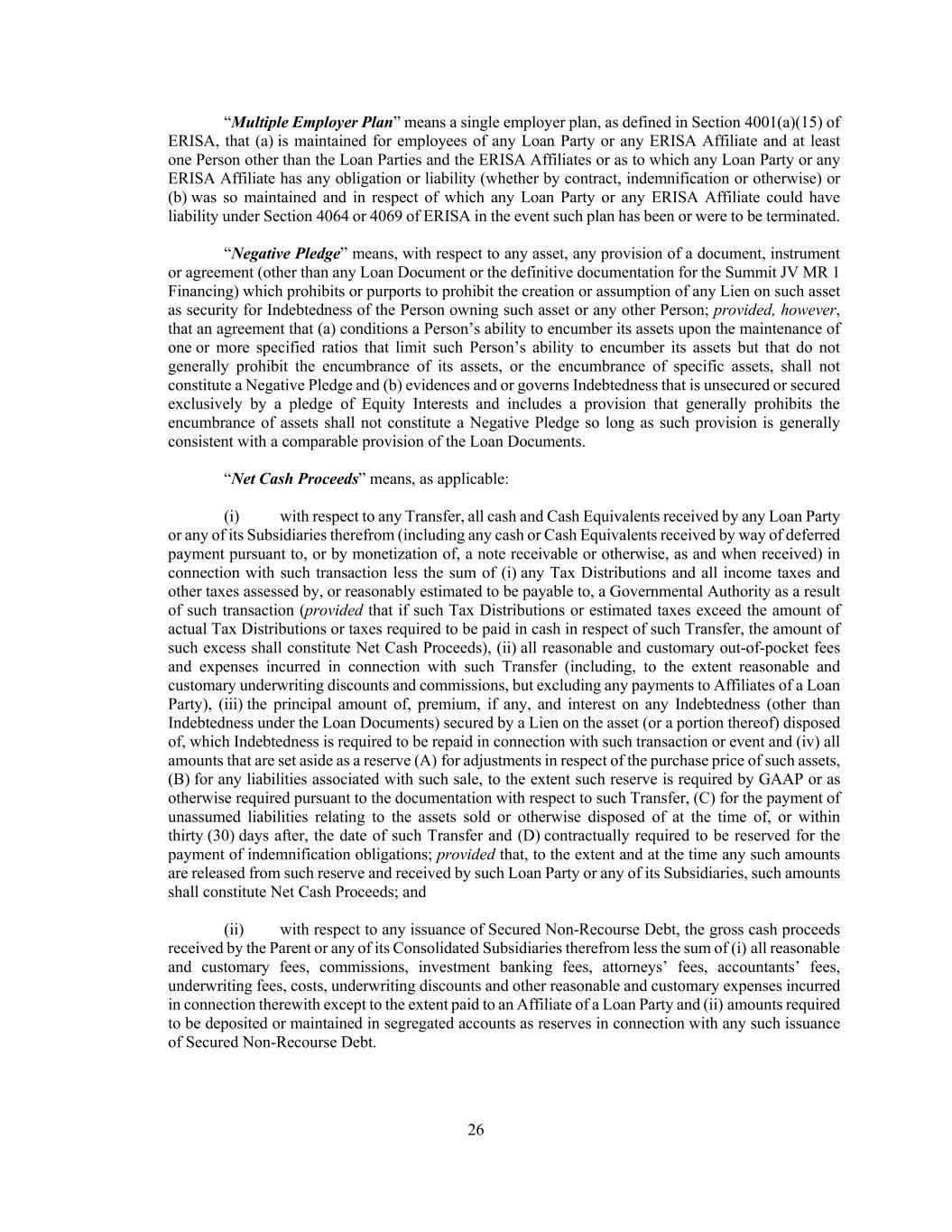 26 “Multiple Employer Plan” means a single employer plan, as defined in Section 4001(a)(15) of ERISA, that (a) is maintained for employees of any Loan Party or any ERISA Affiliate and at least one Person other than the Loan Parties and the ERISA Affiliates or as to which any Loan Party or any ERISA Affiliate has any obligation or liability (whether by contract, indemnification or otherwise) or (b) was so maintained and in respect of which any Loan Party or any ERISA Affiliate could have liability under Section 4064 or 4069 of ERISA in the event such plan has been or were to be terminated. “Negative Pledge” means, with respect to any asset, any provision of a document, instrument or agreement (other than any Loan Document or the definitive documentation for the Summit JV MR 1 Financing) which prohibits or purports to prohibit the creation or assumption of any Lien on such asset as security for Indebtedness of the Person owning such asset or any other Person; provided, however, that an agreement that (a) conditions a Person’s ability to encumber its assets upon the maintenance of one or more specified ratios that limit such Person’s ability to encumber its assets but that do not generally prohibit the encumbrance of its assets, or the encumbrance of specific assets, shall not constitute a Negative Pledge and (b) evidences and or governs Indebtedness that is unsecured or secured exclusively by a pledge of Equity Interests and includes a provision that generally prohibits the encumbrance of assets shall not constitute a Negative Pledge so long as such provision is generally consistent with a comparable provision of the Loan Documents. “Net Cash Proceeds” means, as applicable: (i) with respect to any Transfer, all cash and Cash Equivalents received by any Loan Party or any of its Subsidiaries therefrom (including any cash or Cash Equivalents received by way of deferred payment pursuant to, or by monetization of, a note receivable or otherwise, as and when received) in connection with such transaction less the sum of (i) any Tax Distributions and all income taxes and other taxes assessed by, or reasonably estimated to be payable to, a Governmental Authority as a result of such transaction (provided that if such Tax Distributions or estimated taxes exceed the amount of actual Tax Distributions or taxes required to be paid in cash in respect of such Transfer, the amount of such excess shall constitute Net Cash Proceeds), (ii) all reasonable and customary out-of-pocket fees and expenses incurred in connection with such Transfer (including, to the extent reasonable and customary underwriting discounts and commissions, but excluding any payments to Affiliates of a Loan Party), (iii) the principal amount of, premium, if any, and interest on any Indebtedness (other than Indebtedness under the Loan Documents) secured by a Lien on the asset (or a portion thereof) disposed of, which Indebtedness is required to be repaid in connection with such transaction or event and (iv) all amounts that are set aside as a reserve (A) for adjustments in respect of the purchase price of such assets, (B) for any liabilities associated with such sale, to the extent such reserve is required by GAAP or as otherwise required pursuant to the documentation with respect to such Transfer, (C) for the payment of unassumed liabilities relating to the assets sold or otherwise disposed of at the time of, or within thirty (30) days after, the date of such Transfer and (D) contractually required to be reserved for the payment of indemnification obligations; provided that, to the extent and at the time any such amounts are released from such reserve and received by such Loan Party or any of its Subsidiaries, such amounts shall constitute Net Cash Proceeds; and (ii) with respect to any issuance of Secured Non-Recourse Debt, the gross cash proceeds received by the Parent or any of its Consolidated Subsidiaries therefrom less the sum of (i) all reasonable and customary fees, commissions, investment banking fees, attorneys’ fees, accountants’ fees, underwriting fees, costs, underwriting discounts and other reasonable and customary expenses incurred in connection therewith except to the extent paid to an Affiliate of a Loan Party and (ii) amounts required to be deposited or maintained in segregated accounts as reserves in connection with any such issuance of Secured Non-Recourse Debt.