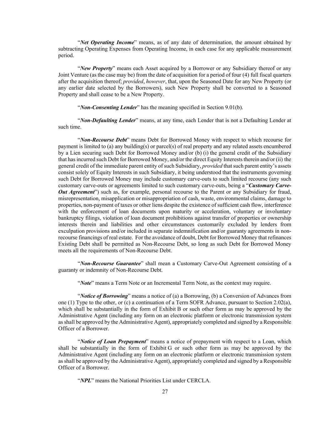 27 “Net Operating Income” means, as of any date of determination, the amount obtained by subtracting Operating Expenses from Operating Income, in each case for any applicable measurement period. “New Property” means each Asset acquired by a Borrower or any Subsidiary thereof or any Joint Venture (as the case may be) from the date of acquisition for a period of four (4) full fiscal quarters after the acquisition thereof; provided, however, that, upon the Seasoned Date for any New Property (or any earlier date selected by the Borrowers), such New Property shall be converted to a Seasoned Property and shall cease to be a New Property. “Non-Consenting Lender” has the meaning specified in Section 9.01(b). “Non-Defaulting Lender” means, at any time, each Lender that is not a Defaulting Lender at such time. “Non-Recourse Debt” means Debt for Borrowed Money with respect to which recourse for payment is limited to (a) any building(s) or parcel(s) of real property and any related assets encumbered by a Lien securing such Debt for Borrowed Money and/or (b) (i) the general credit of the Subsidiary that has incurred such Debt for Borrowed Money, and/or the direct Equity Interests therein and/or (ii) the general credit of the immediate parent entity of such Subsidiary, provided that such parent entity’s assets consist solely of Equity Interests in such Subsidiary, it being understood that the instruments governing such Debt for Borrowed Money may include customary carve-outs to such limited recourse (any such customary carve-outs or agreements limited to such customary carve-outs, being a “Customary Carve- Out Agreement”) such as, for example, personal recourse to the Parent or any Subsidiary for fraud, misrepresentation, misapplication or misappropriation of cash, waste, environmental claims, damage to properties, non-payment of taxes or other liens despite the existence of sufficient cash flow, interference with the enforcement of loan documents upon maturity or acceleration, voluntary or involuntary bankruptcy filings, violation of loan document prohibitions against transfer of properties or ownership interests therein and liabilities and other circumstances customarily excluded by lenders from exculpation provisions and/or included in separate indemnification and/or guaranty agreements in non- recourse financings of real estate. For the avoidance of doubt, Debt for Borrowed Money that refinances Existing Debt shall be permitted as Non-Recourse Debt, so long as such Debt for Borrowed Money meets all the requirements of Non-Recourse Debt. “Non-Recourse Guarantee” shall mean a Customary Carve-Out Agreement consisting of a guaranty or indemnity of Non-Recourse Debt. “Note” means a Term Note or an Incremental Term Note, as the context may require. “Notice of Borrowing” means a notice of (a) a Borrowing, (b) a Conversion of Advances from one (1) Type to the other, or (c) a continuation of a Term SOFR Advance, pursuant to Section 2.02(a), which shall be substantially in the form of Exhibit B or such other form as may be approved by the Administrative Agent (including any form on an electronic platform or electronic transmission system as shall be approved by the Administrative Agent), appropriately completed and signed by a Responsible Officer of a Borrower. “Notice of Loan Prepayment” means a notice of prepayment with respect to a Loan, which shall be substantially in the form of Exhibit G or such other form as may be approved by the Administrative Agent (including any form on an electronic platform or electronic transmission system as shall be approved by the Administrative Agent), appropriately completed and signed by a Responsible Officer of a Borrower. “NPL” means the National Priorities List under CERCLA.