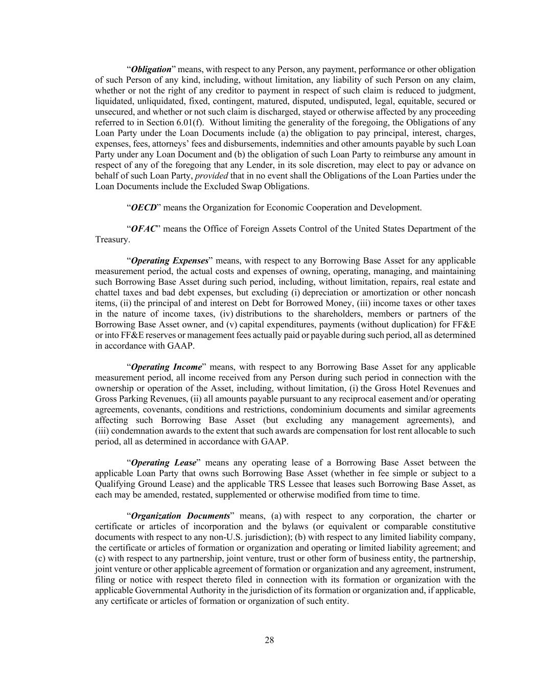 28 “Obligation” means, with respect to any Person, any payment, performance or other obligation of such Person of any kind, including, without limitation, any liability of such Person on any claim, whether or not the right of any creditor to payment in respect of such claim is reduced to judgment, liquidated, unliquidated, fixed, contingent, matured, disputed, undisputed, legal, equitable, secured or unsecured, and whether or not such claim is discharged, stayed or otherwise affected by any proceeding referred to in Section 6.01(f). Without limiting the generality of the foregoing, the Obligations of any Loan Party under the Loan Documents include (a) the obligation to pay principal, interest, charges, expenses, fees, attorneys’ fees and disbursements, indemnities and other amounts payable by such Loan Party under any Loan Document and (b) the obligation of such Loan Party to reimburse any amount in respect of any of the foregoing that any Lender, in its sole discretion, may elect to pay or advance on behalf of such Loan Party, provided that in no event shall the Obligations of the Loan Parties under the Loan Documents include the Excluded Swap Obligations. “OECD” means the Organization for Economic Cooperation and Development. “OFAC” means the Office of Foreign Assets Control of the United States Department of the Treasury. “Operating Expenses” means, with respect to any Borrowing Base Asset for any applicable measurement period, the actual costs and expenses of owning, operating, managing, and maintaining such Borrowing Base Asset during such period, including, without limitation, repairs, real estate and chattel taxes and bad debt expenses, but excluding (i) depreciation or amortization or other noncash items, (ii) the principal of and interest on Debt for Borrowed Money, (iii) income taxes or other taxes in the nature of income taxes, (iv) distributions to the shareholders, members or partners of the Borrowing Base Asset owner, and (v) capital expenditures, payments (without duplication) for FF&E or into FF&E reserves or management fees actually paid or payable during such period, all as determined in accordance with GAAP. “Operating Income” means, with respect to any Borrowing Base Asset for any applicable measurement period, all income received from any Person during such period in connection with the ownership or operation of the Asset, including, without limitation, (i) the Gross Hotel Revenues and Gross Parking Revenues, (ii) all amounts payable pursuant to any reciprocal easement and/or operating agreements, covenants, conditions and restrictions, condominium documents and similar agreements affecting such Borrowing Base Asset (but excluding any management agreements), and (iii) condemnation awards to the extent that such awards are compensation for lost rent allocable to such period, all as determined in accordance with GAAP. “Operating Lease” means any operating lease of a Borrowing Base Asset between the applicable Loan Party that owns such Borrowing Base Asset (whether in fee simple or subject to a Qualifying Ground Lease) and the applicable TRS Lessee that leases such Borrowing Base Asset, as each may be amended, restated, supplemented or otherwise modified from time to time. “Organization Documents” means, (a) with respect to any corporation, the charter or certificate or articles of incorporation and the bylaws (or equivalent or comparable constitutive documents with respect to any non-U.S. jurisdiction); (b) with respect to any limited liability company, the certificate or articles of formation or organization and operating or limited liability agreement; and (c) with respect to any partnership, joint venture, trust or other form of business entity, the partnership, joint venture or other applicable agreement of formation or organization and any agreement, instrument, filing or notice with respect thereto filed in connection with its formation or organization with the applicable Governmental Authority in the jurisdiction of its formation or organization and, if applicable, any certificate or articles of formation or organization of such entity.