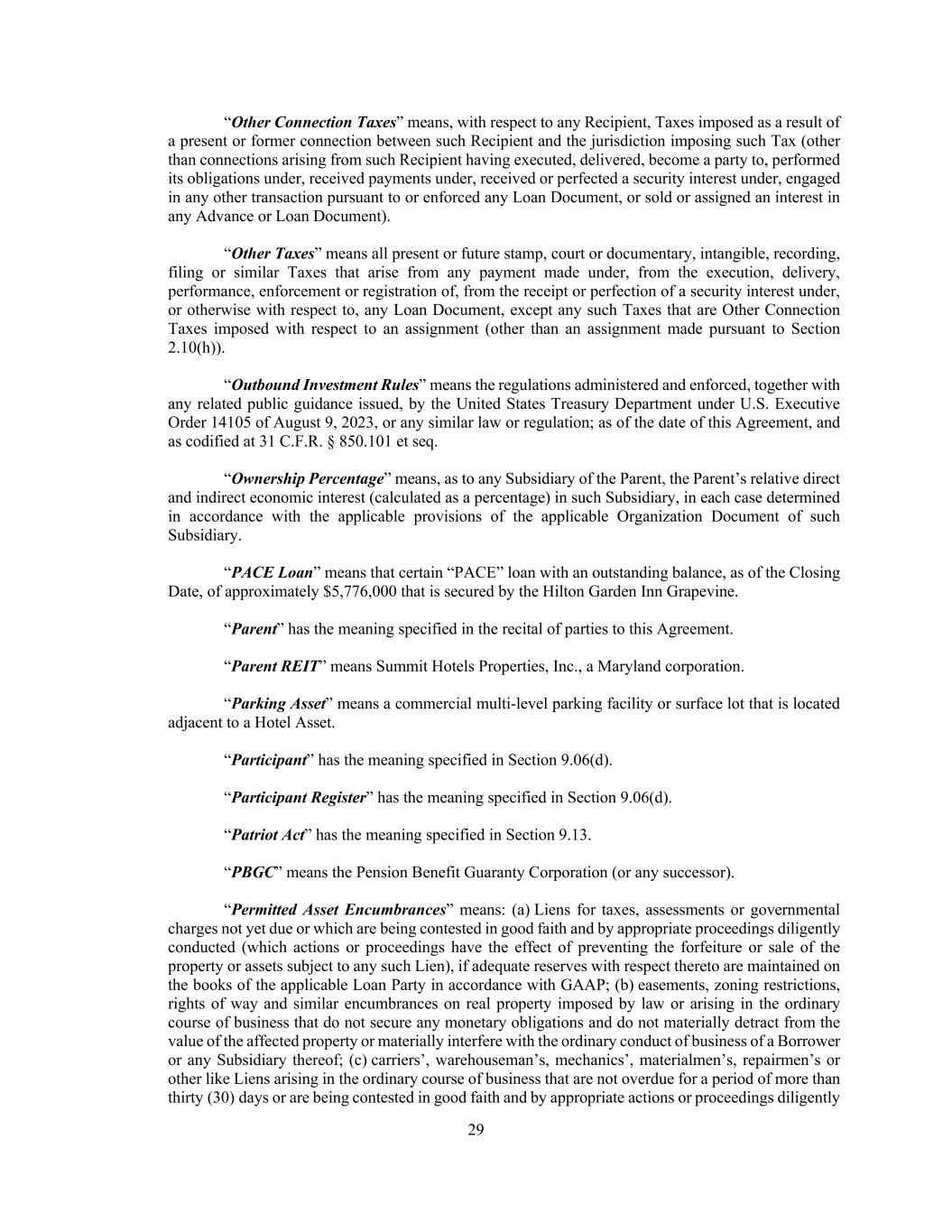 29 “Other Connection Taxes” means, with respect to any Recipient, Taxes imposed as a result of a present or former connection between such Recipient and the jurisdiction imposing such Tax (other than connections arising from such Recipient having executed, delivered, become a party to, performed its obligations under, received payments under, received or perfected a security interest under, engaged in any other transaction pursuant to or enforced any Loan Document, or sold or assigned an interest in any Advance or Loan Document). “Other Taxes” means all present or future stamp, court or documentary, intangible, recording, filing or similar Taxes that arise from any payment made under, from the execution, delivery, performance, enforcement or registration of, from the receipt or perfection of a security interest under, or otherwise with respect to, any Loan Document, except any such Taxes that are Other Connection Taxes imposed with respect to an assignment (other than an assignment made pursuant to Section 2.10(h)). “Outbound Investment Rules” means the regulations administered and enforced, together with any related public guidance issued, by the United States Treasury Department under U.S. Executive Order 14105 of August 9, 2023, or any similar law or regulation; as of the date of this Agreement, and as codified at 31 C.F.R. § 850.101 et seq. “Ownership Percentage” means, as to any Subsidiary of the Parent, the Parent’s relative direct and indirect economic interest (calculated as a percentage) in such Subsidiary, in each case determined in accordance with the applicable provisions of the applicable Organization Document of such Subsidiary. “PACE Loan” means that certain “PACE” loan with an outstanding balance, as of the Closing Date, of approximately $5,776,000 that is secured by the Hilton Garden Inn Grapevine. “Parent” has the meaning specified in the recital of parties to this Agreement. “Parent REIT” means Summit Hotels Properties, Inc., a Maryland corporation. “Parking Asset” means a commercial multi-level parking facility or surface lot that is located adjacent to a Hotel Asset. “Participant” has the meaning specified in Section 9.06(d). “Participant Register” has the meaning specified in Section 9.06(d). “Patriot Act” has the meaning specified in Section 9.13. “PBGC” means the Pension Benefit Guaranty Corporation (or any successor). “Permitted Asset Encumbrances” means: (a) Liens for taxes, assessments or governmental charges not yet due or which are being contested in good faith and by appropriate proceedings diligently conducted (which actions or proceedings have the effect of preventing the forfeiture or sale of the property or assets subject to any such Lien), if adequate reserves with respect thereto are maintained on the books of the applicable Loan Party in accordance with GAAP; (b) easements, zoning restrictions, rights of way and similar encumbrances on real property imposed by law or arising in the ordinary course of business that do not secure any monetary obligations and do not materially detract from the value of the affected property or materially interfere with the ordinary conduct of business of a Borrower or any Subsidiary thereof; (c) carriers’, warehouseman’s, mechanics’, materialmen’s, repairmen’s or other like Liens arising in the ordinary course of business that are not overdue for a period of more than thirty (30) days or are being contested in good faith and by appropriate actions or proceedings diligently