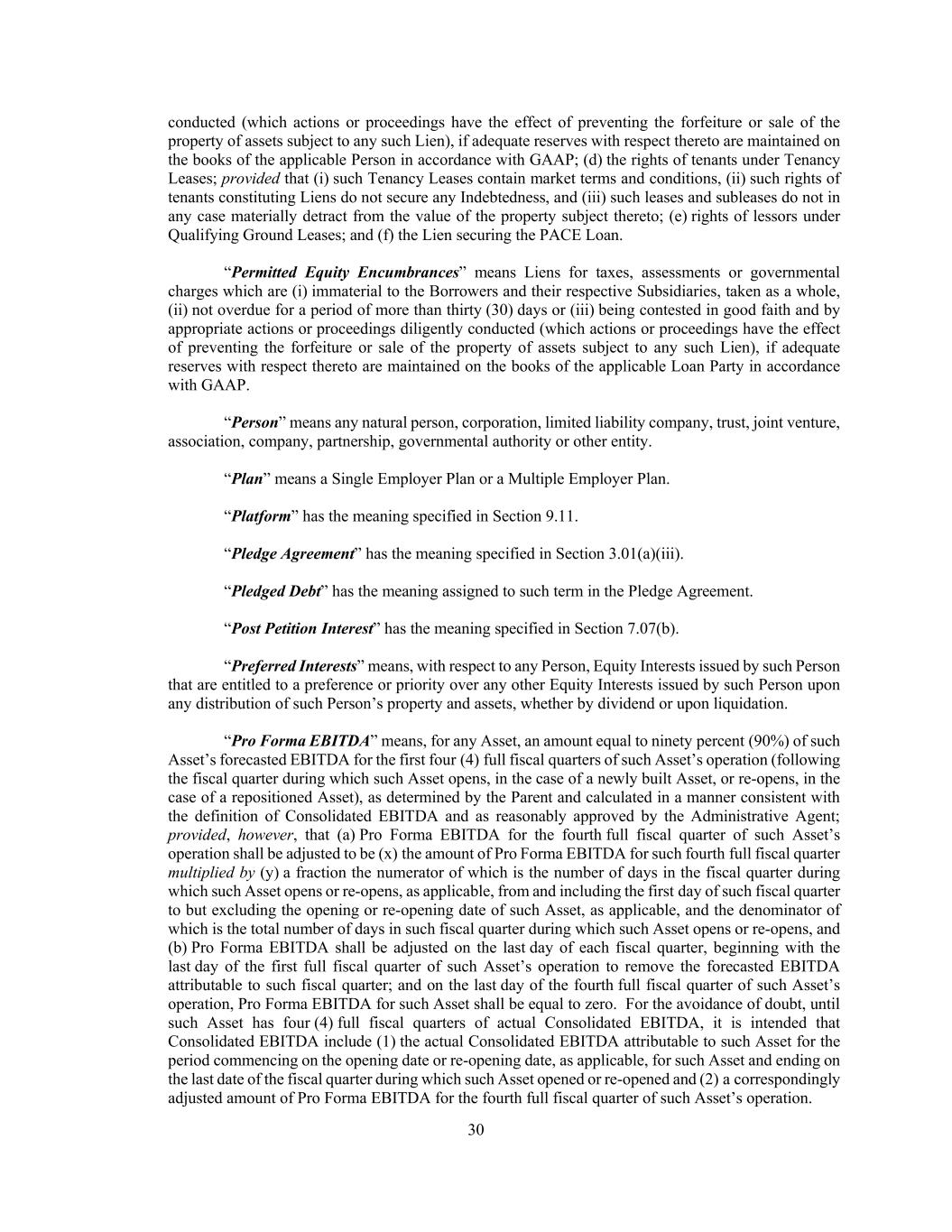 30 conducted (which actions or proceedings have the effect of preventing the forfeiture or sale of the property of assets subject to any such Lien), if adequate reserves with respect thereto are maintained on the books of the applicable Person in accordance with GAAP; (d) the rights of tenants under Tenancy Leases; provided that (i) such Tenancy Leases contain market terms and conditions, (ii) such rights of tenants constituting Liens do not secure any Indebtedness, and (iii) such leases and subleases do not in any case materially detract from the value of the property subject thereto; (e) rights of lessors under Qualifying Ground Leases; and (f) the Lien securing the PACE Loan. “Permitted Equity Encumbrances” means Liens for taxes, assessments or governmental charges which are (i) immaterial to the Borrowers and their respective Subsidiaries, taken as a whole, (ii) not overdue for a period of more than thirty (30) days or (iii) being contested in good faith and by appropriate actions or proceedings diligently conducted (which actions or proceedings have the effect of preventing the forfeiture or sale of the property of assets subject to any such Lien), if adequate reserves with respect thereto are maintained on the books of the applicable Loan Party in accordance with GAAP. “Person” means any natural person, corporation, limited liability company, trust, joint venture, association, company, partnership, governmental authority or other entity. “Plan” means a Single Employer Plan or a Multiple Employer Plan. “Platform” has the meaning specified in Section 9.11. “Pledge Agreement” has the meaning specified in Section 3.01(a)(iii). “Pledged Debt” has the meaning assigned to such term in the Pledge Agreement. “Post Petition Interest” has the meaning specified in Section 7.07(b). “Preferred Interests” means, with respect to any Person, Equity Interests issued by such Person that are entitled to a preference or priority over any other Equity Interests issued by such Person upon any distribution of such Person’s property and assets, whether by dividend or upon liquidation. “Pro Forma EBITDA” means, for any Asset, an amount equal to ninety percent (90%) of such Asset’s forecasted EBITDA for the first four (4) full fiscal quarters of such Asset’s operation (following the fiscal quarter during which such Asset opens, in the case of a newly built Asset, or re-opens, in the case of a repositioned Asset), as determined by the Parent and calculated in a manner consistent with the definition of Consolidated EBITDA and as reasonably approved by the Administrative Agent; provided, however, that (a) Pro Forma EBITDA for the fourth full fiscal quarter of such Asset’s operation shall be adjusted to be (x) the amount of Pro Forma EBITDA for such fourth full fiscal quarter multiplied by (y) a fraction the numerator of which is the number of days in the fiscal quarter during which such Asset opens or re-opens, as applicable, from and including the first day of such fiscal quarter to but excluding the opening or re-opening date of such Asset, as applicable, and the denominator of which is the total number of days in such fiscal quarter during which such Asset opens or re-opens, and (b) Pro Forma EBITDA shall be adjusted on the last day of each fiscal quarter, beginning with the last day of the first full fiscal quarter of such Asset’s operation to remove the forecasted EBITDA attributable to such fiscal quarter; and on the last day of the fourth full fiscal quarter of such Asset’s operation, Pro Forma EBITDA for such Asset shall be equal to zero. For the avoidance of doubt, until such Asset has four (4) full fiscal quarters of actual Consolidated EBITDA, it is intended that Consolidated EBITDA include (1) the actual Consolidated EBITDA attributable to such Asset for the period commencing on the opening date or re-opening date, as applicable, for such Asset and ending on the last date of the fiscal quarter during which such Asset opened or re-opened and (2) a correspondingly adjusted amount of Pro Forma EBITDA for the fourth full fiscal quarter of such Asset’s operation.