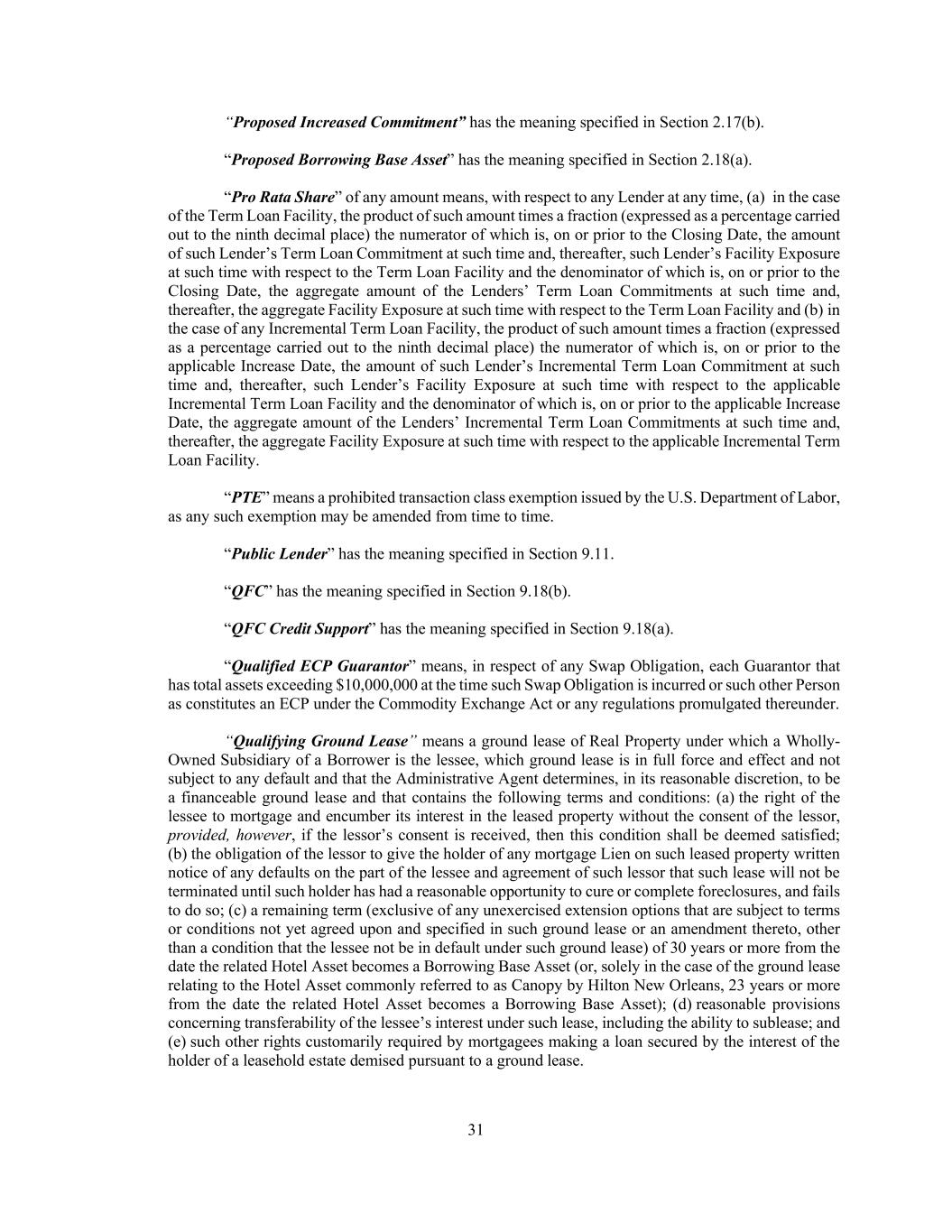 31 “Proposed Increased Commitment” has the meaning specified in Section 2.17(b). “Proposed Borrowing Base Asset” has the meaning specified in Section 2.18(a). “Pro Rata Share” of any amount means, with respect to any Lender at any time, (a) in the case of the Term Loan Facility, the product of such amount times a fraction (expressed as a percentage carried out to the ninth decimal place) the numerator of which is, on or prior to the Closing Date, the amount of such Lender’s Term Loan Commitment at such time and, thereafter, such Lender’s Facility Exposure at such time with respect to the Term Loan Facility and the denominator of which is, on or prior to the Closing Date, the aggregate amount of the Lenders’ Term Loan Commitments at such time and, thereafter, the aggregate Facility Exposure at such time with respect to the Term Loan Facility and (b) in the case of any Incremental Term Loan Facility, the product of such amount times a fraction (expressed as a percentage carried out to the ninth decimal place) the numerator of which is, on or prior to the applicable Increase Date, the amount of such Lender’s Incremental Term Loan Commitment at such time and, thereafter, such Lender’s Facility Exposure at such time with respect to the applicable Incremental Term Loan Facility and the denominator of which is, on or prior to the applicable Increase Date, the aggregate amount of the Lenders’ Incremental Term Loan Commitments at such time and, thereafter, the aggregate Facility Exposure at such time with respect to the applicable Incremental Term Loan Facility. “PTE” means a prohibited transaction class exemption issued by the U.S. Department of Labor, as any such exemption may be amended from time to time. “Public Lender” has the meaning specified in Section 9.11. “QFC” has the meaning specified in Section 9.18(b). “QFC Credit Support” has the meaning specified in Section 9.18(a). “Qualified ECP Guarantor” means, in respect of any Swap Obligation, each Guarantor that has total assets exceeding $10,000,000 at the time such Swap Obligation is incurred or such other Person as constitutes an ECP under the Commodity Exchange Act or any regulations promulgated thereunder. “Qualifying Ground Lease” means a ground lease of Real Property under which a Wholly- Owned Subsidiary of a Borrower is the lessee, which ground lease is in full force and effect and not subject to any default and that the Administrative Agent determines, in its reasonable discretion, to be a financeable ground lease and that contains the following terms and conditions: (a) the right of the lessee to mortgage and encumber its interest in the leased property without the consent of the lessor, provided, however, if the lessor’s consent is received, then this condition shall be deemed satisfied; (b) the obligation of the lessor to give the holder of any mortgage Lien on such leased property written notice of any defaults on the part of the lessee and agreement of such lessor that such lease will not be terminated until such holder has had a reasonable opportunity to cure or complete foreclosures, and fails to do so; (c) a remaining term (exclusive of any unexercised extension options that are subject to terms or conditions not yet agreed upon and specified in such ground lease or an amendment thereto, other than a condition that the lessee not be in default under such ground lease) of 30 years or more from the date the related Hotel Asset becomes a Borrowing Base Asset (or, solely in the case of the ground lease relating to the Hotel Asset commonly referred to as Canopy by Hilton New Orleans, 23 years or more from the date the related Hotel Asset becomes a Borrowing Base Asset); (d) reasonable provisions concerning transferability of the lessee’s interest under such lease, including the ability to sublease; and (e) such other rights customarily required by mortgagees making a loan secured by the interest of the holder of a leasehold estate demised pursuant to a ground lease.